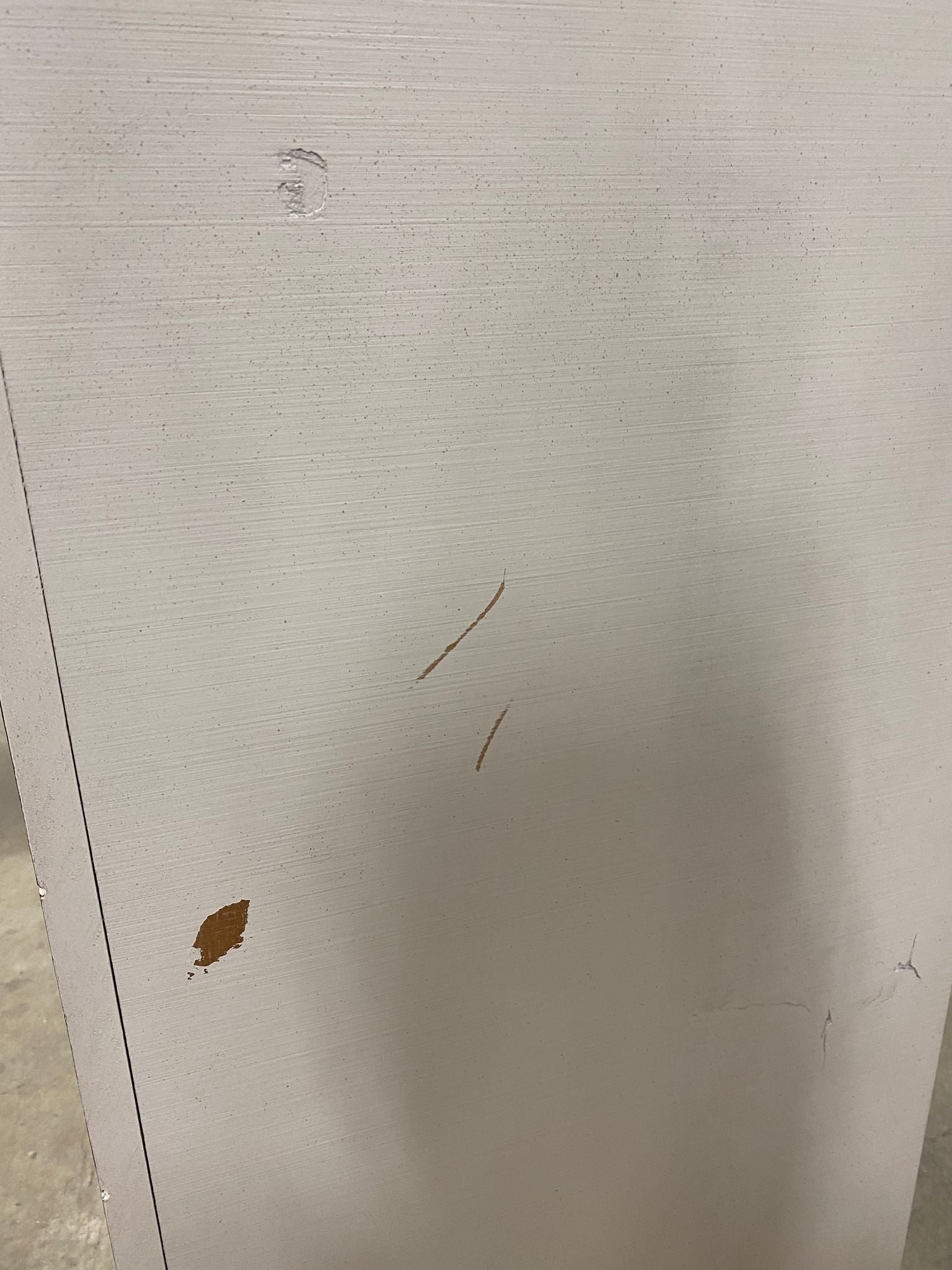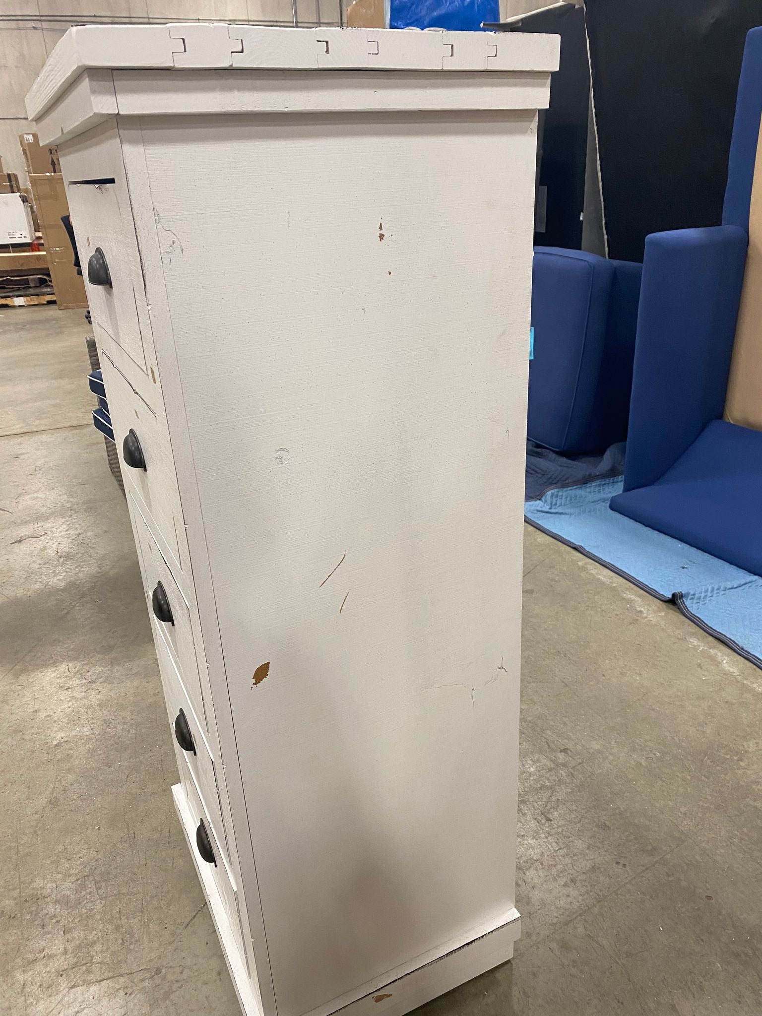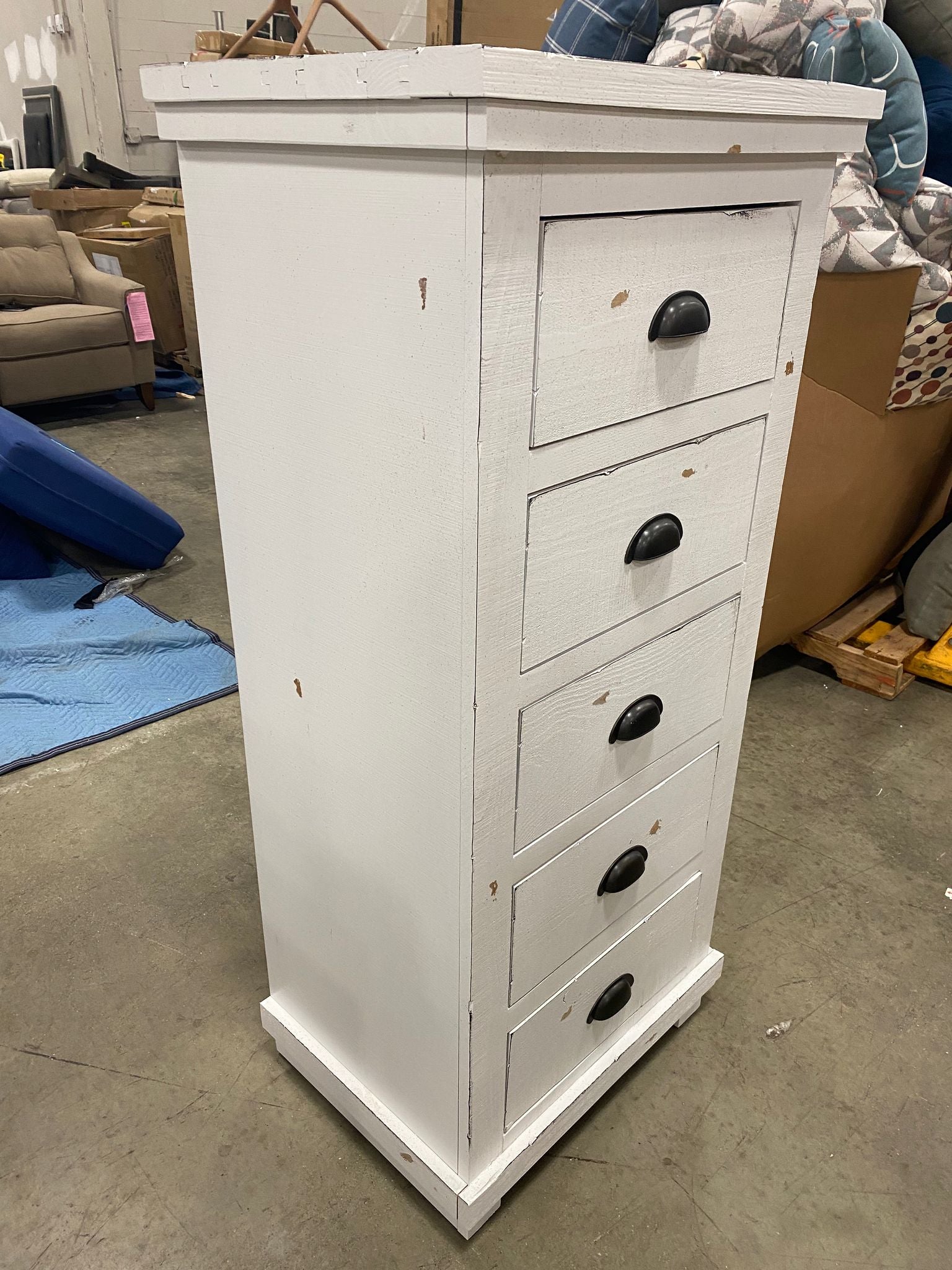 Out of the box, The color is distressed white, Item has some scratches on right side panel of chest. Please Note that this item has and intentional distressed finish. Item in otherwise good condition.