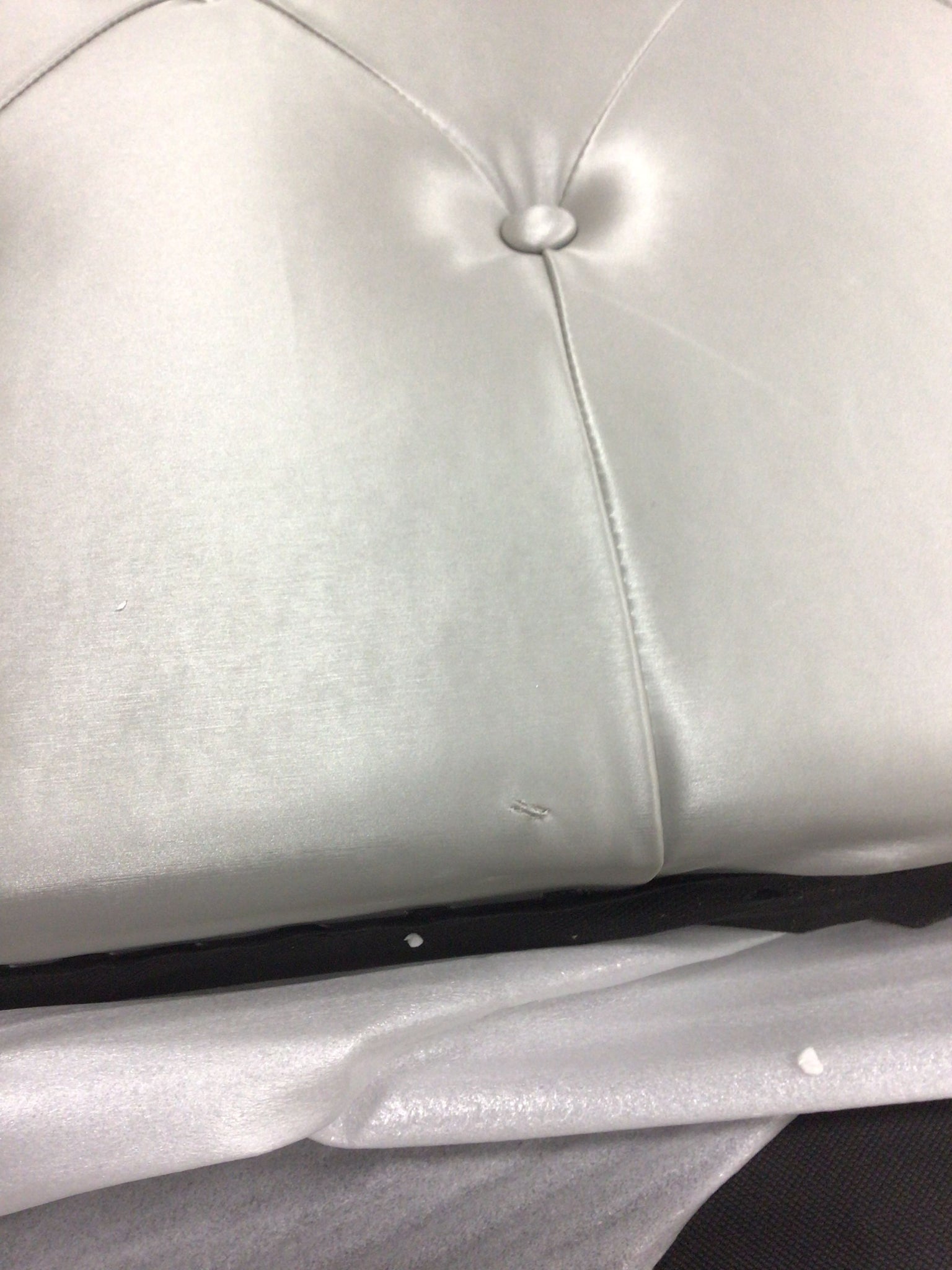 Open box, The color is silver faux leather, Size: queen, hardware included but not in original packaging. Slight cuts in faux leather on back board and side rail. See photos