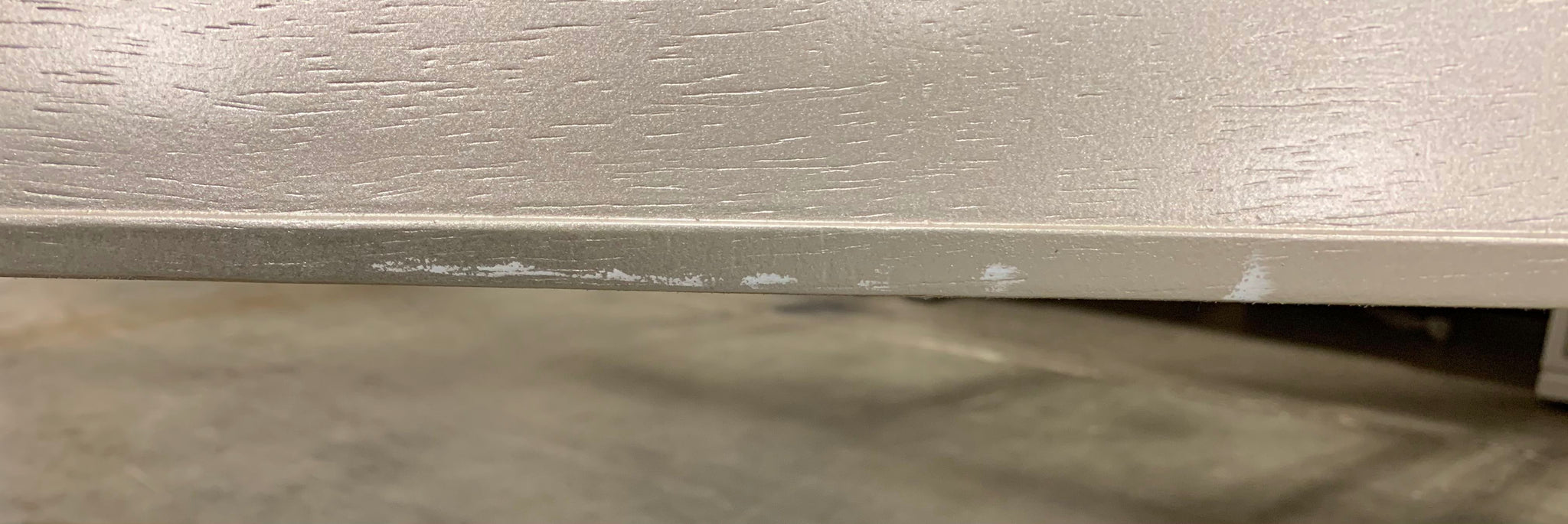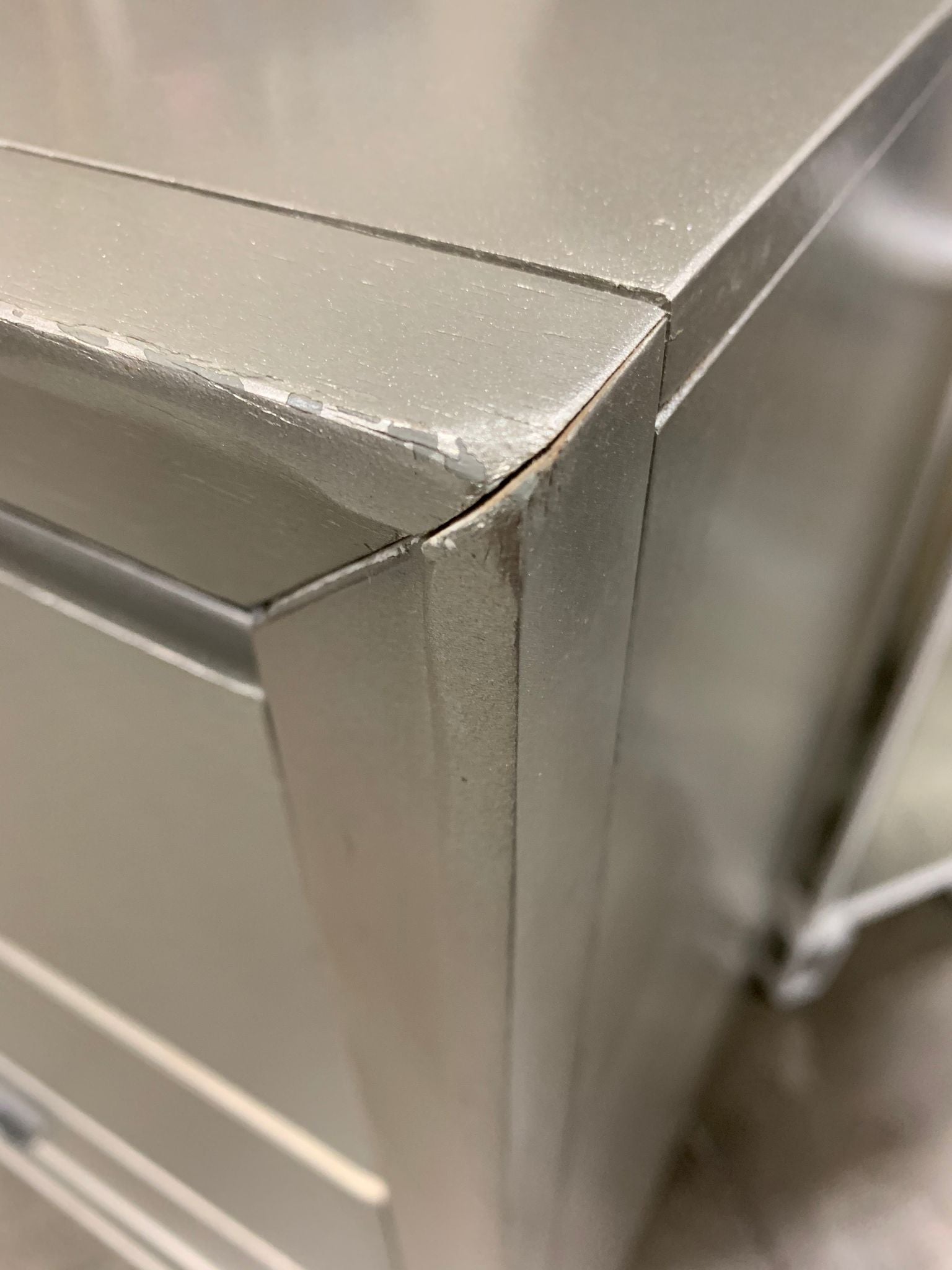 Out of box, this item is out of box and there are minimal scuffs/scratches. photos of damage included. item also sells on other website with a mirror, but this item is the dresser ONLY.
