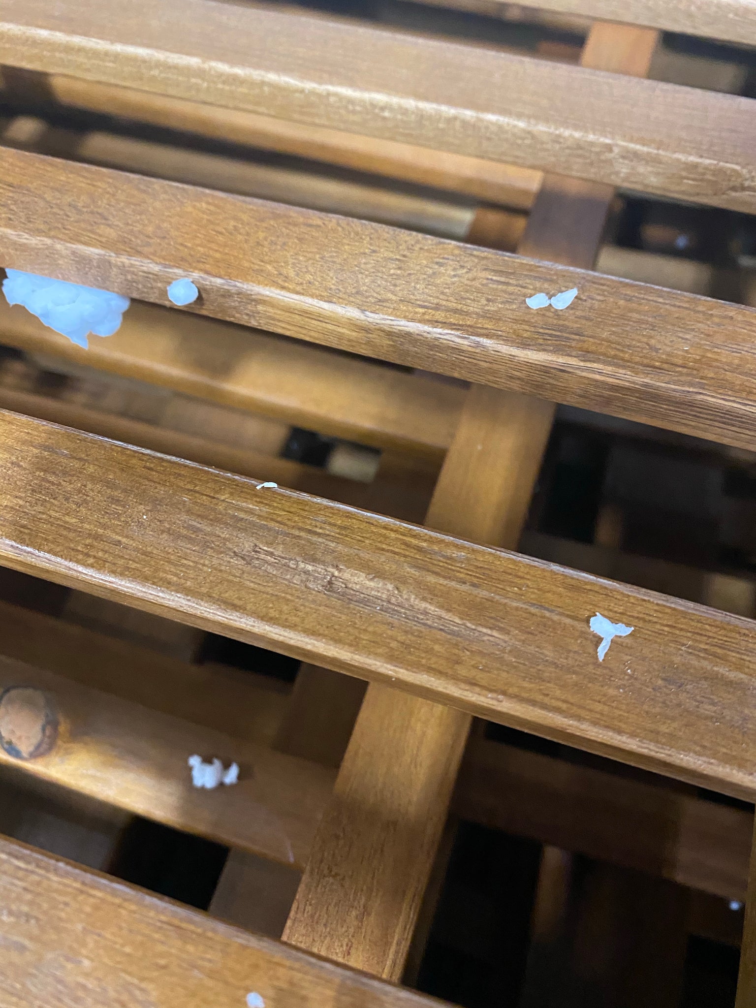 Wood might have some flaws, hardware is loose and might missing some.