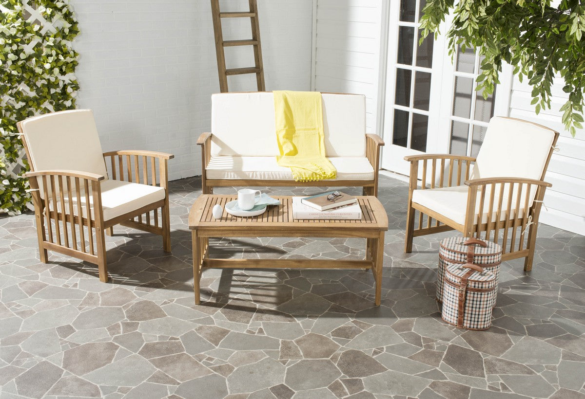 Includes a bench, a coffee table, two side chairs, and cushions