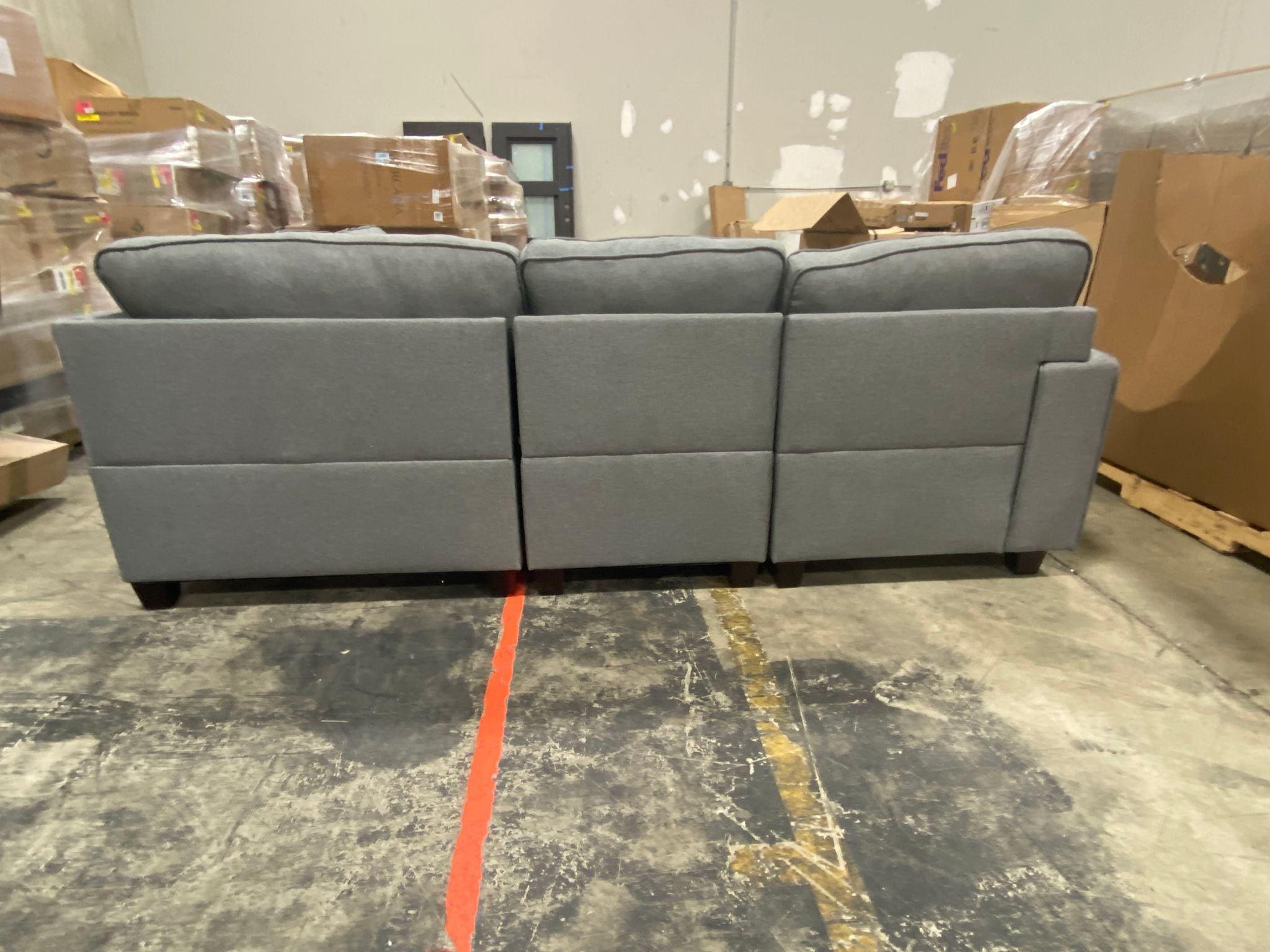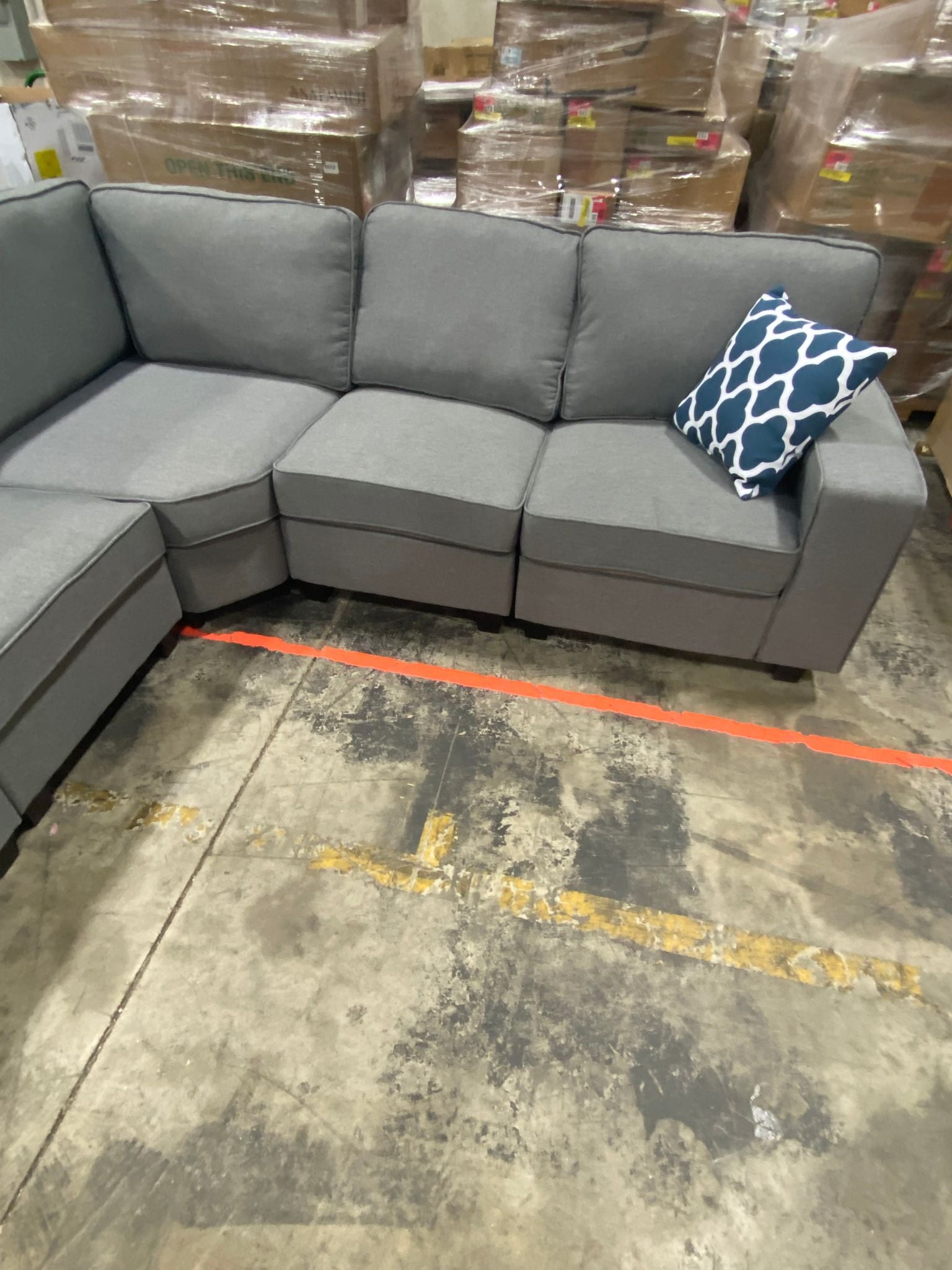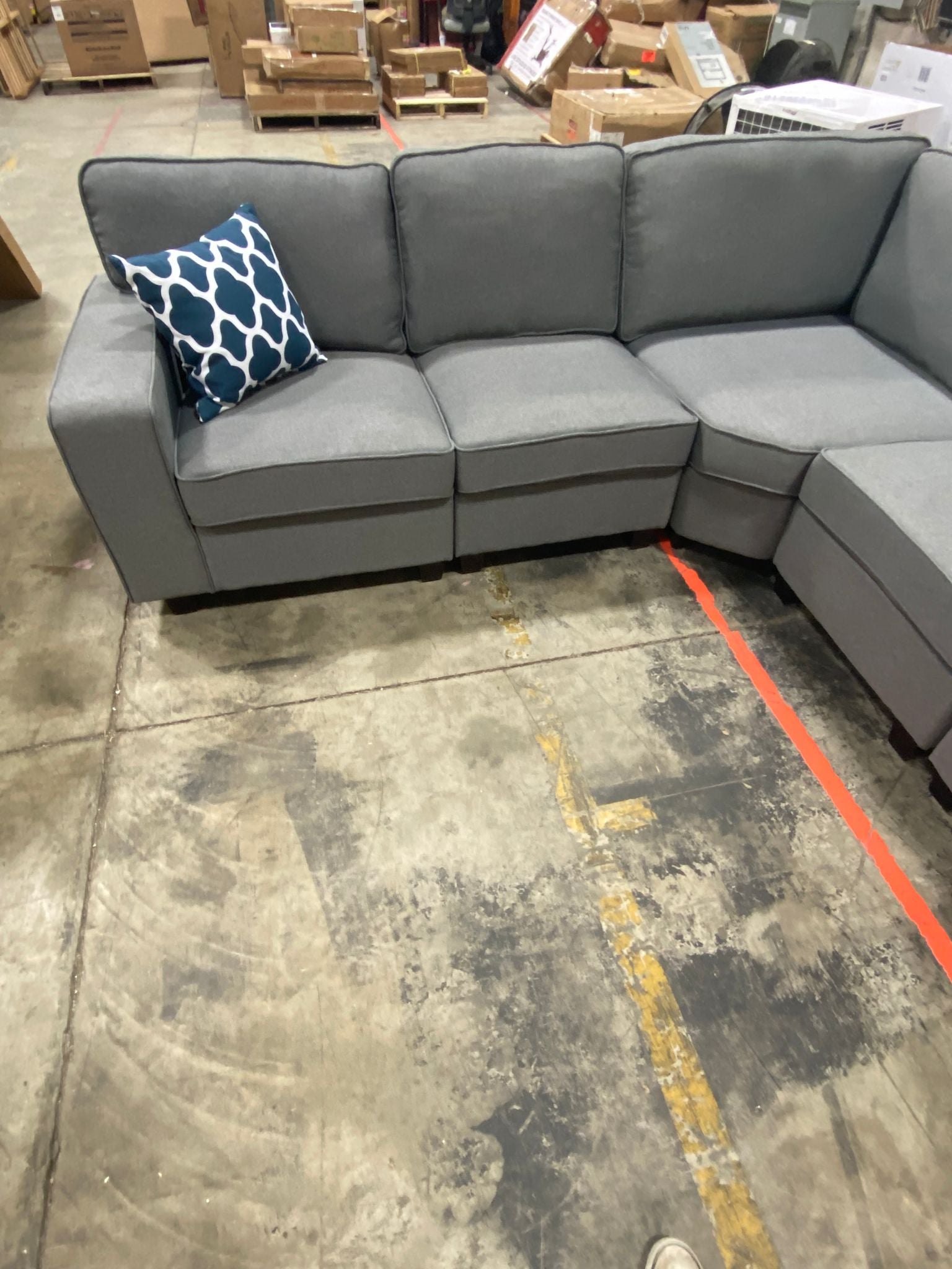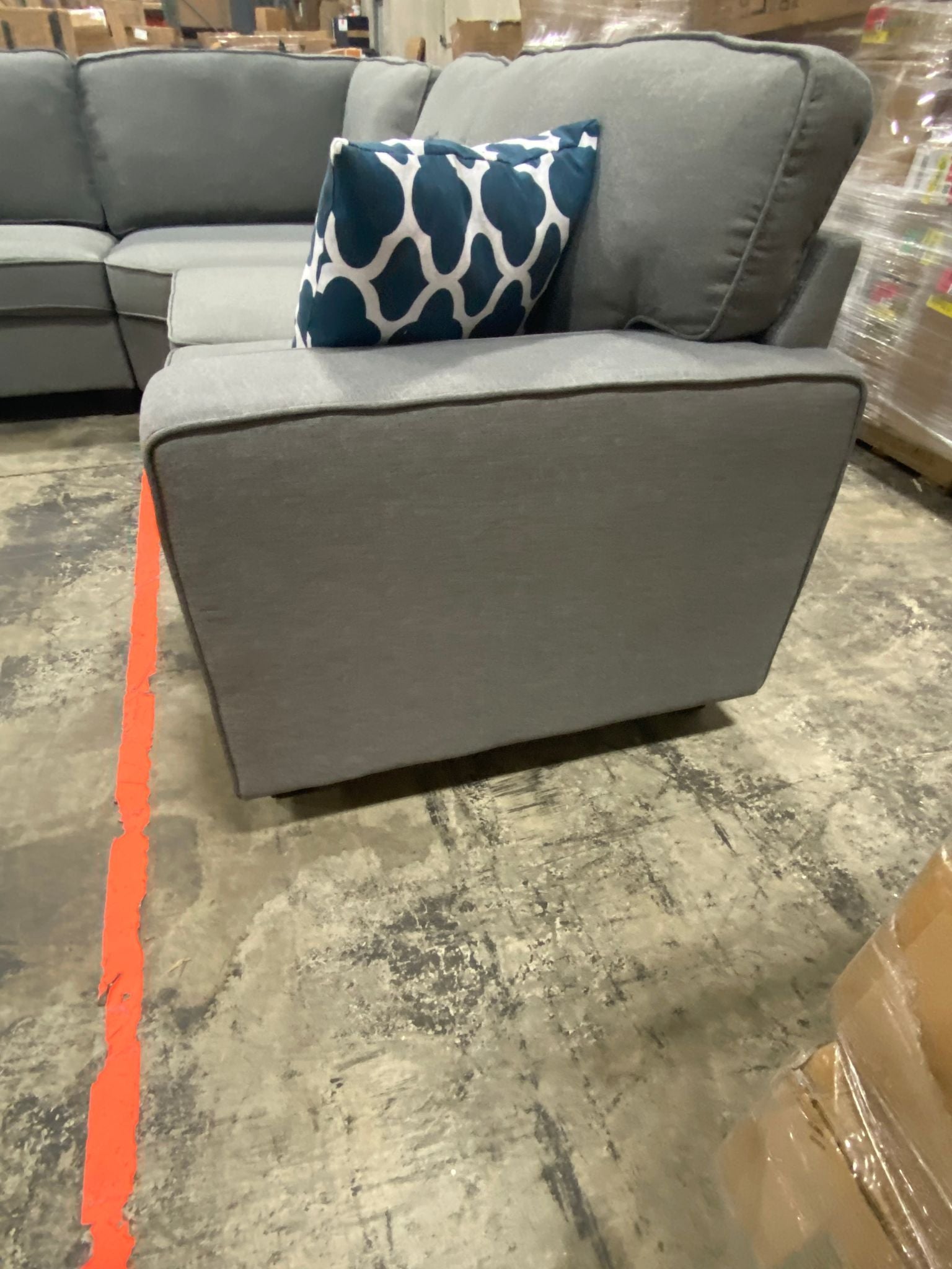 Out of box , The color is blue gray, AS IS Condition: Sectional missing chaise piece, 2 armless pieces, and ottoman from the original 8pc configuration. Remaining pieces include 2 corner pieces, 2 armless chairs, 1 left arm chair, and 1 right arm chair. Sectional can be configured a few different ways to fit your space. 1 back cushion has slight imperfection in the fabric. See photos.