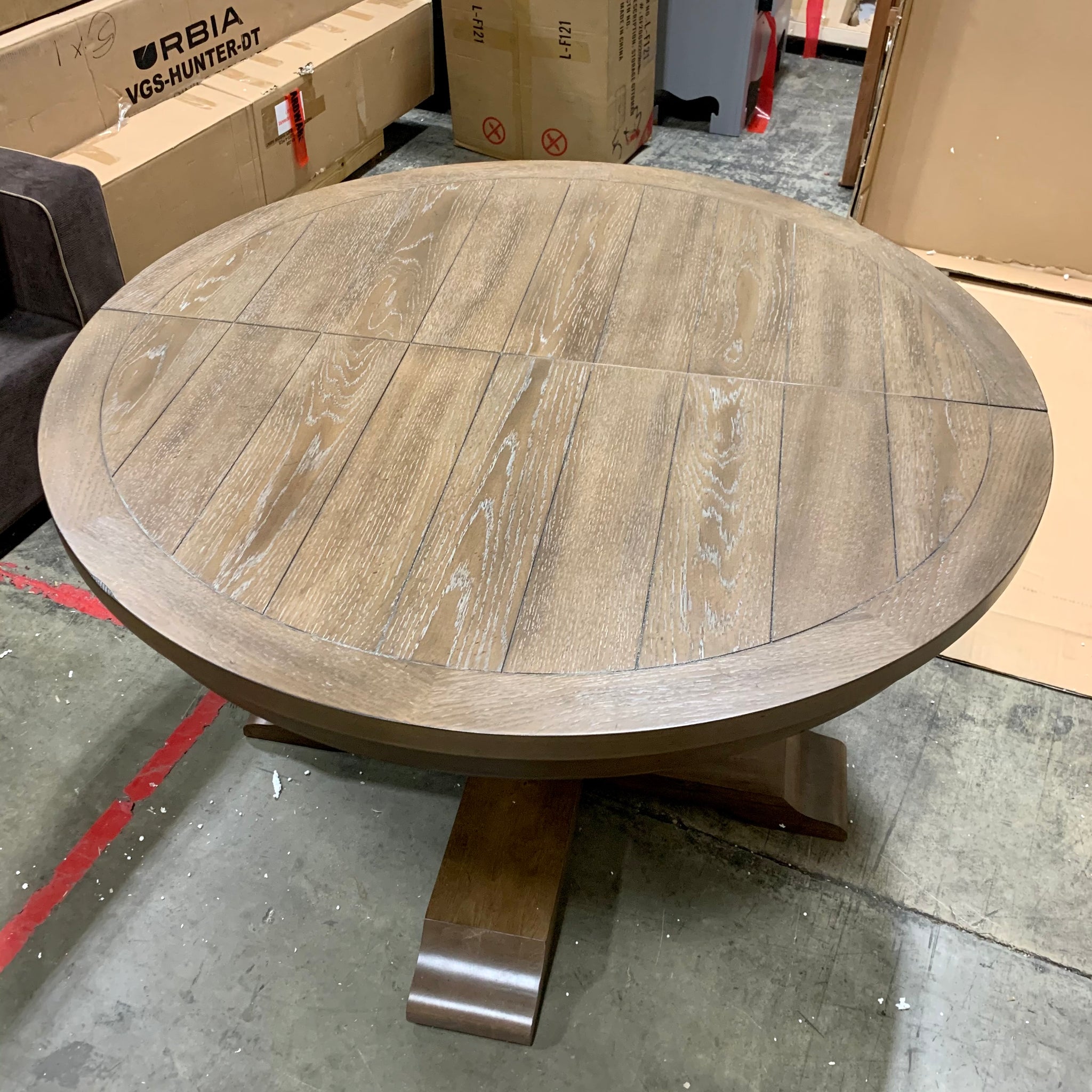 Item is fully assembled and crafted with wood in a limed gray finish. Item appears to be in like new condition.