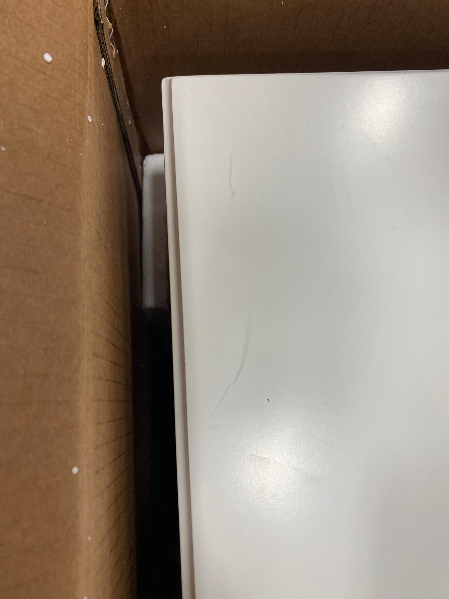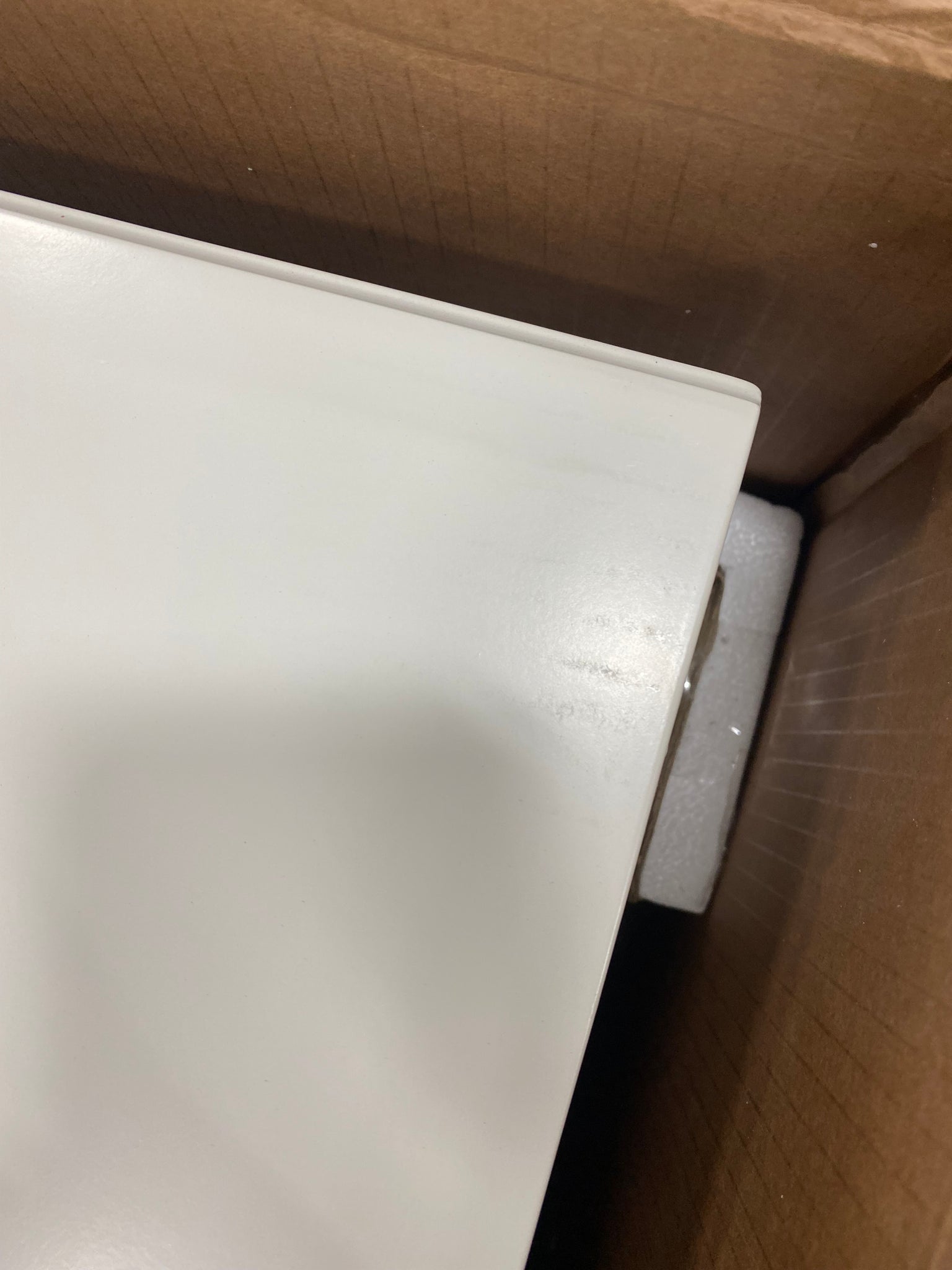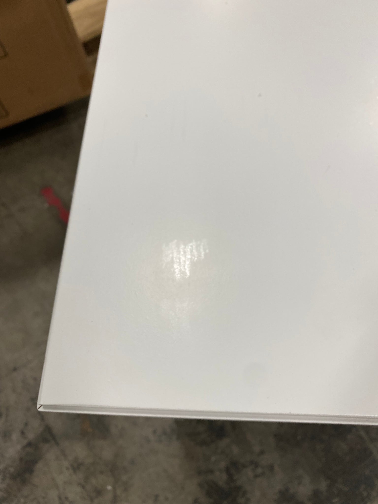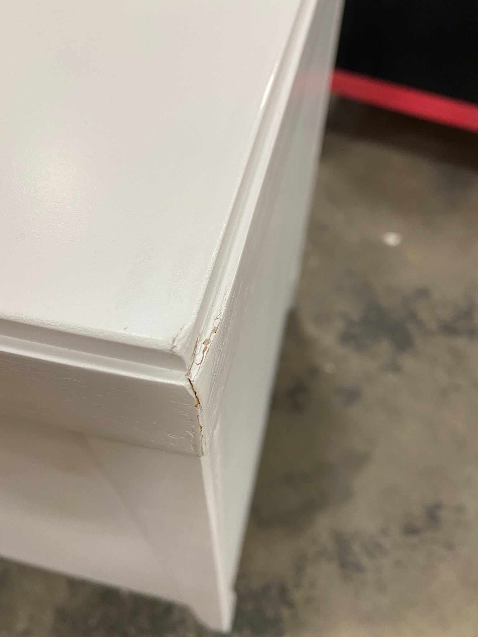 Open Box, The color is white, Please Note: Minor dings on nightstand top. See photo. Missing the screws to attach 2 drawer knobs. Drawer knobs are located in top drawer.