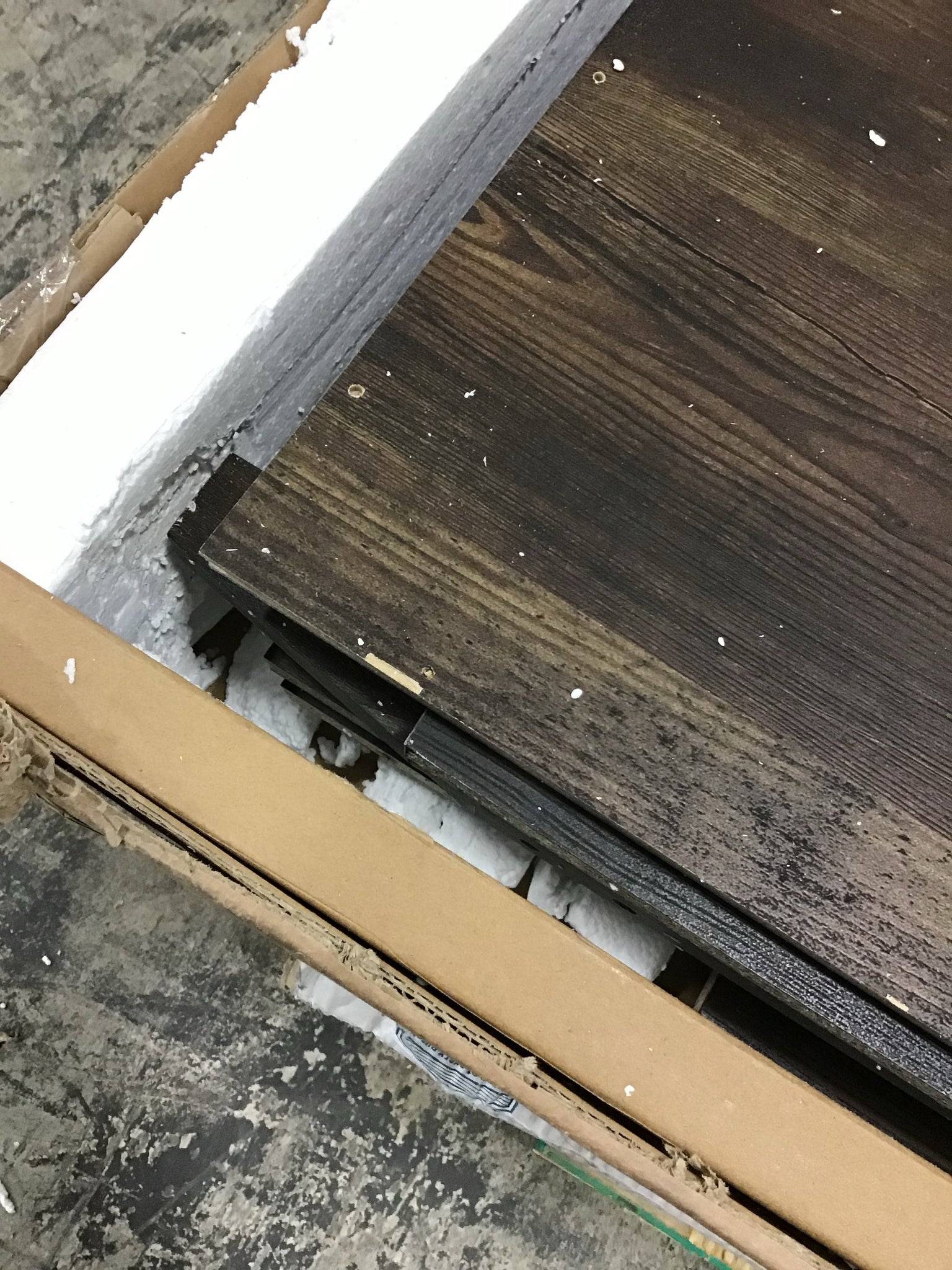 Open Box, The color is rustic brown, Slight chip on one piece of wood. See photo.