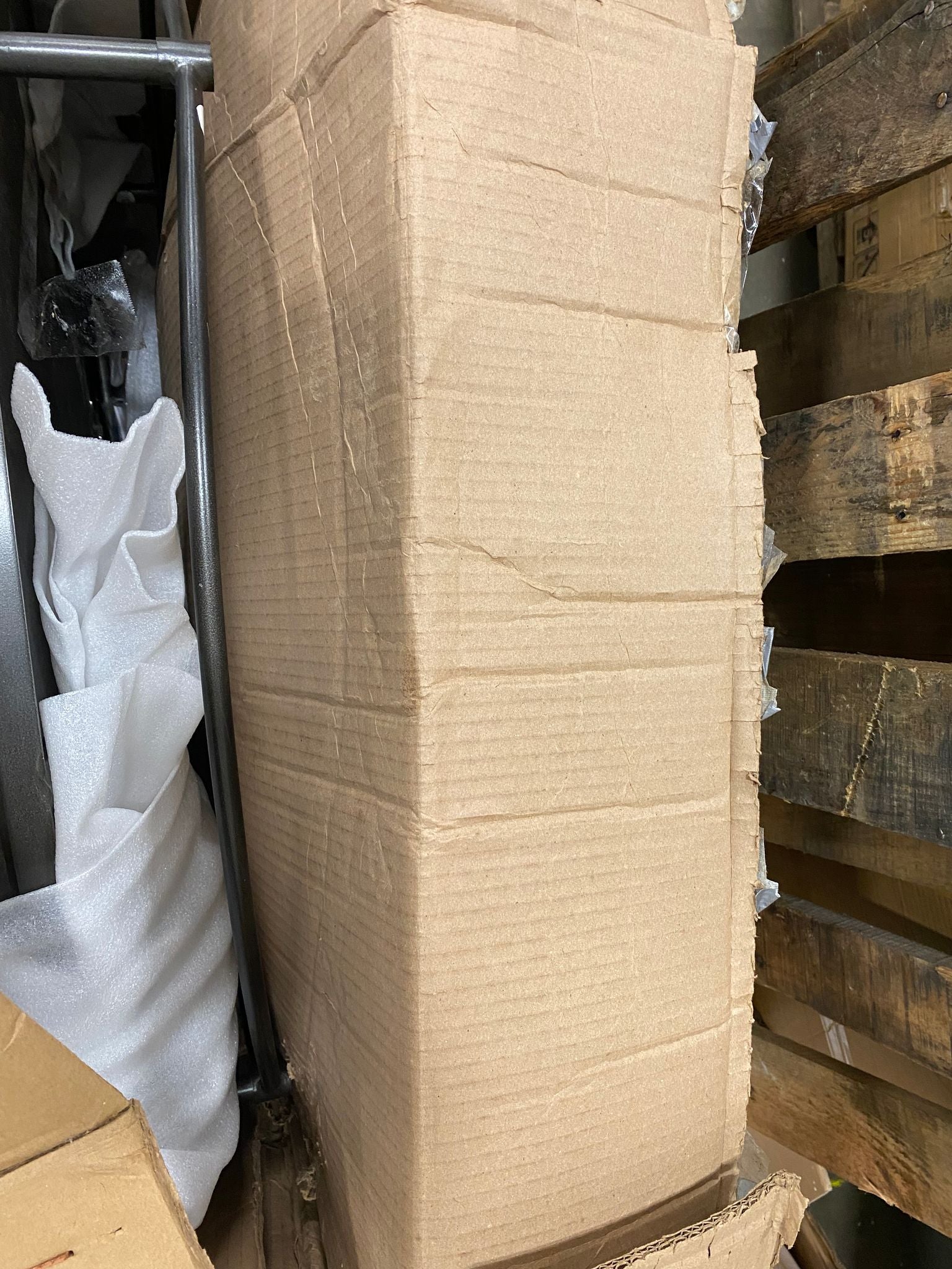 Open box, AS IS Condition: Metal bar under table top bent upward in some areas. Metal legs have scuffing/marks on them due loose shipment. See photos. Maybe missing some screws due to previous opening. Item in otherwise good condition.