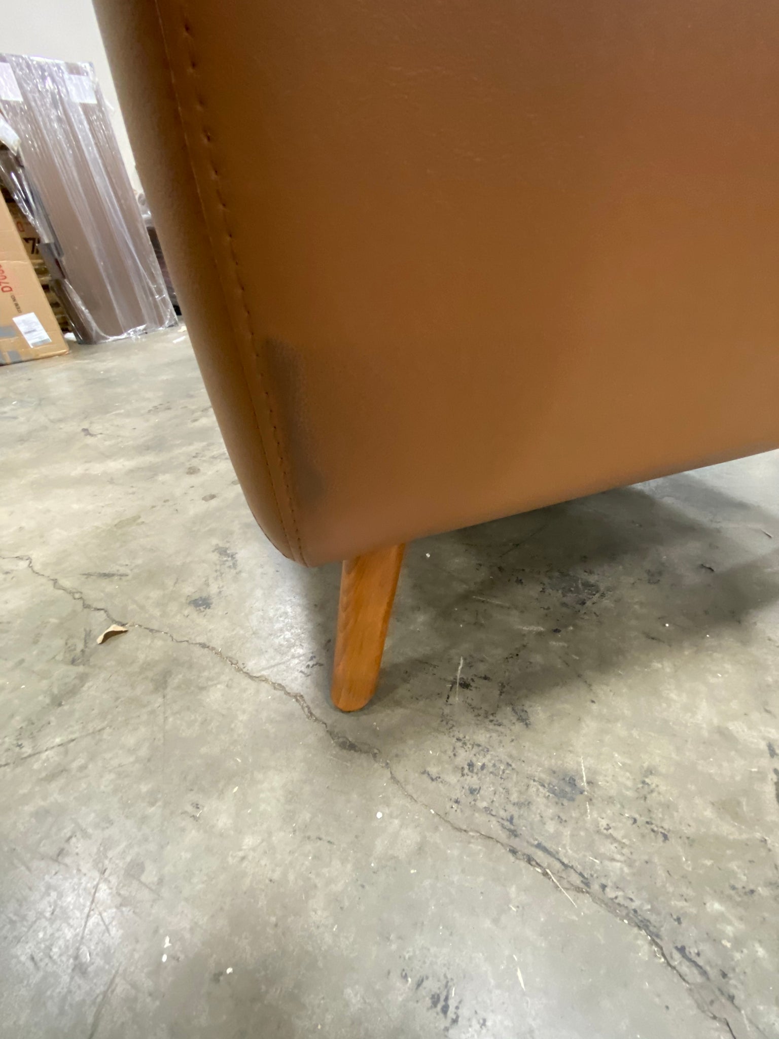 Faux leather square arm sofa in Tan with acorn brown wooden base.