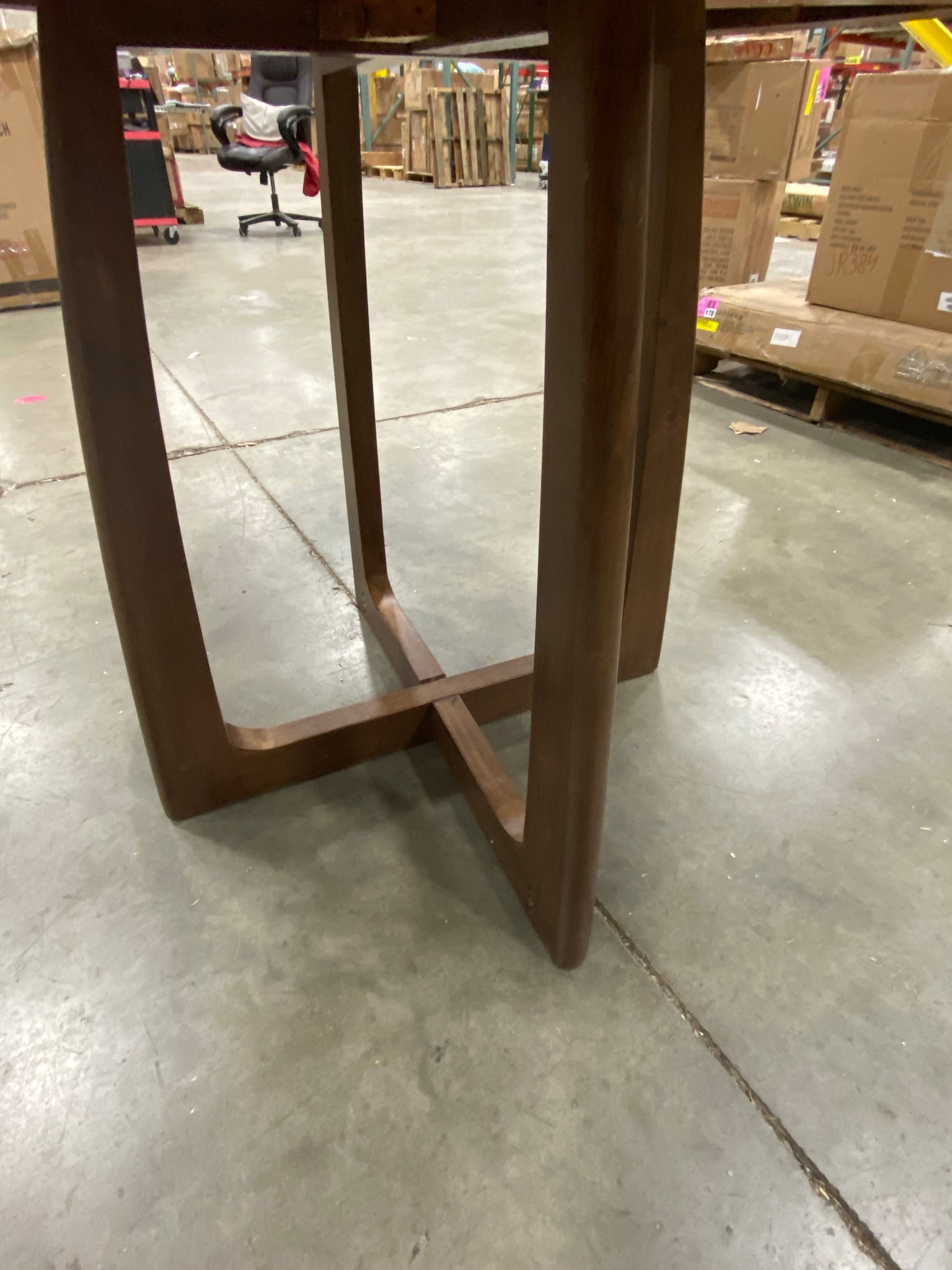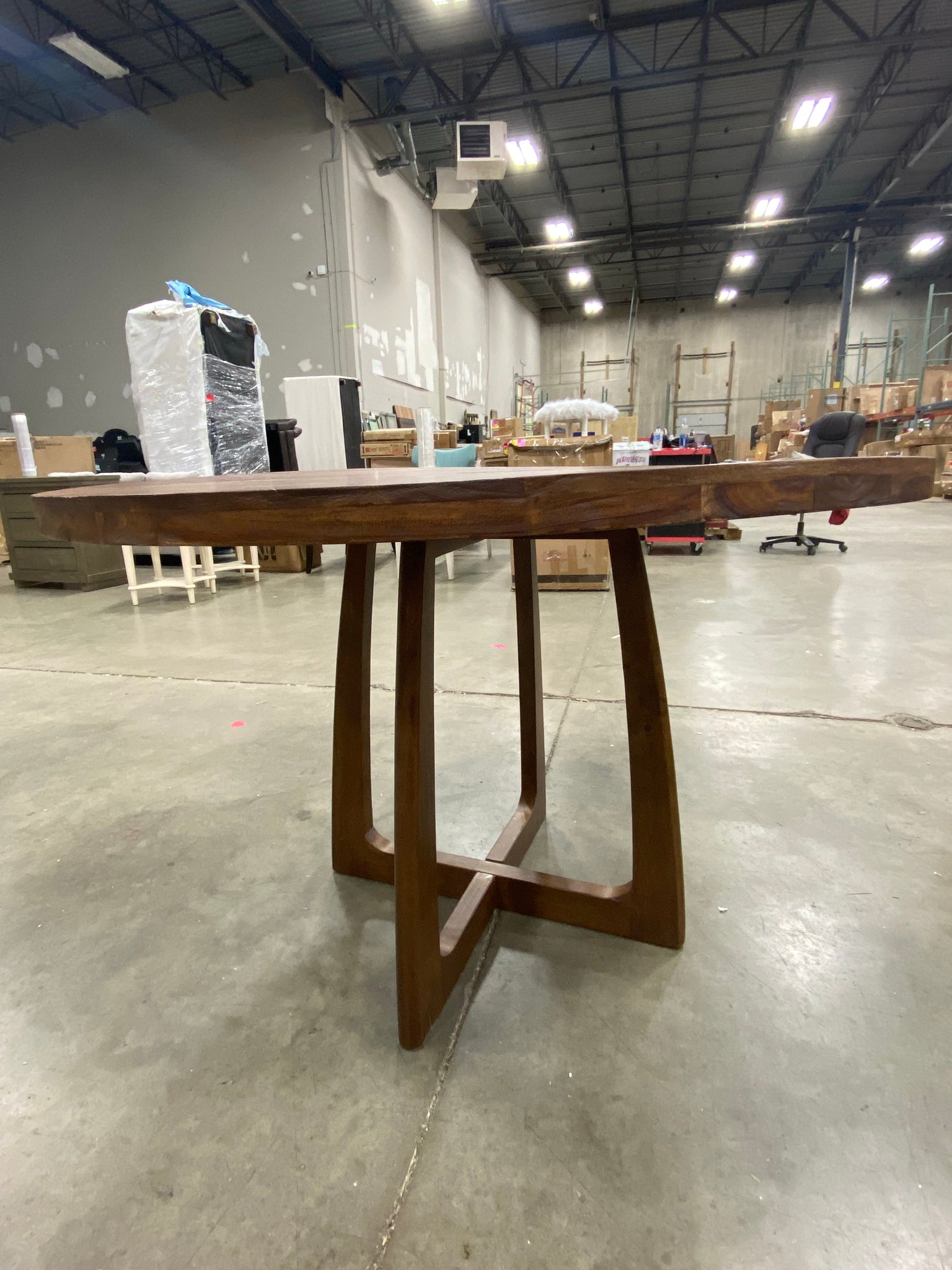 Out of the Box, The color is: sanblastin antique, please Note: Item customized in house. Round dining table with pedestal base. Base is NOT original to tabletop. Table top is slightly uneven/unlevel due to shipment. See photos. Item in otherwise good condition. Dimensions: 31"H x 48"D.