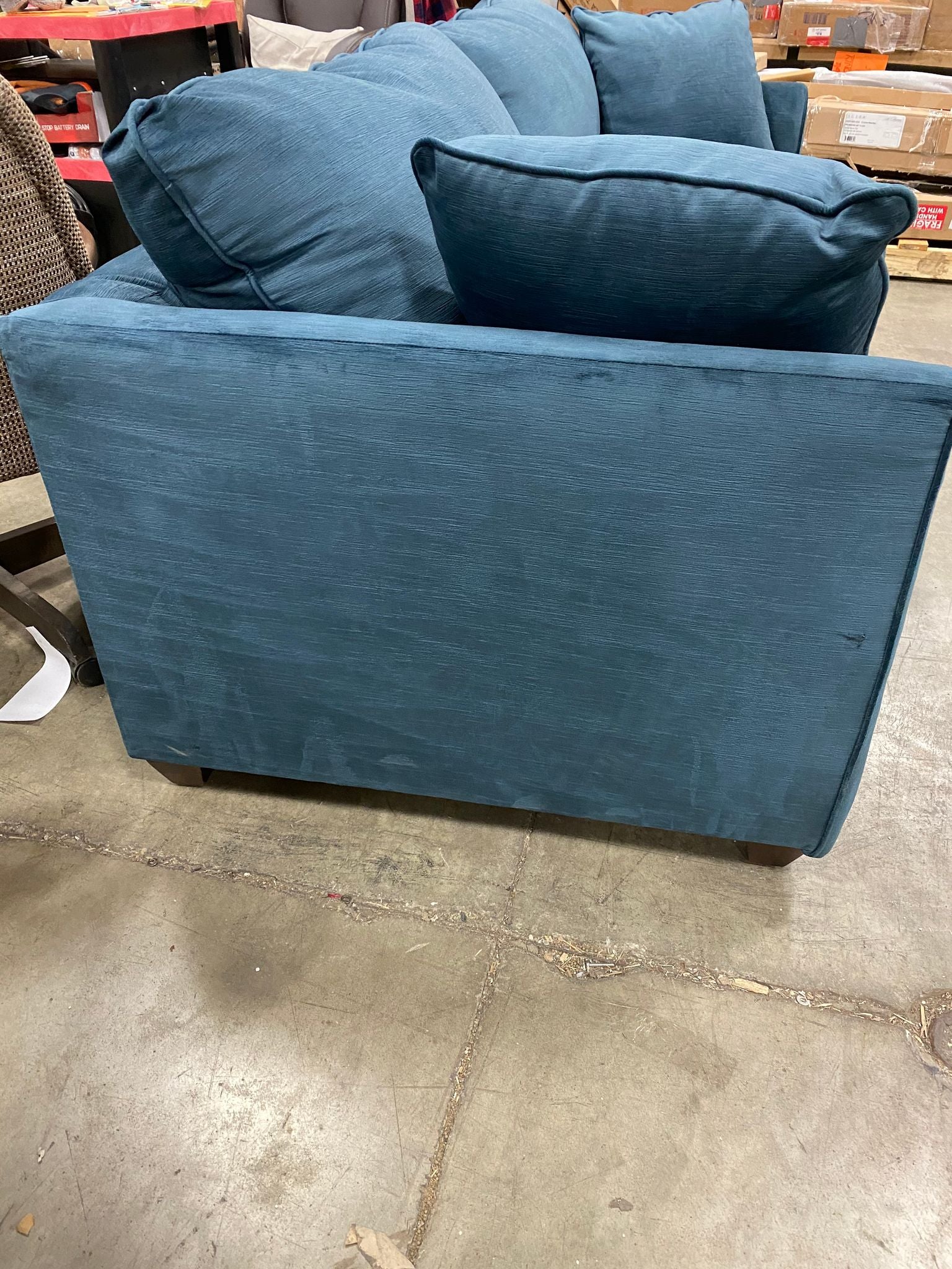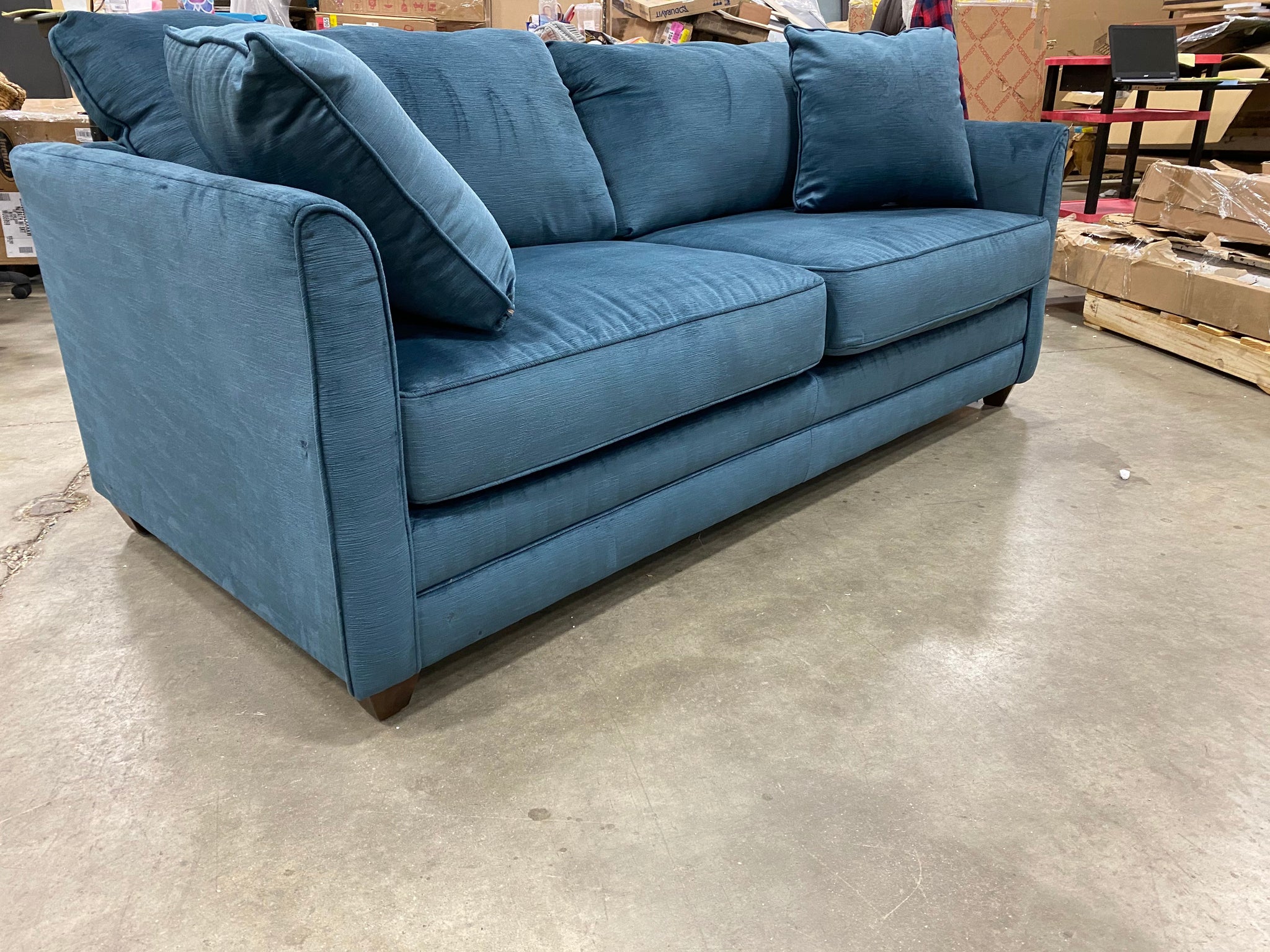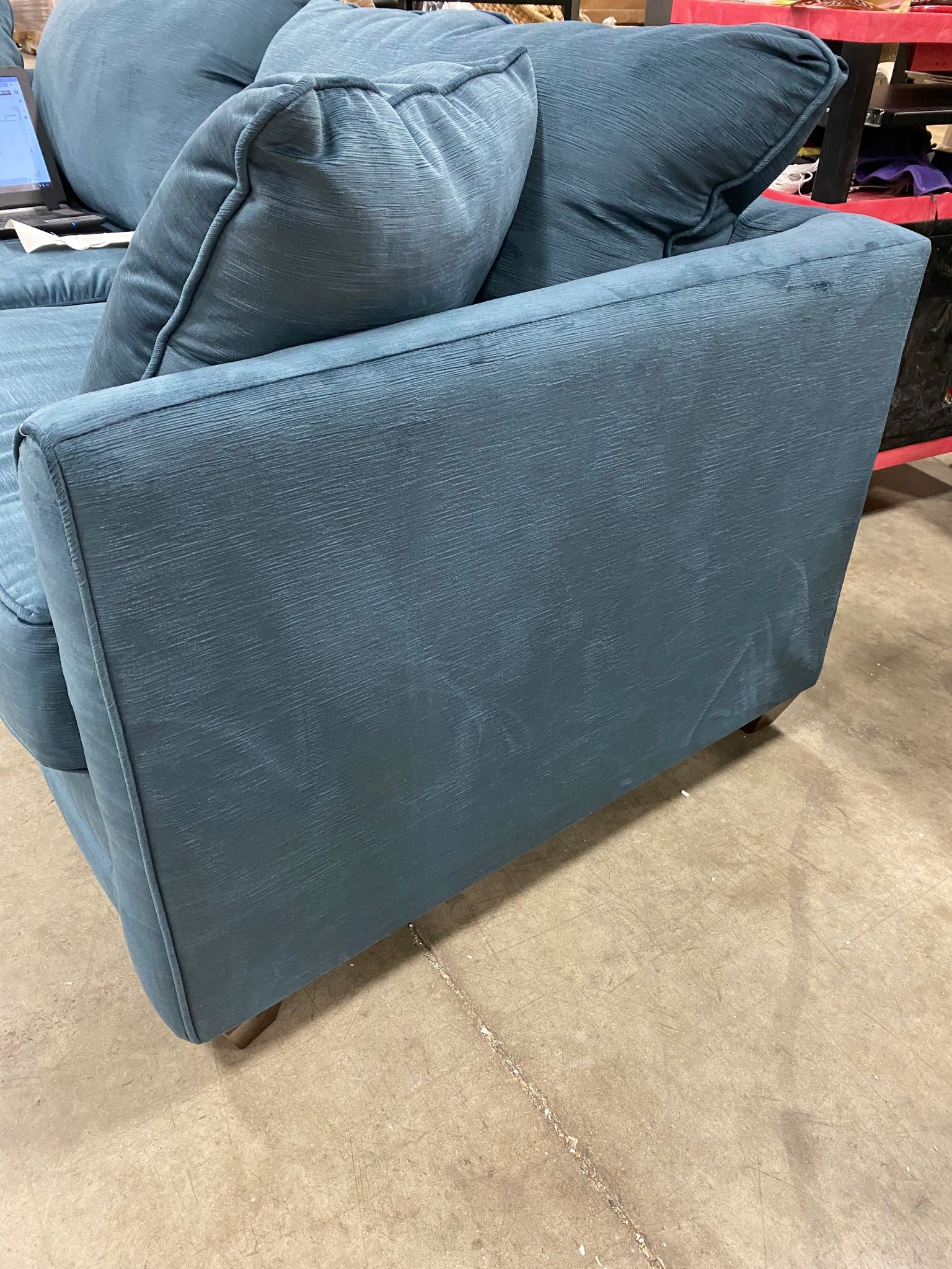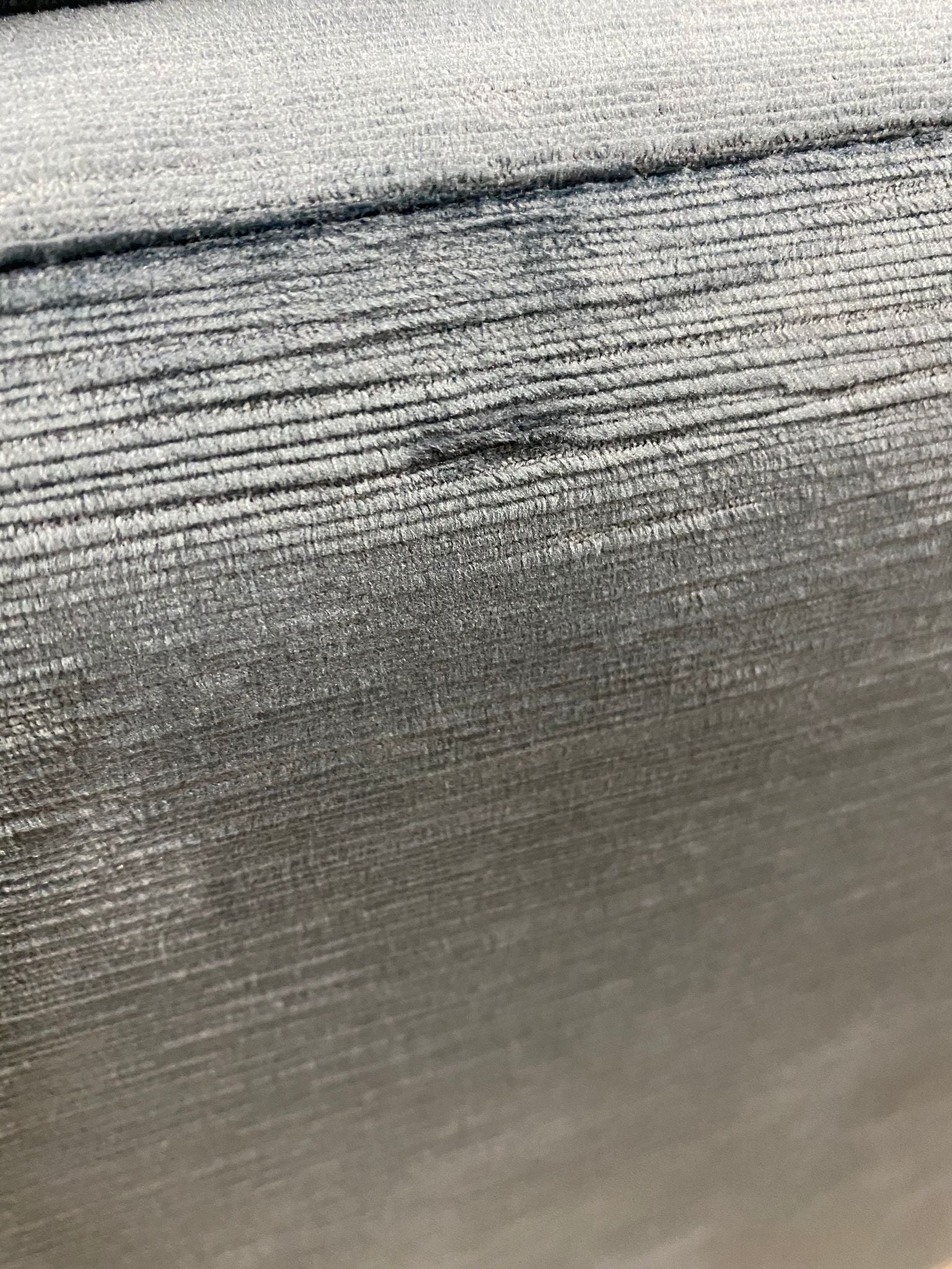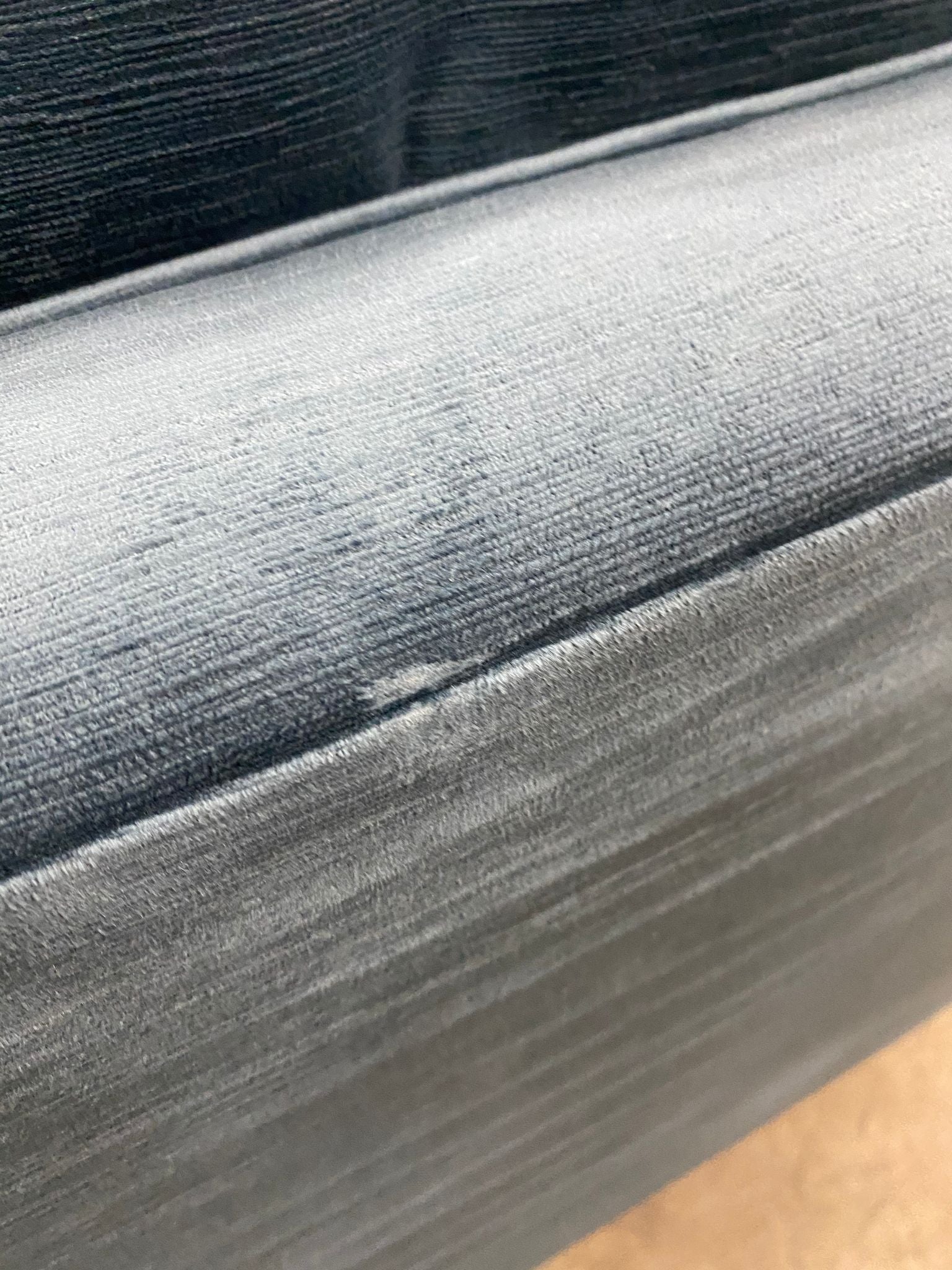 out of box, The color is empire shadow. Sofa has a few slight imperfections in the fabric on the tops of both arms. slight spotting on top of back near seam.