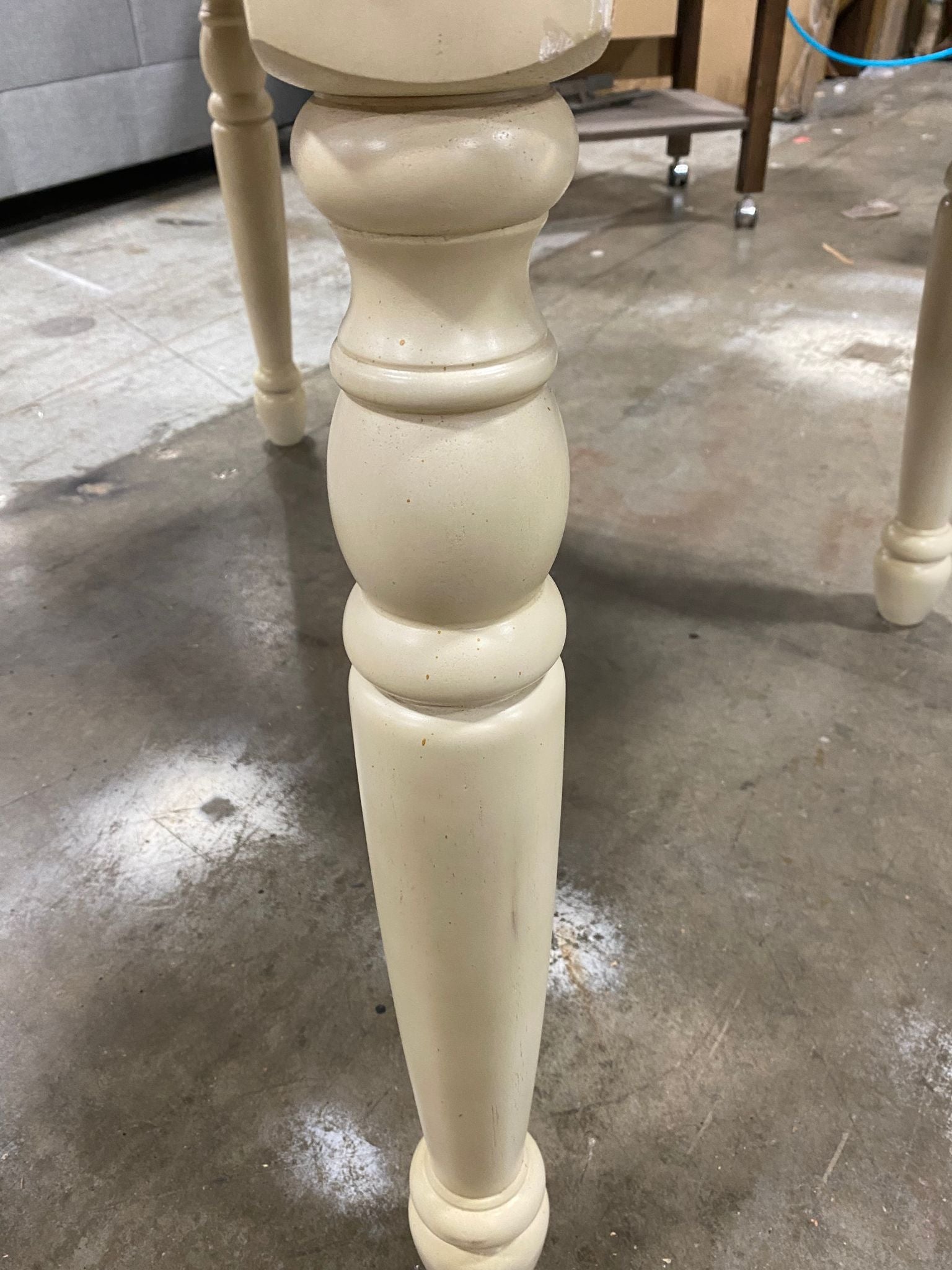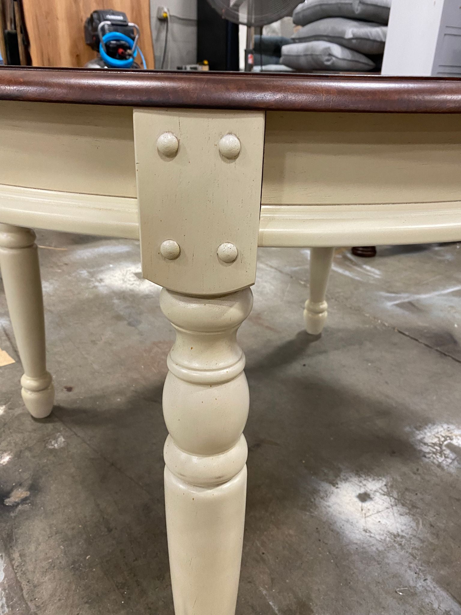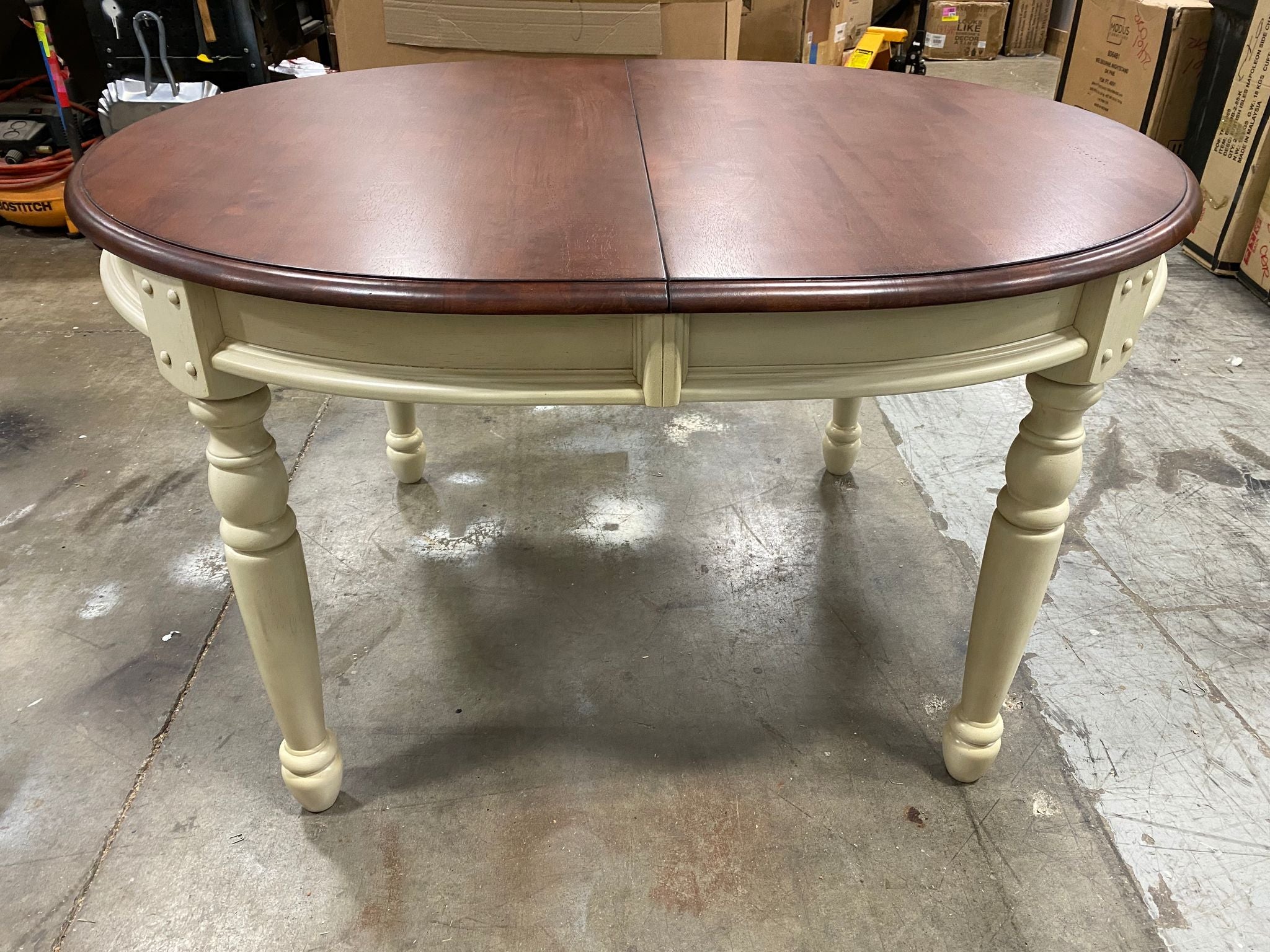Out of box/open box, The color is merlot/buttermilk, AS IS Condition: Dining table leaves removed for structural integrity. The table is shortened currently and can only accommodate 4 chairs. 1 extendable leaf can be added, but additional special hardware will be needed to be purchased to do so. Set comes with table, 6 in chairs (unassembled), 1 extendable table leaf. Table and leaf and some slight scuff marks on edges due to shipment. Items are in otherwise good condition. Current table dimensions are: 52" L x 42" W x 30"H