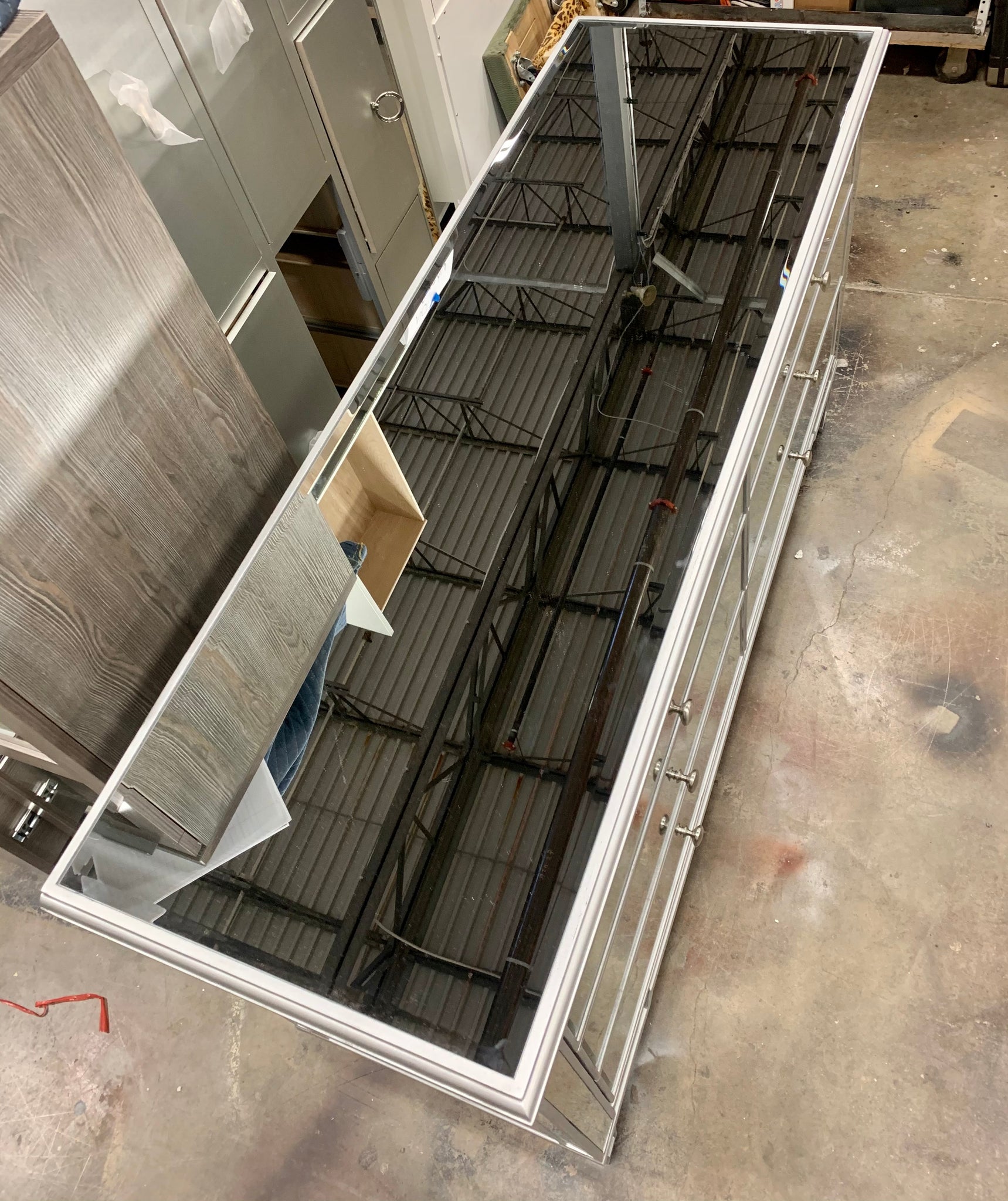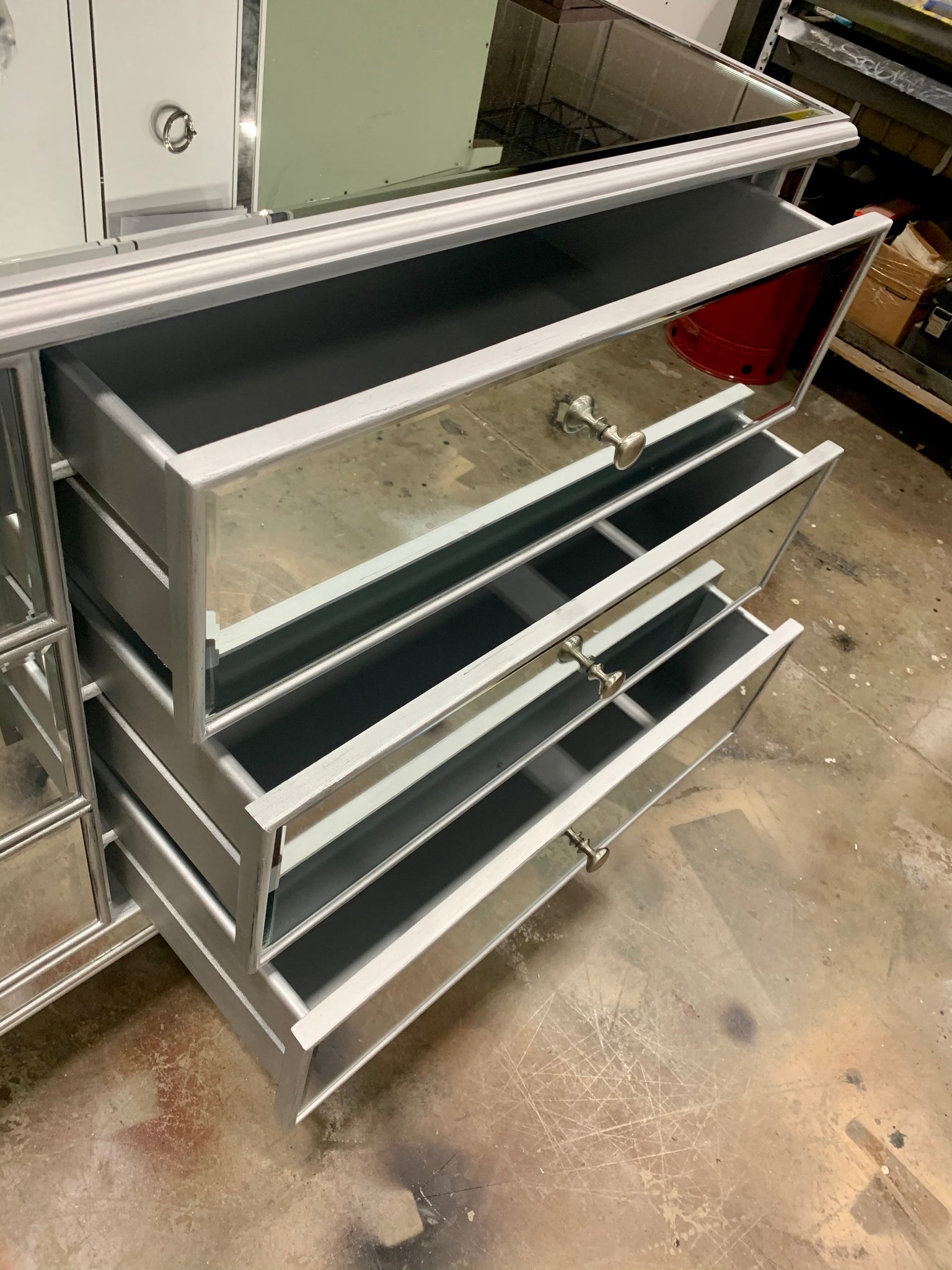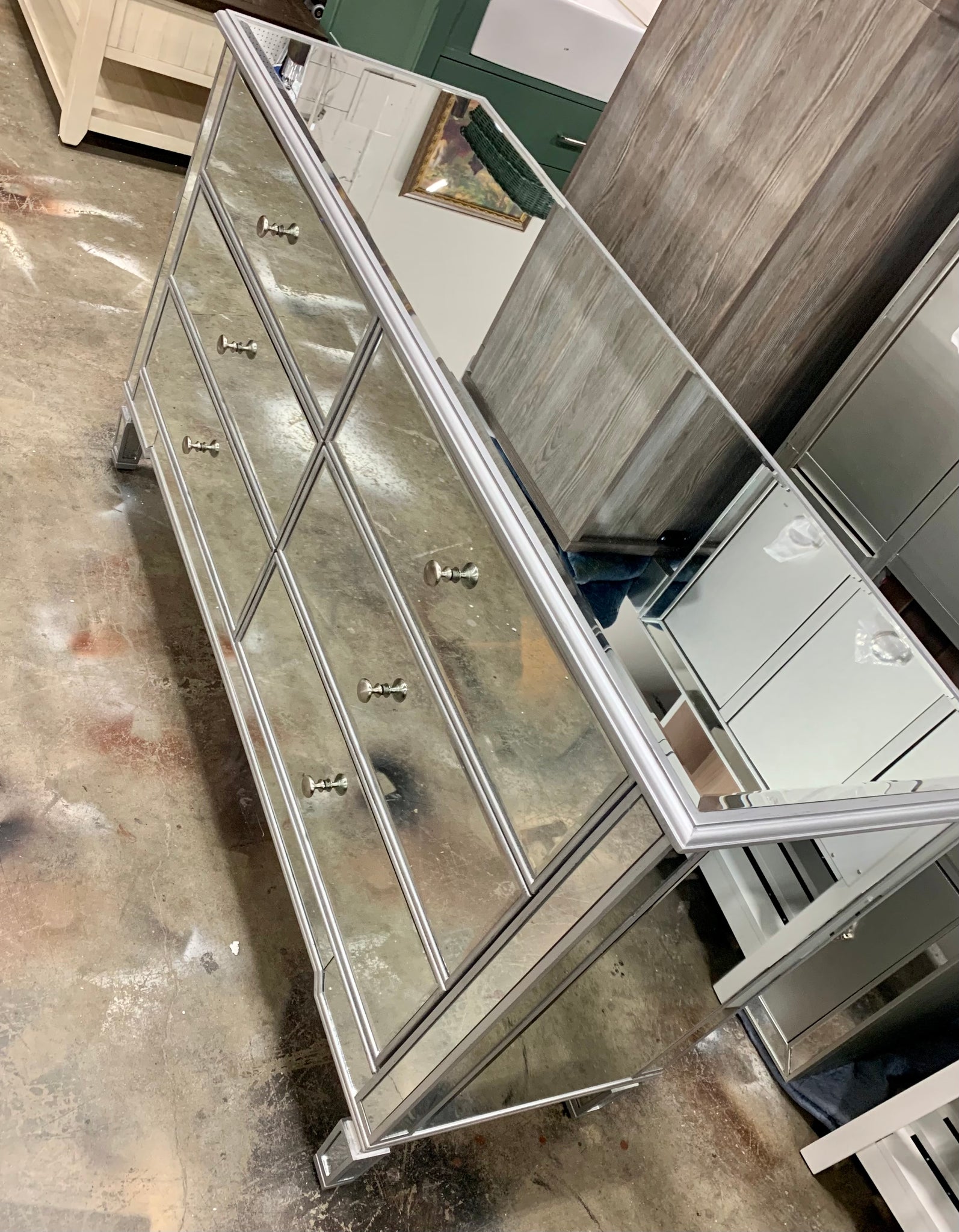 Out of box item. Crafted from solid and manufactured wood, its frame sports a hand-rubbed gold and silver finish with mirrored panels on all sides to scatter light throughout your space for a wide-open feel. Six drawers on wooden glides provide a place for your wardrobe, while the top leaves room to show off framed family photos or artful accents.