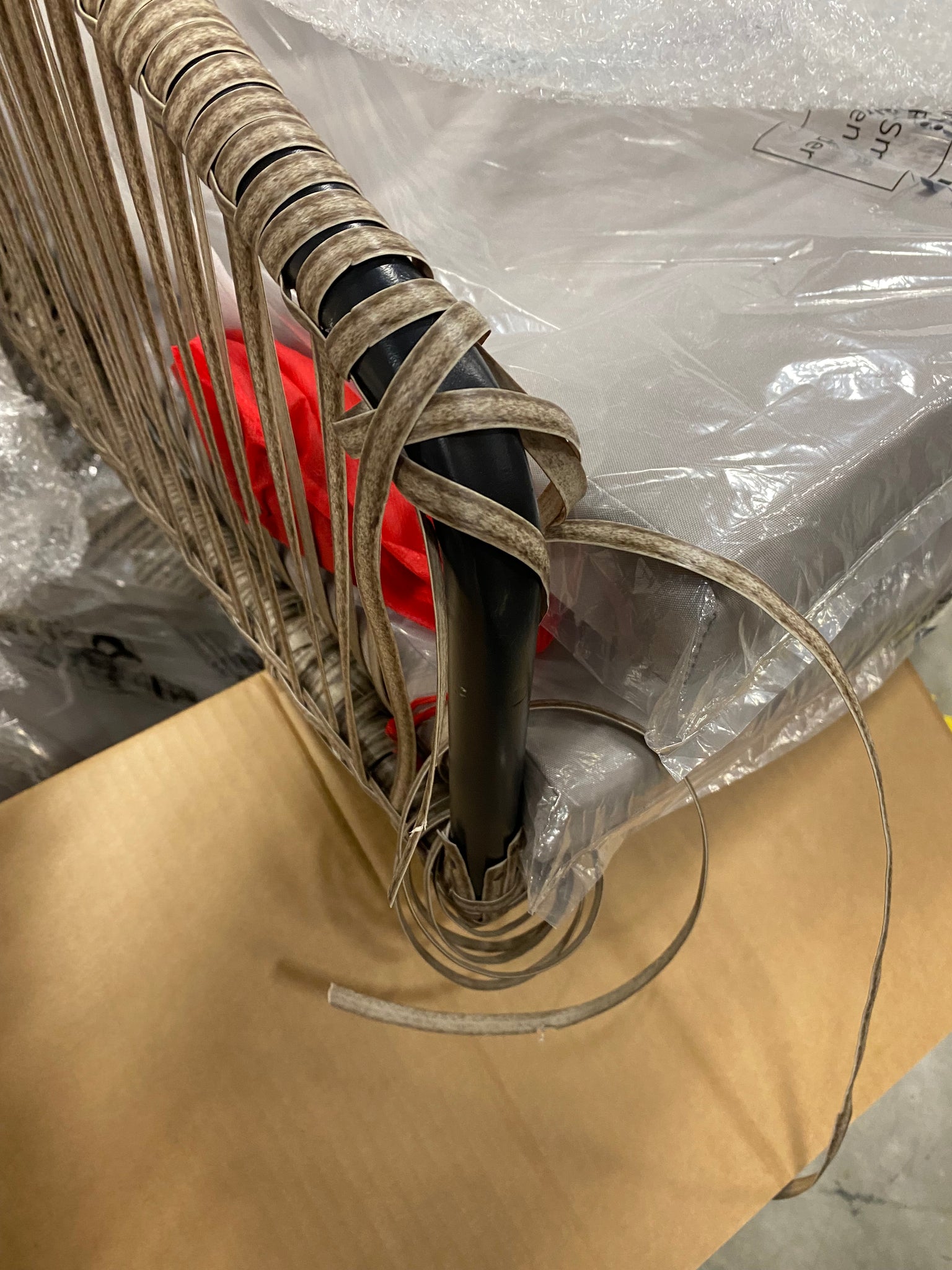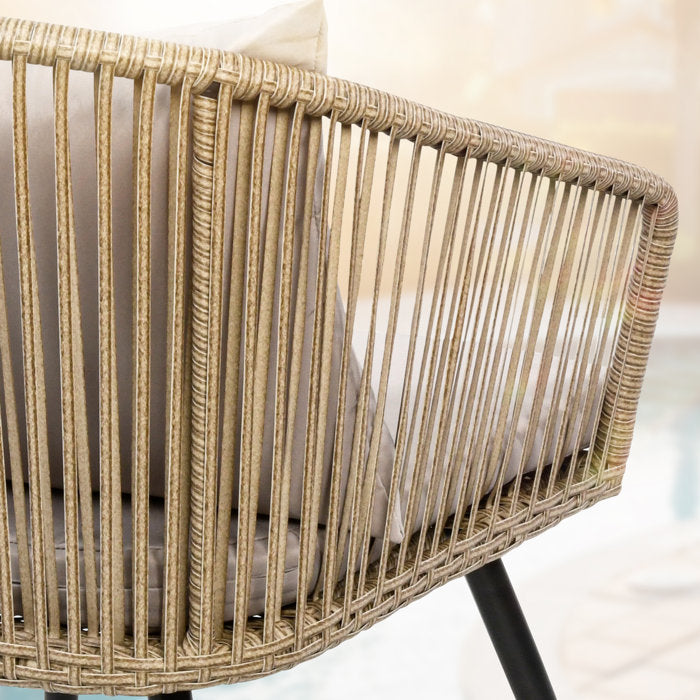 Note: AS IS Condition: 1 chair arm coming unraveled. See photos. Appears repairable. The set includes 2 chairs, 1 table, and cushions.