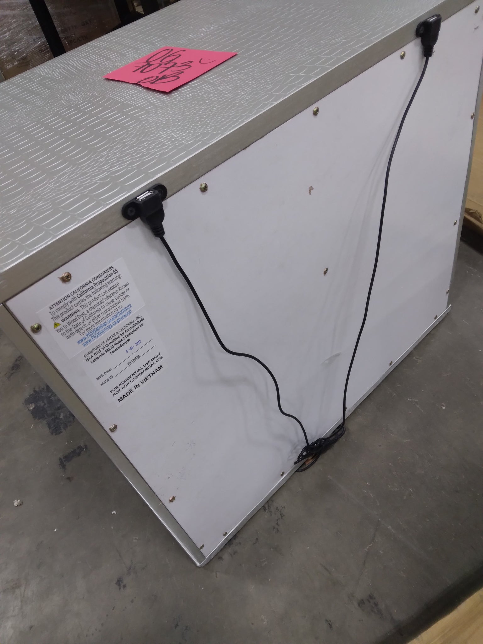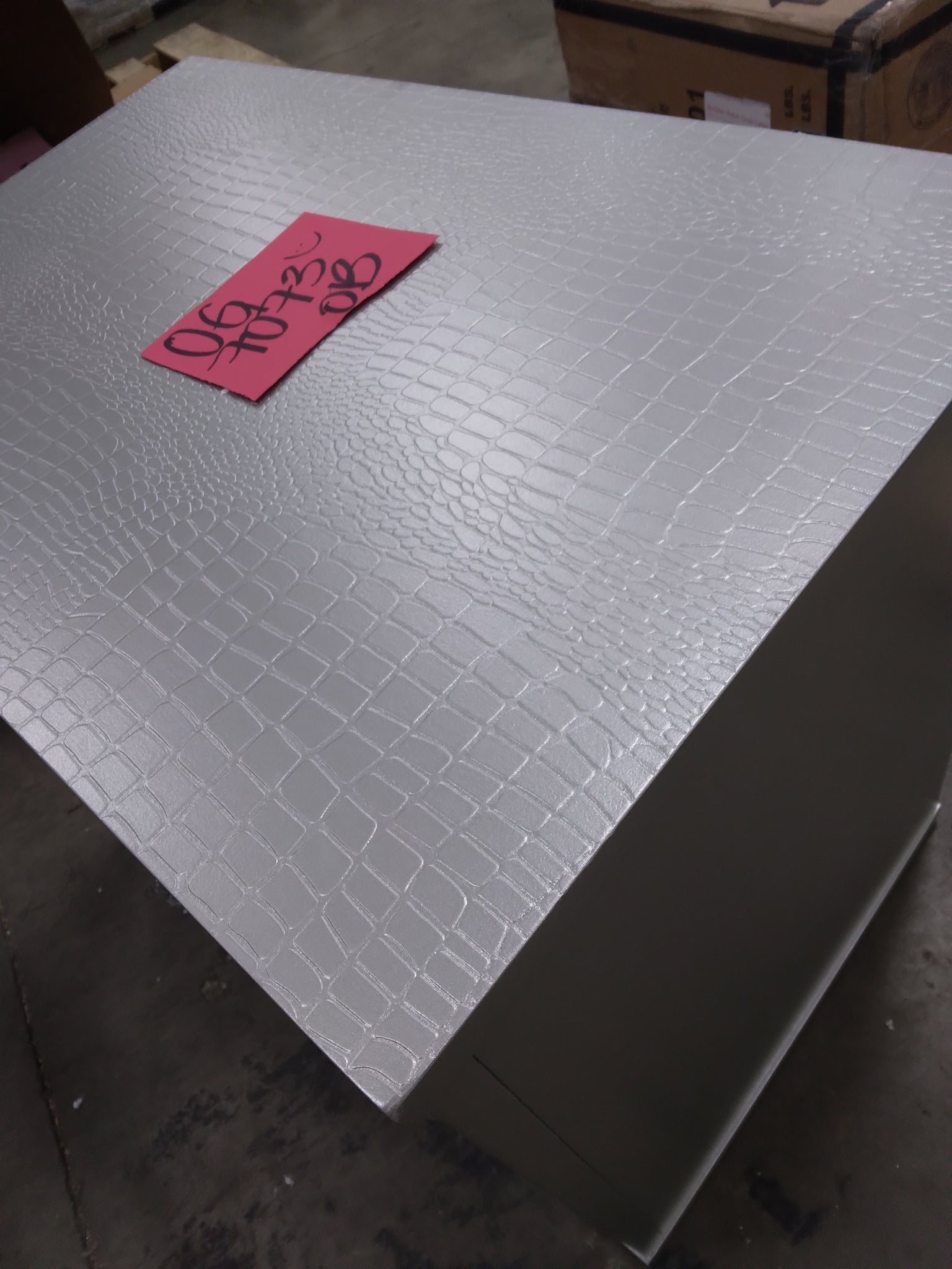 Out of the box, The color silver, AS IS: This nightstand does NOT included feet. This item has not been previously tested before sale. The last knob is in the top drawer of the nightstand.