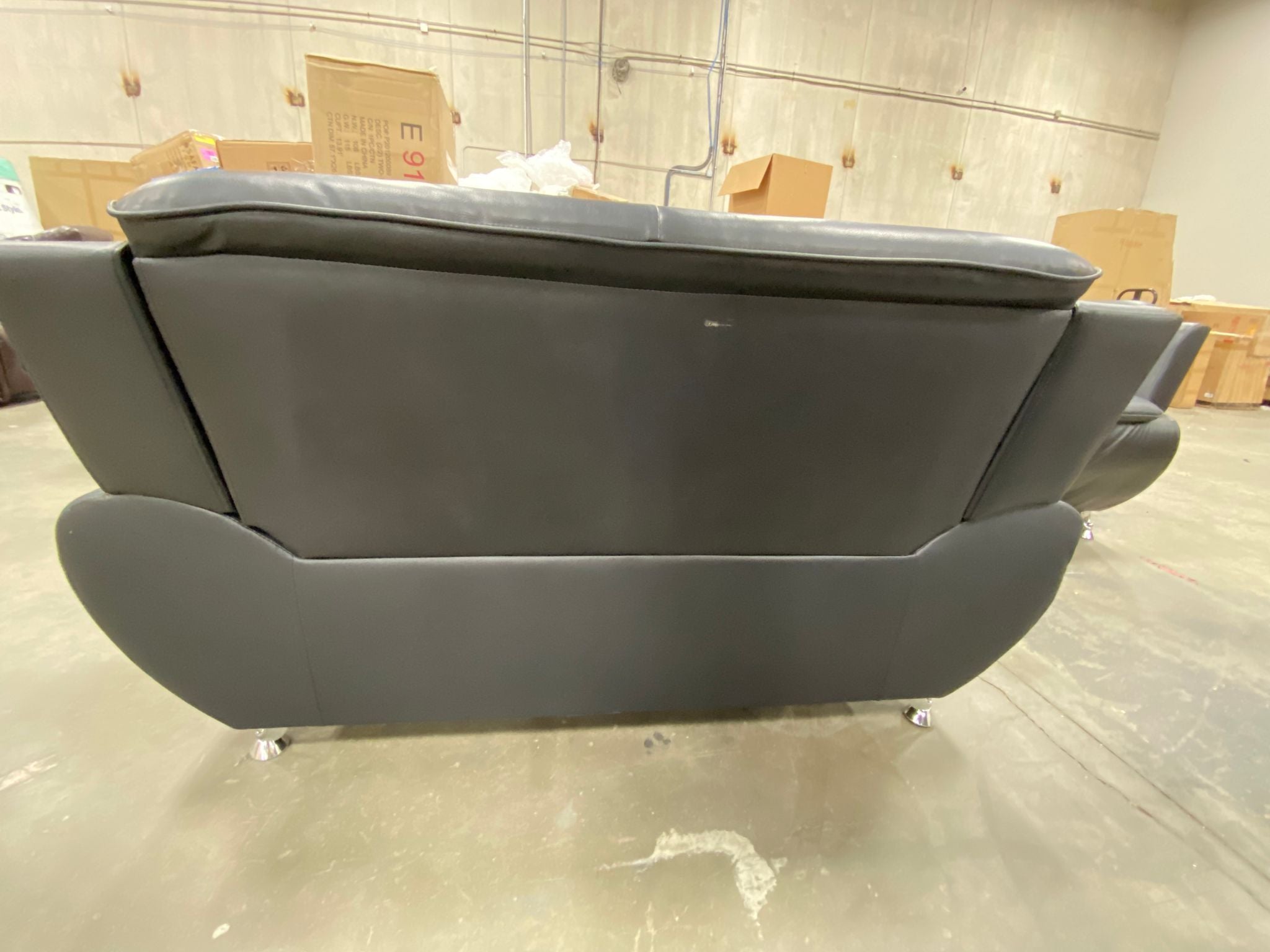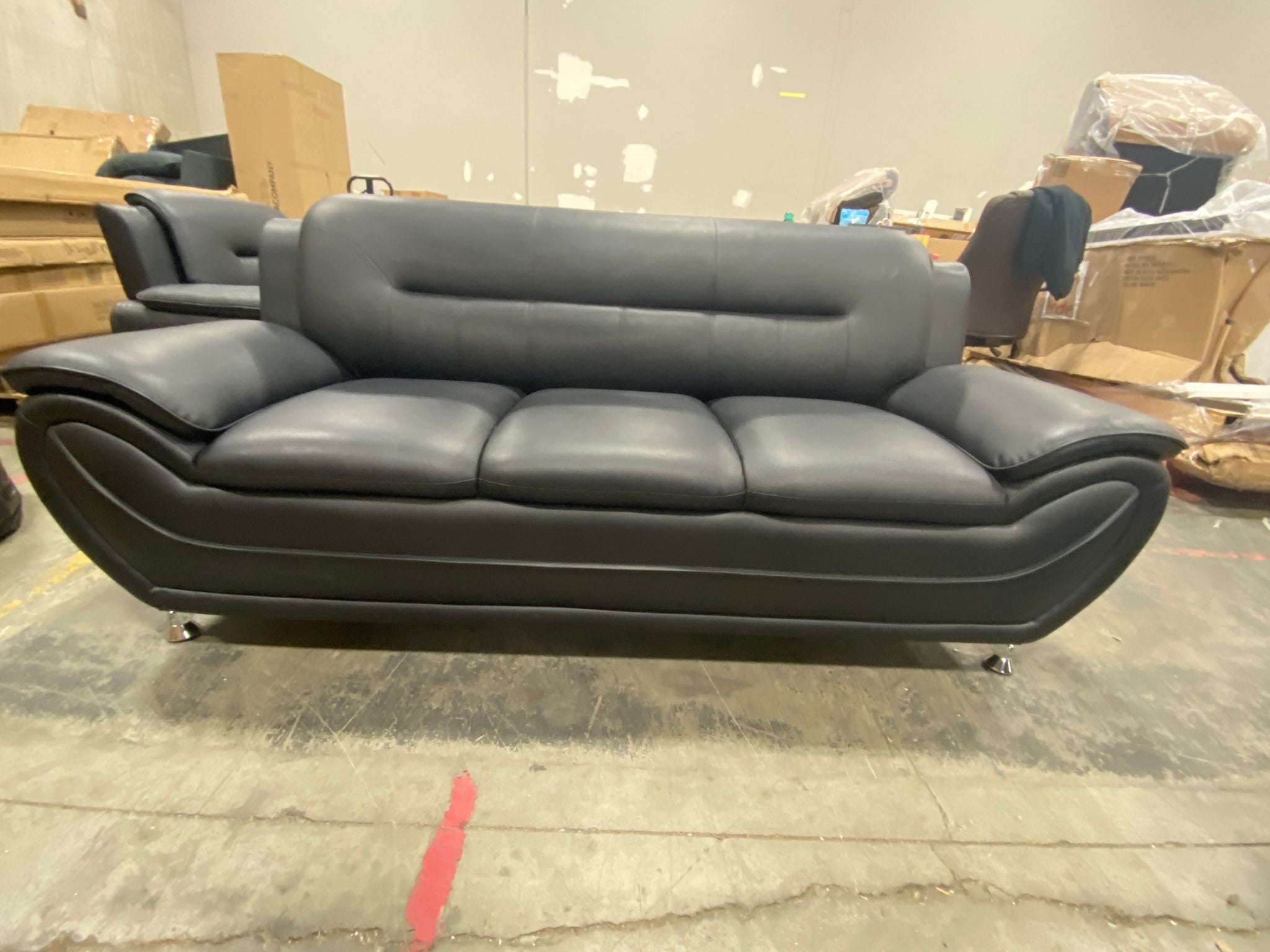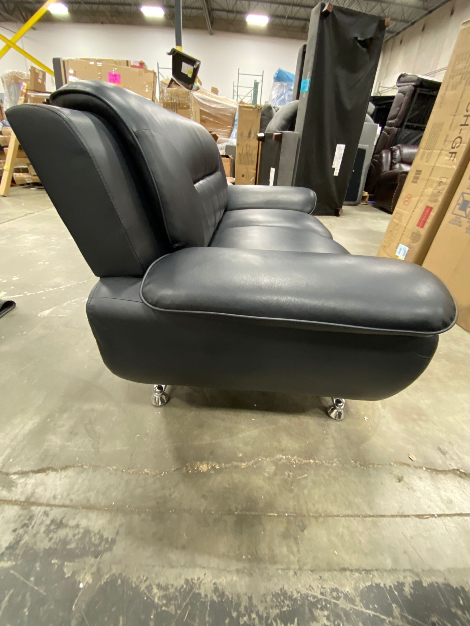 Out of the box, The color is black, AS IS condition: Sofa has very slight tear on back side of right arm. Chair has a small hole on front of chair. Loveseat has scuffs on right arm some scuffs on arm. See photos. Items are in otherwise good condition.
