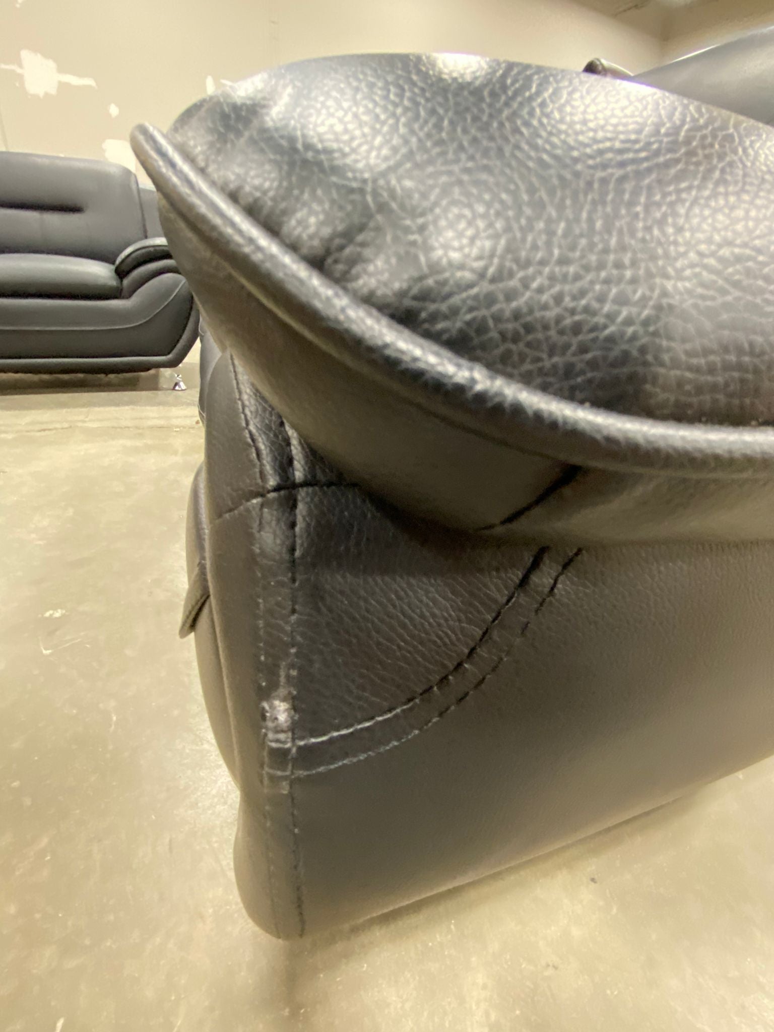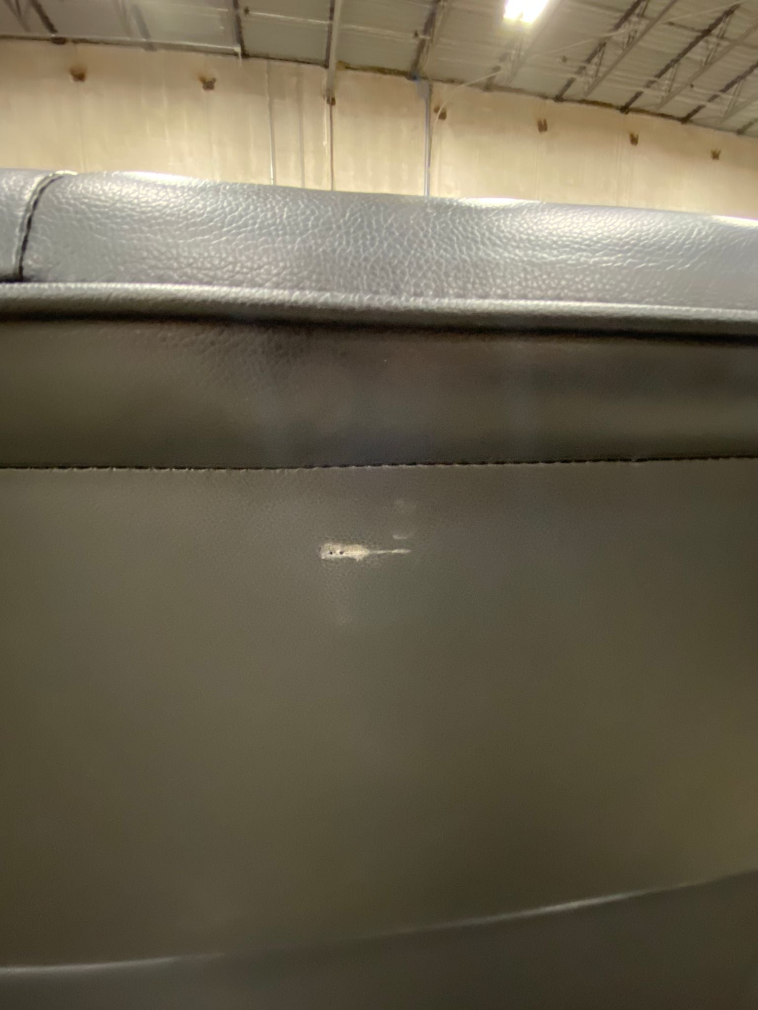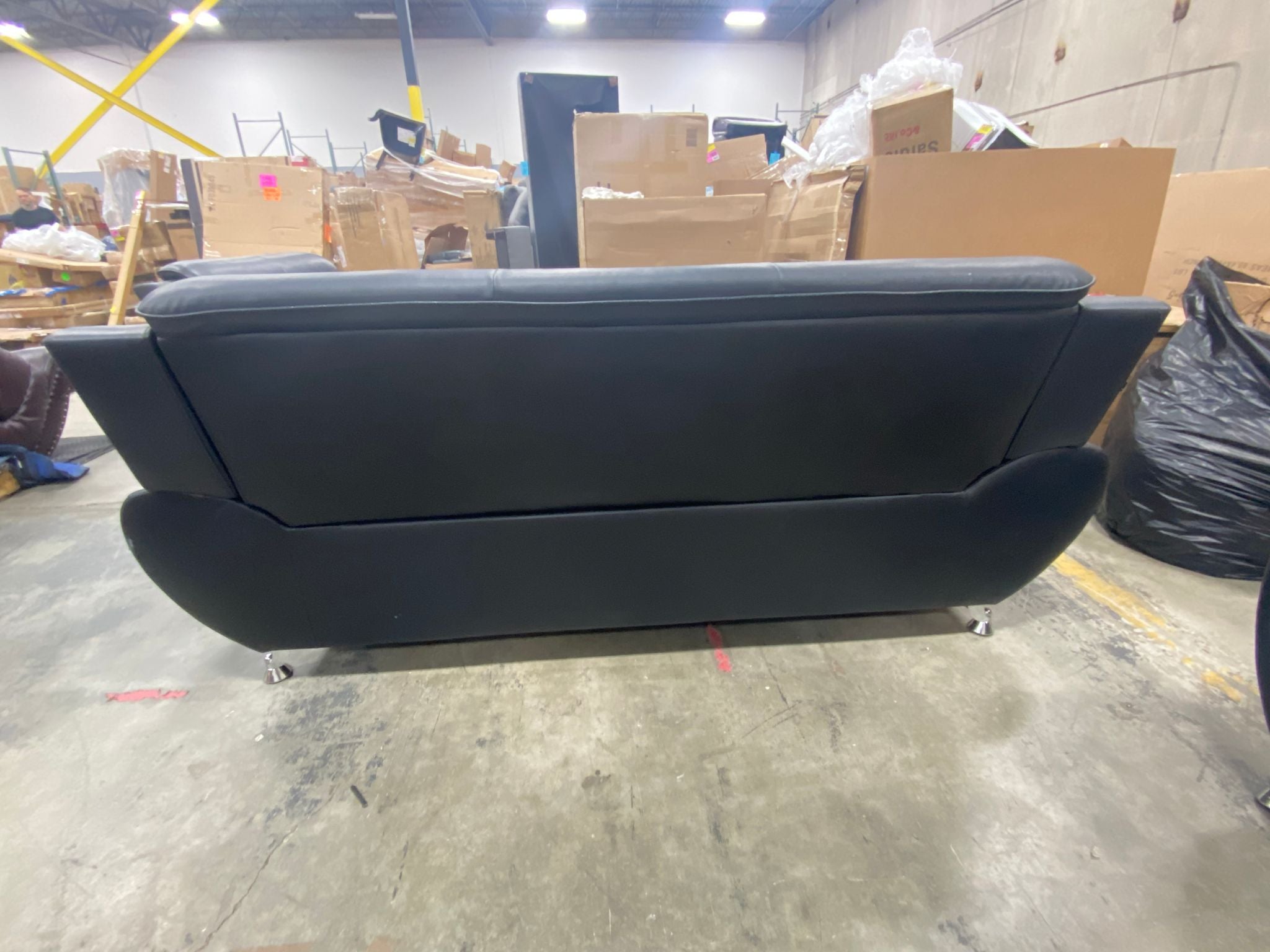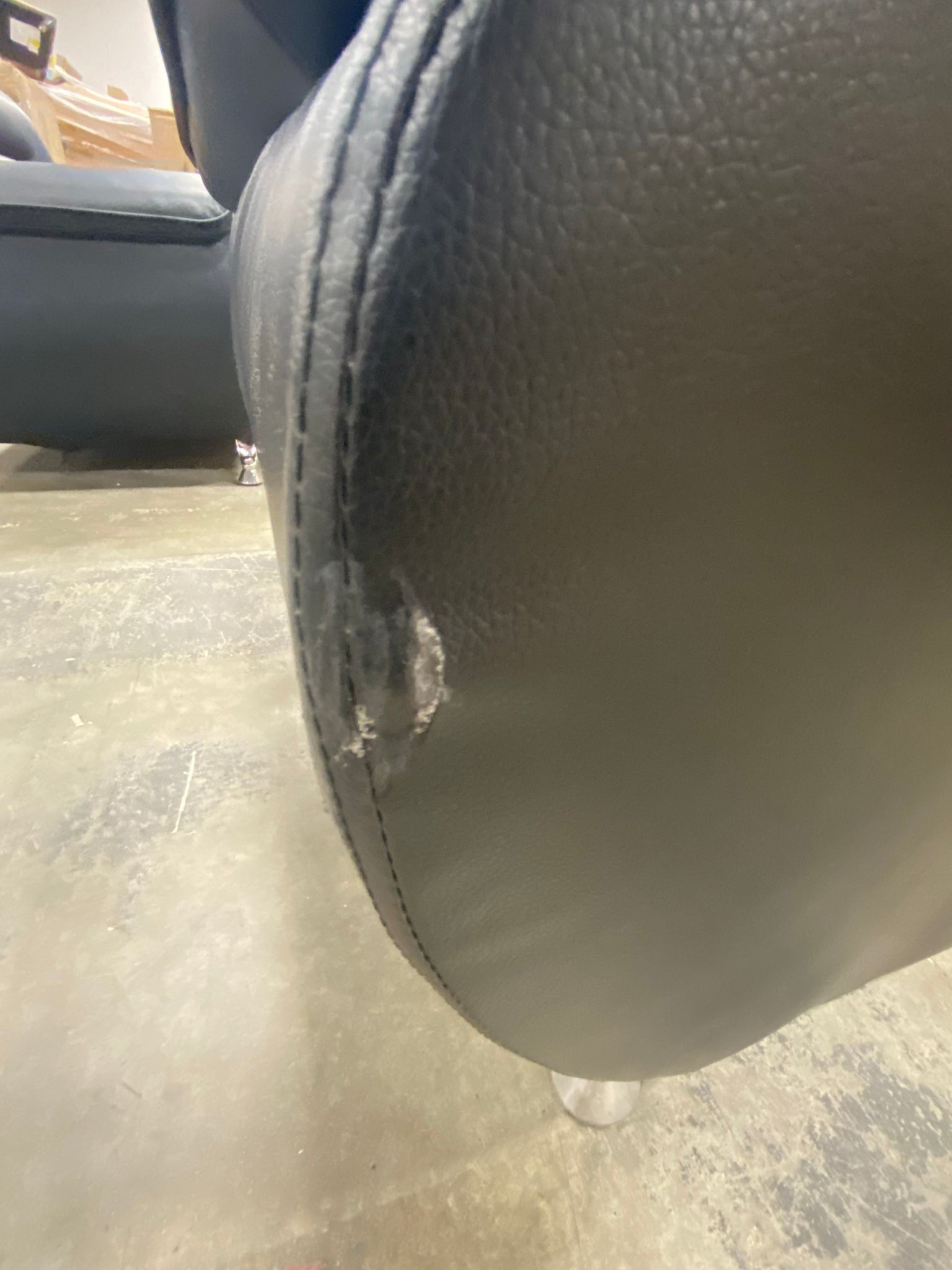 Out of the box, The color is black, AS IS condition: Sofa has very slight tear on back side of right arm. Chair has a small hole on front of chair. Loveseat has scuffs on right arm some scuffs on arm. See photos. Items are in otherwise good condition.