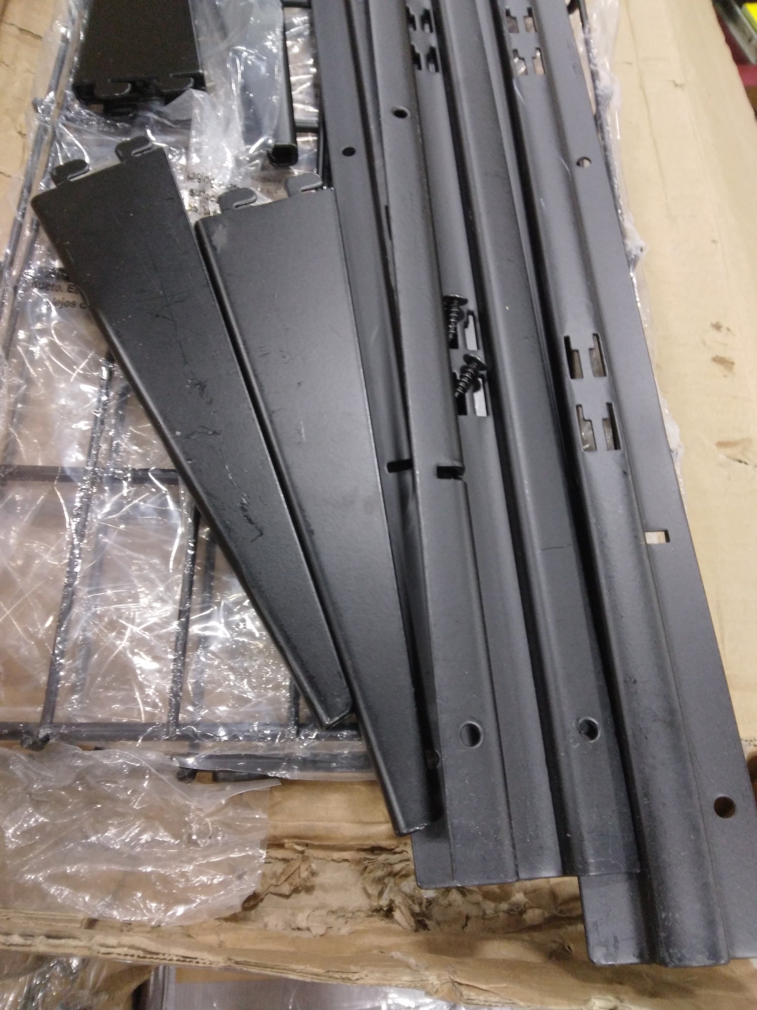 Open Box, The color is black powder coated, Previously opened. There is scratching all through out pieces of metal. There is also loose screws/small parts that are more than likely missing pieces. See for photos of scratching.