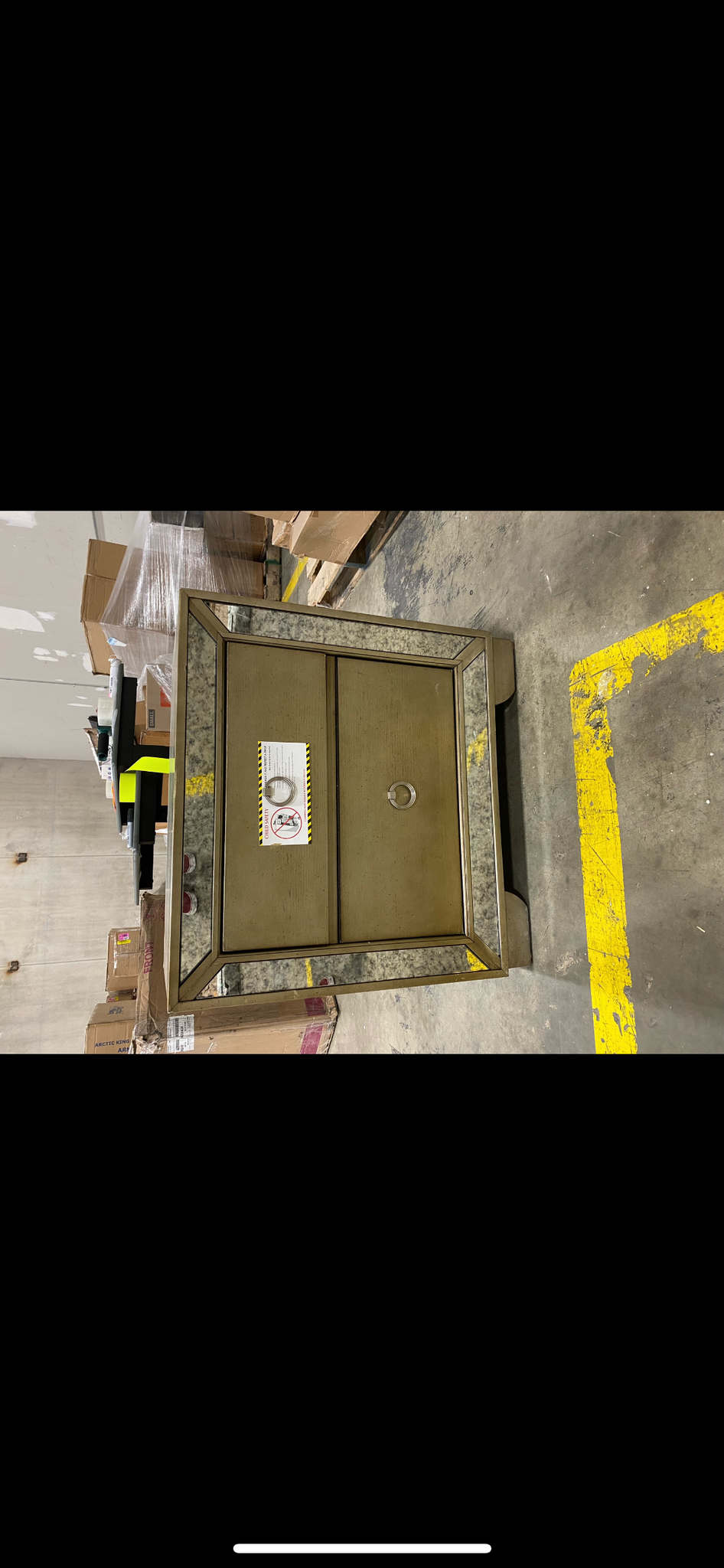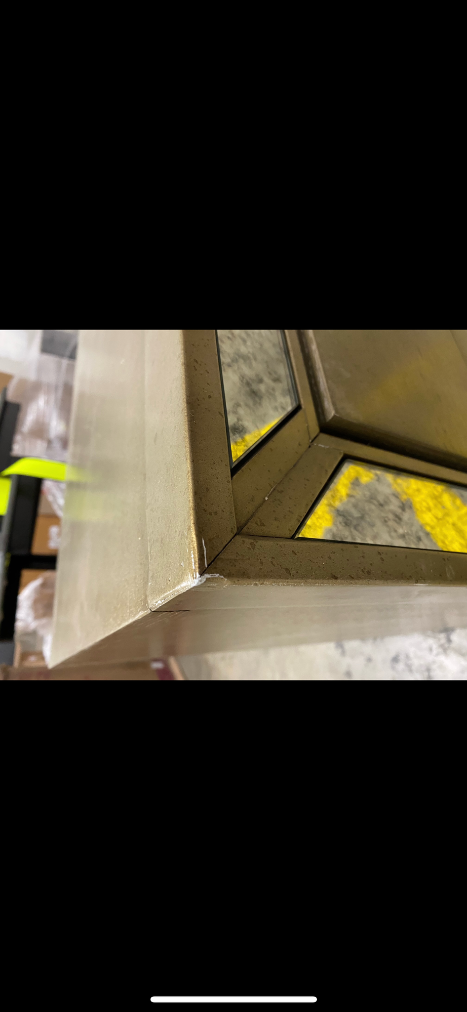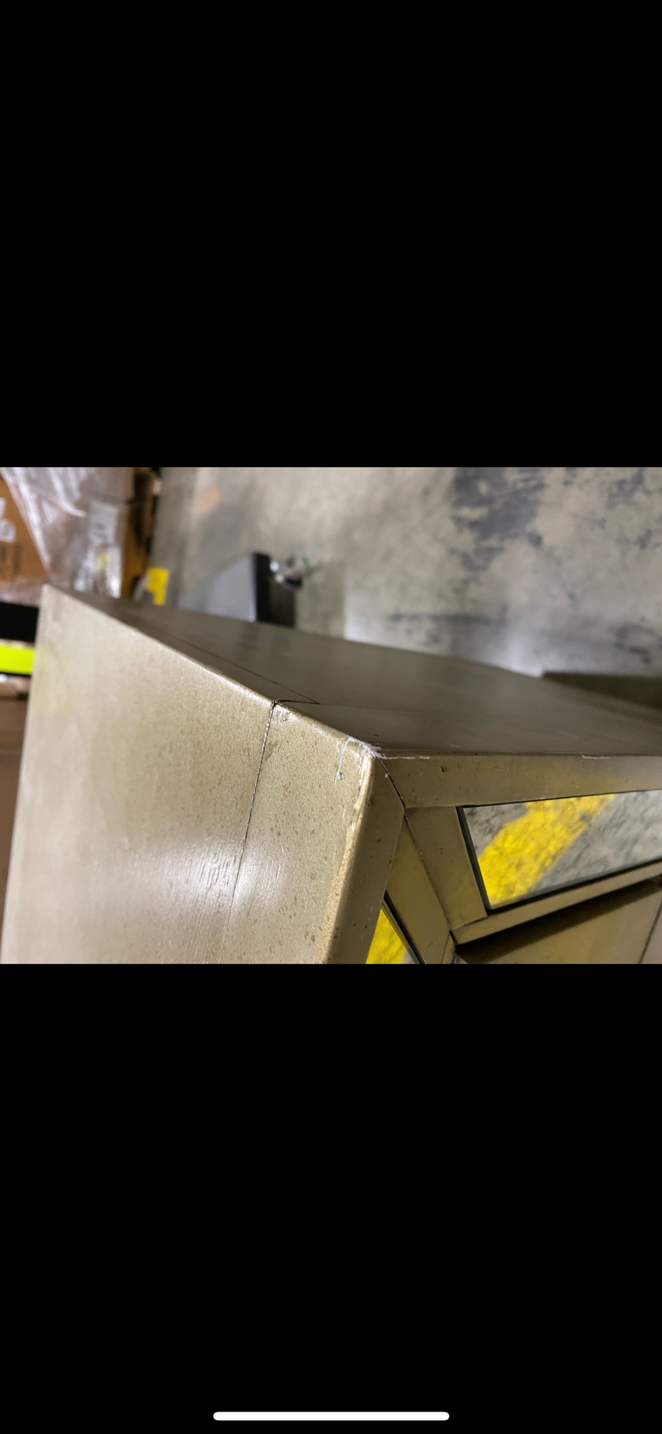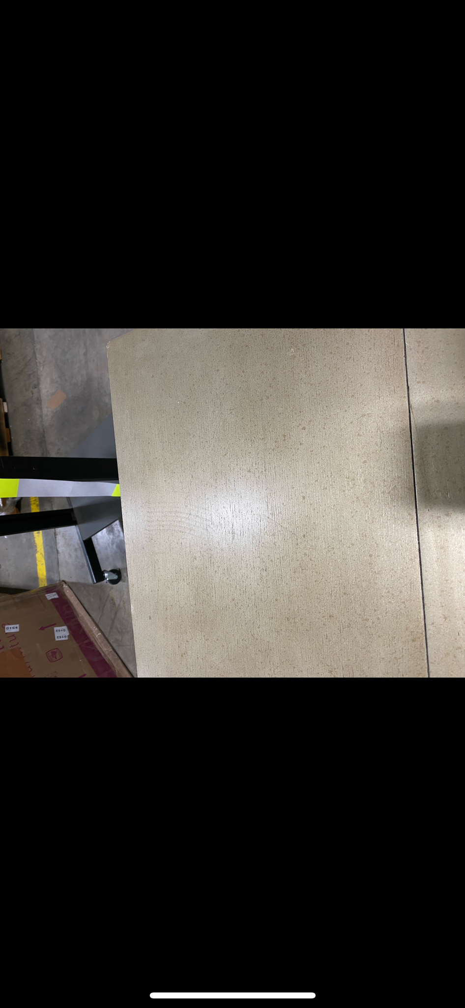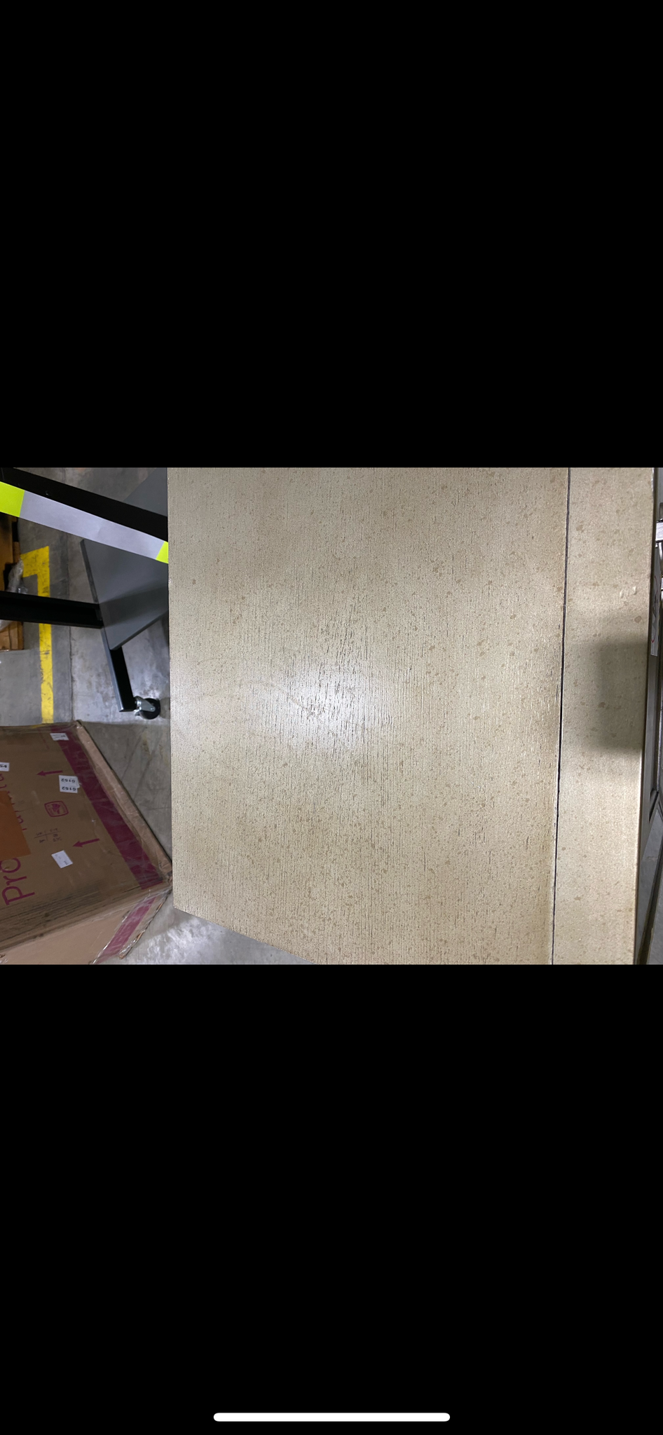 Out of box, The color is champagne, AS IS Condition: Item has slight scuffing on table top. Small dings on corner/side edges due to shipment. Ding damage on one foot. See photos. Item in otherwise good condition.