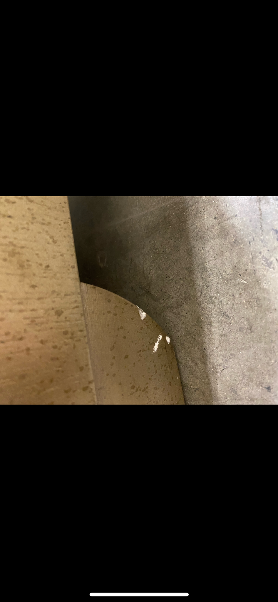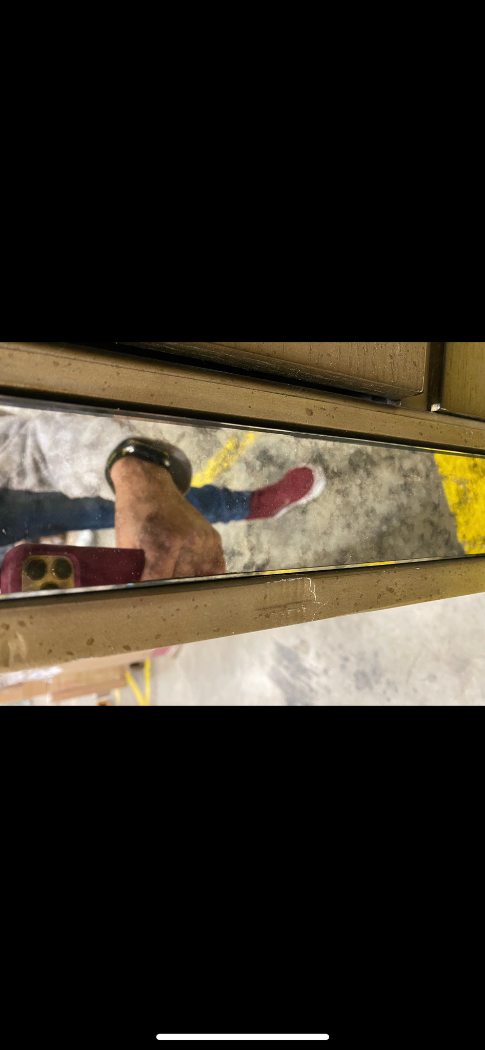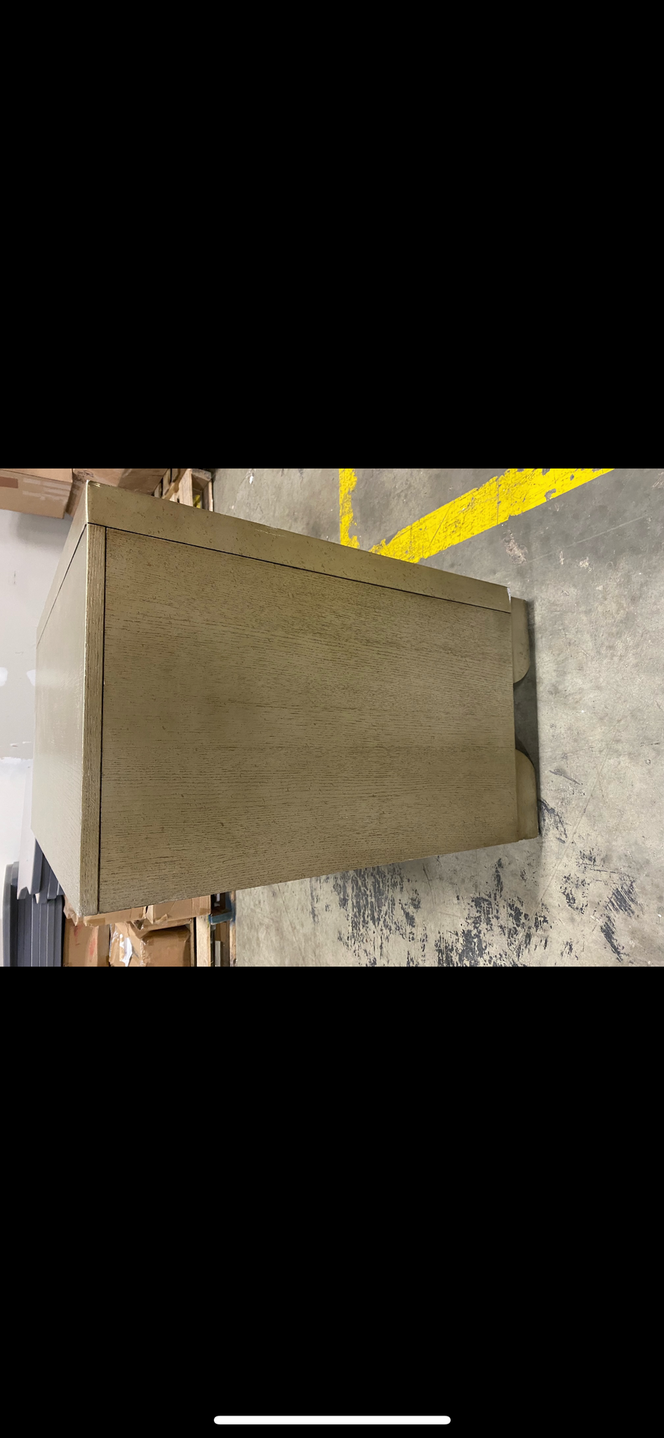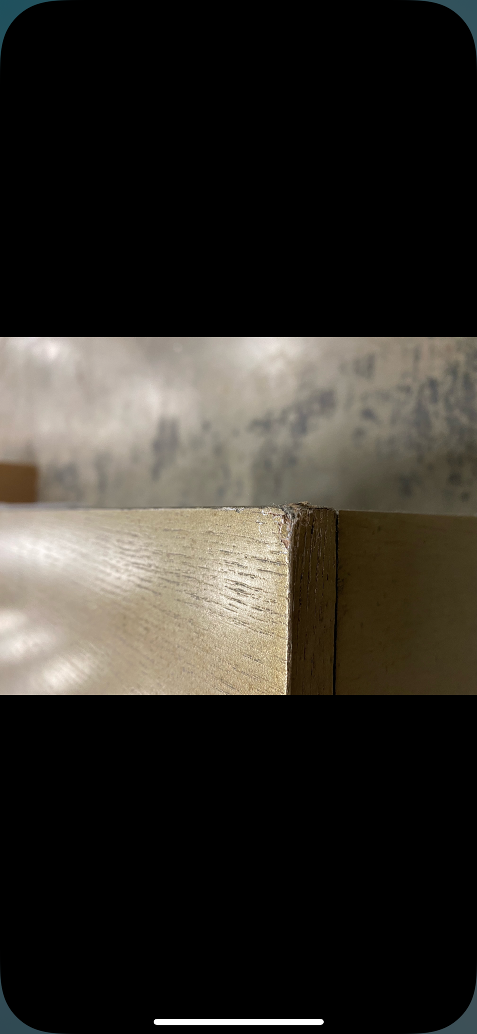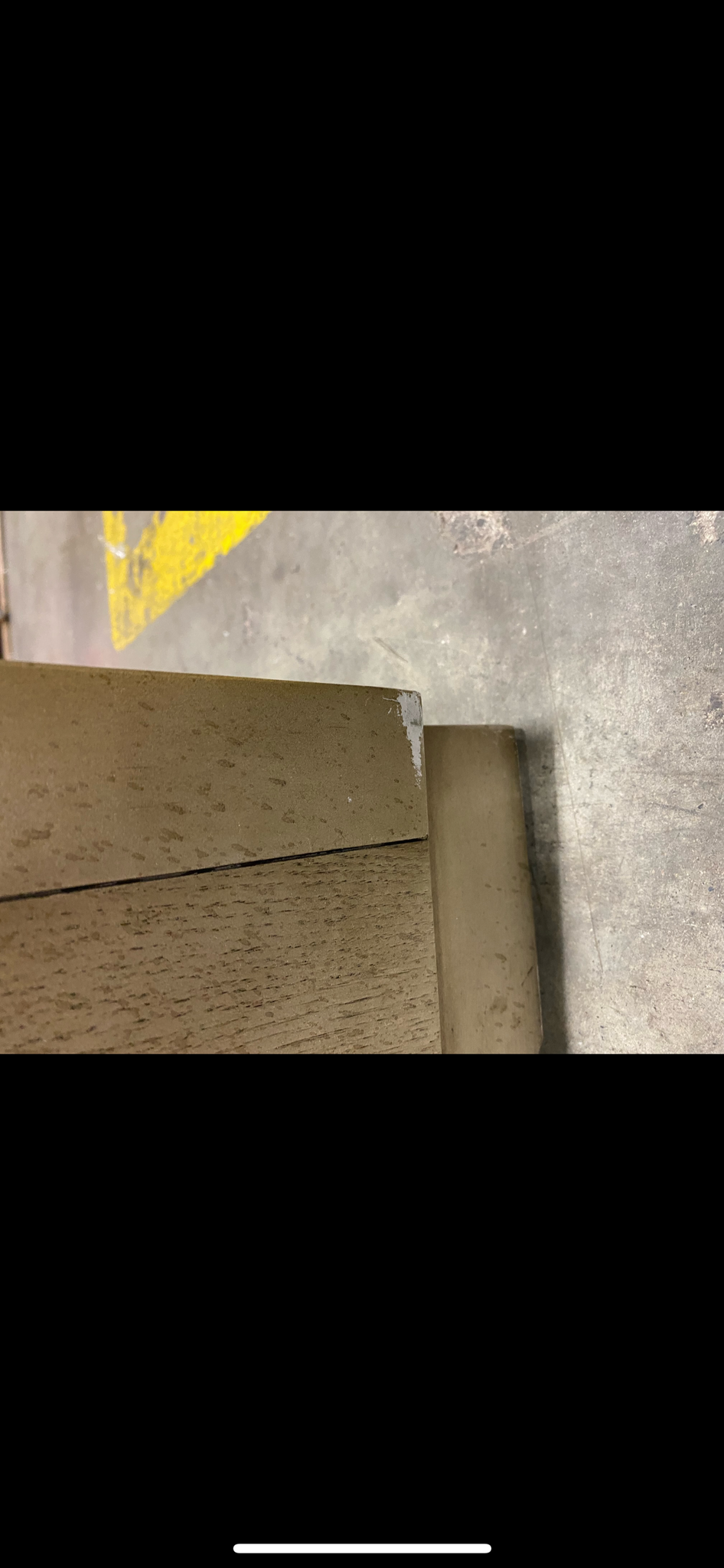 Out of box, The color is champagne, AS IS Condition: Item has slight scuffing on table top. Small dings on corner/side edges due to shipment. Ding damage on one foot. See photos. Item in otherwise good condition.