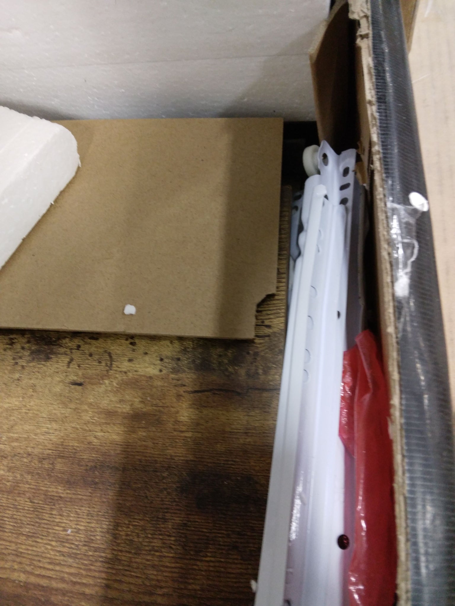 Open Box, The color is brown/black , Size: 48", Previously opened with loose hardware. May be missing pieces. There is also a slight chip on the corner of a base piece for the drawers. See for photo.