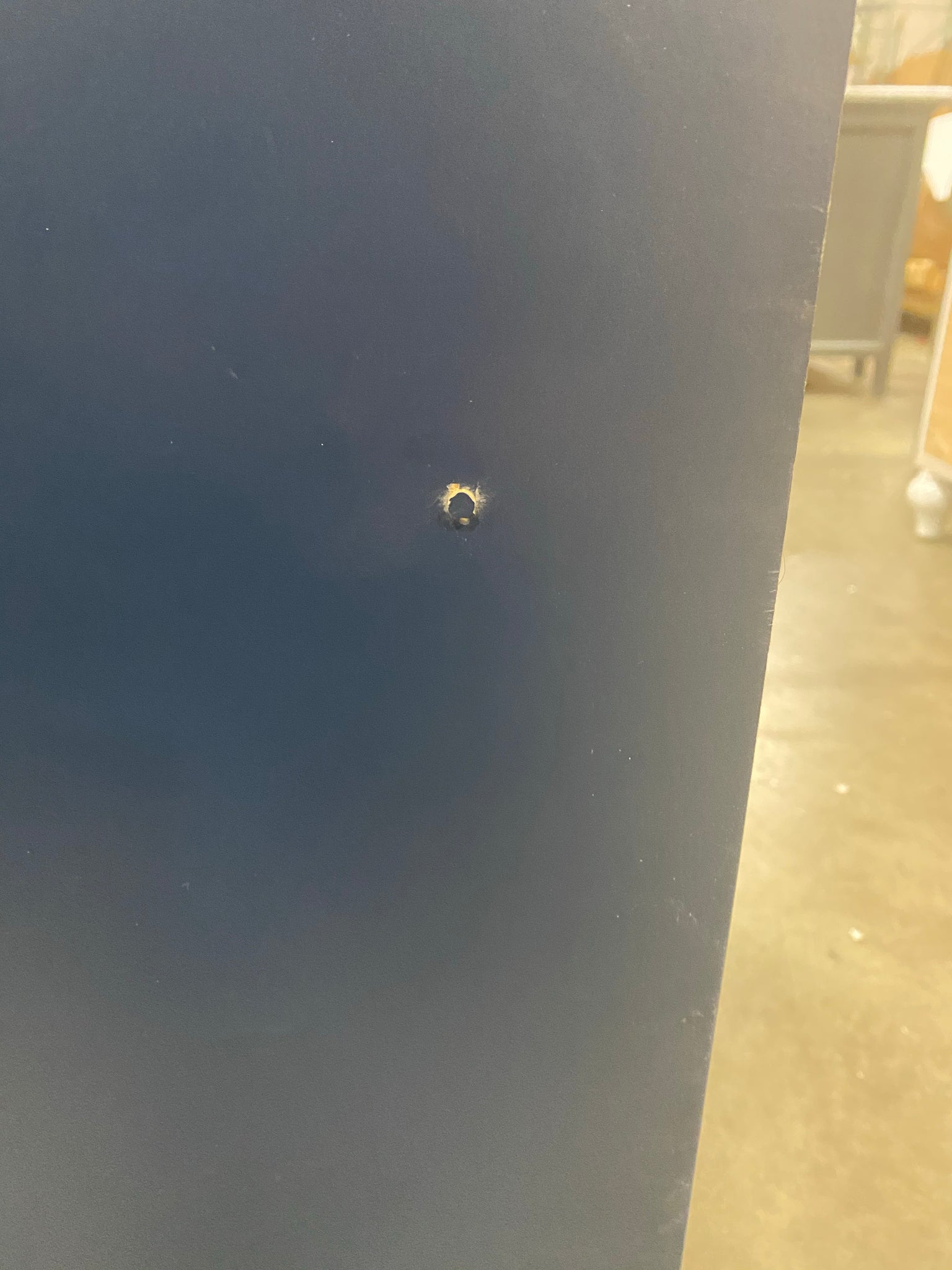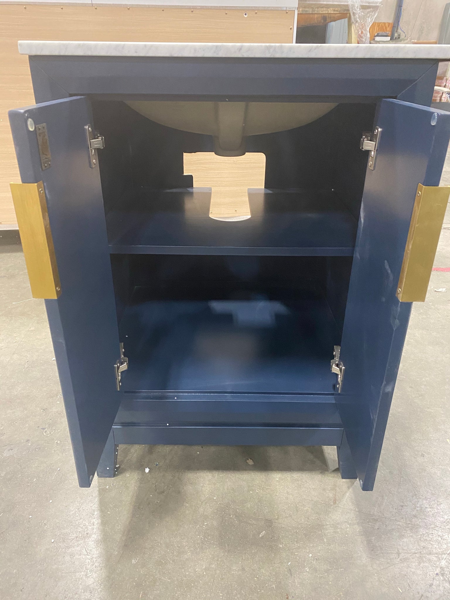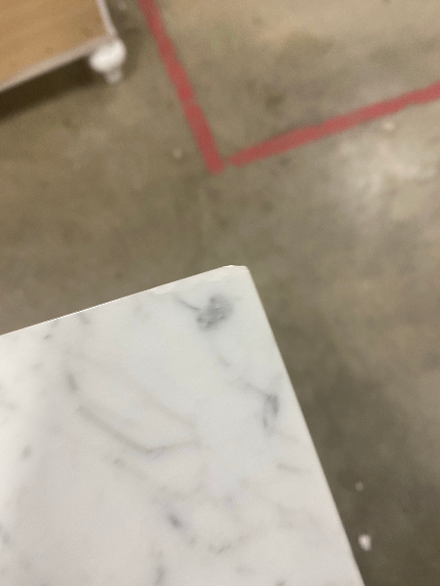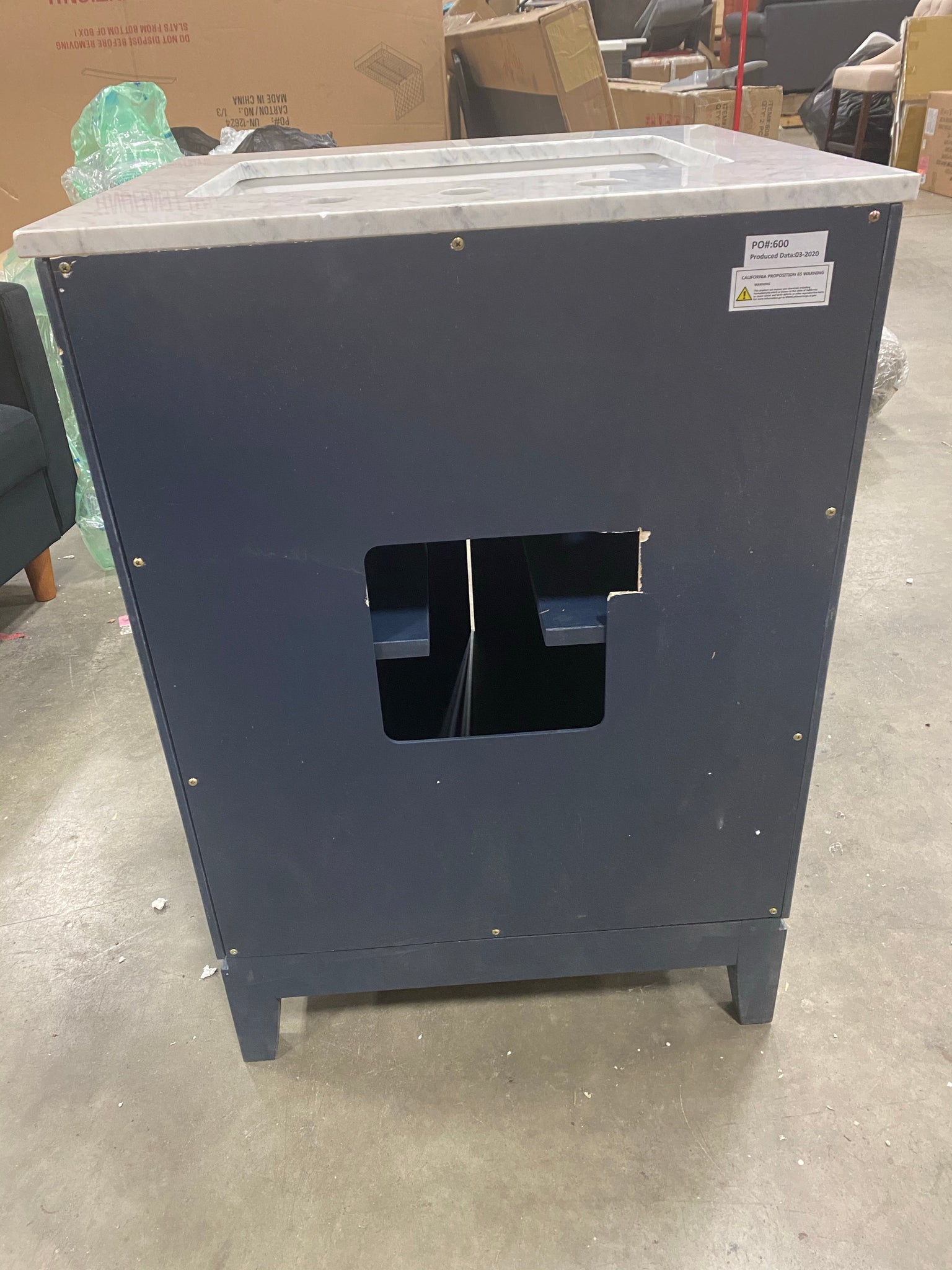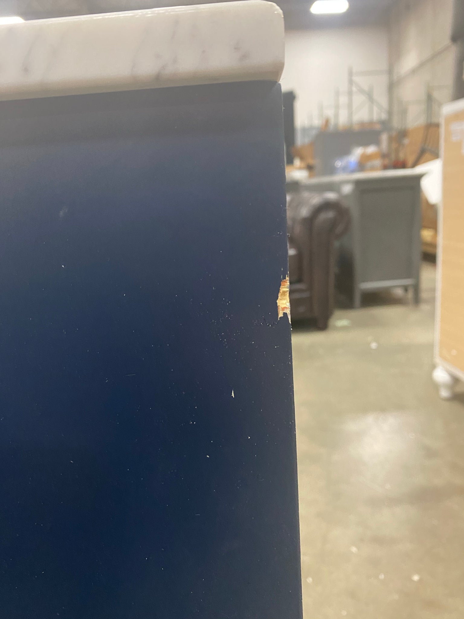 Vanity is overall in great condition, but does have a couple imperfections. One back corner of the sink has a chip, and towards the middle. Left side of the vanity has a couple chipped spots and a bad paint job towards the legs. See all pictures.