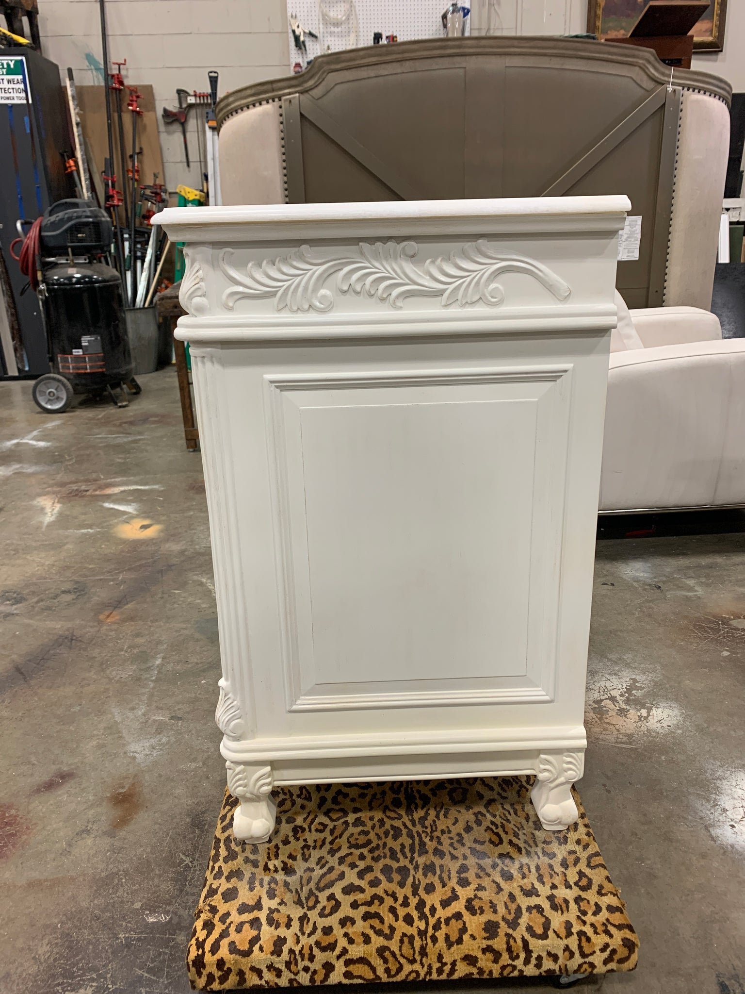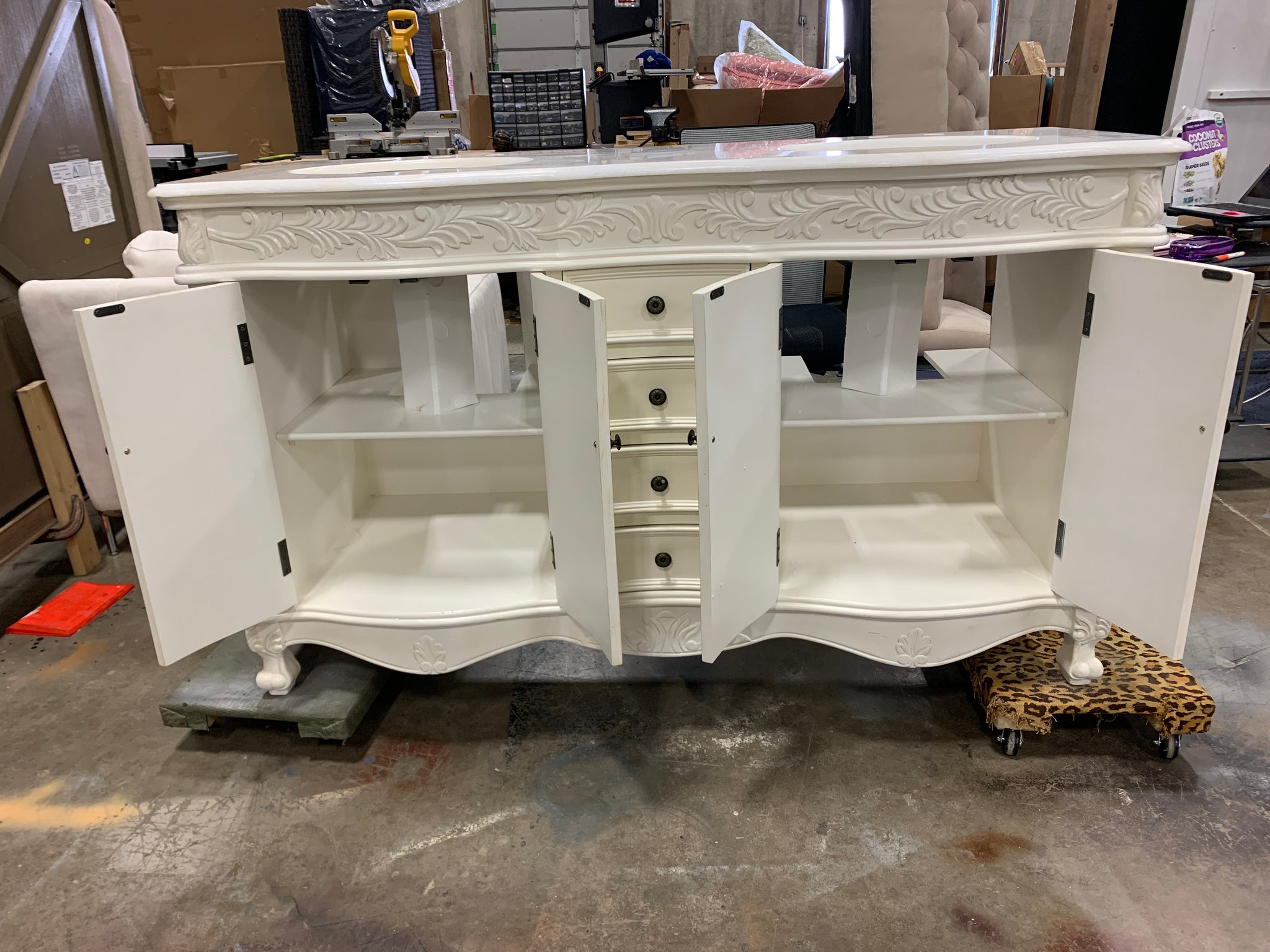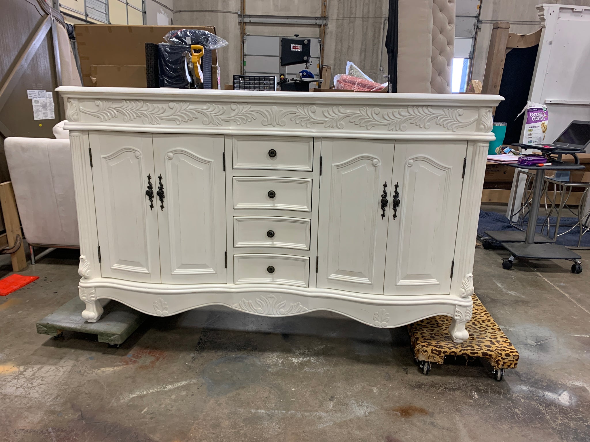 Out of box item. Double vanity made of solid wood, hand-painted with teak finish to compliment the white marble counter top. The oval white porcelain undermount sink pairs perfectly with the distinctively carved and turned solid wood bun feet. This vanity contains 4 drawers and 2 cabinets. Item is fully assembled.