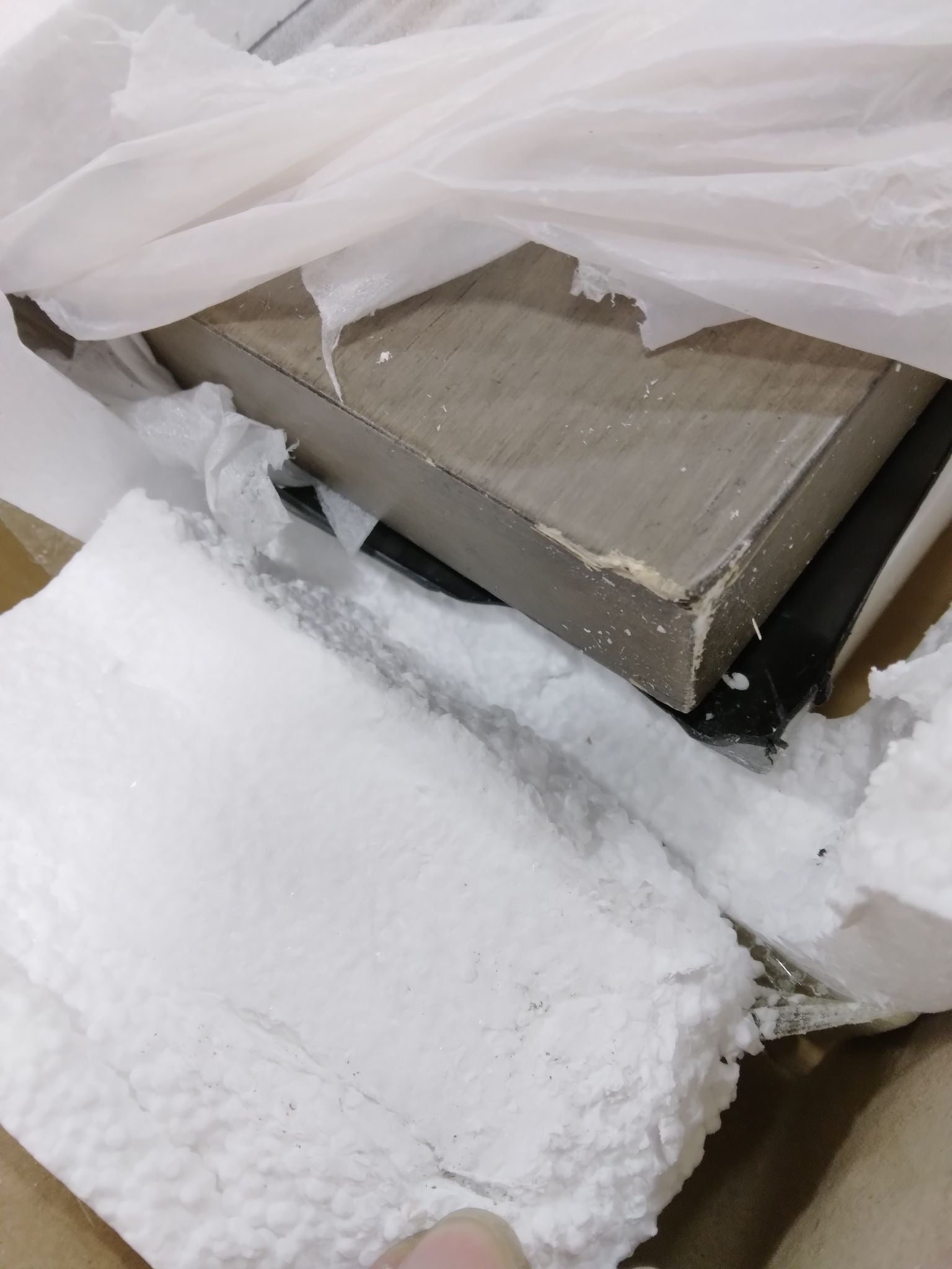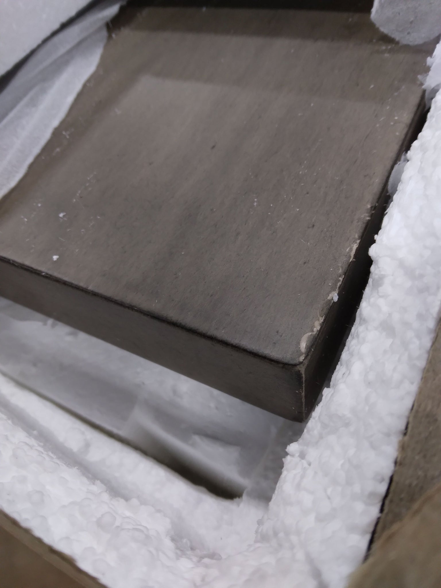 Open box, The color is grey hickory, Size: 60", Slight chipping on a couple of the corners. See for photo