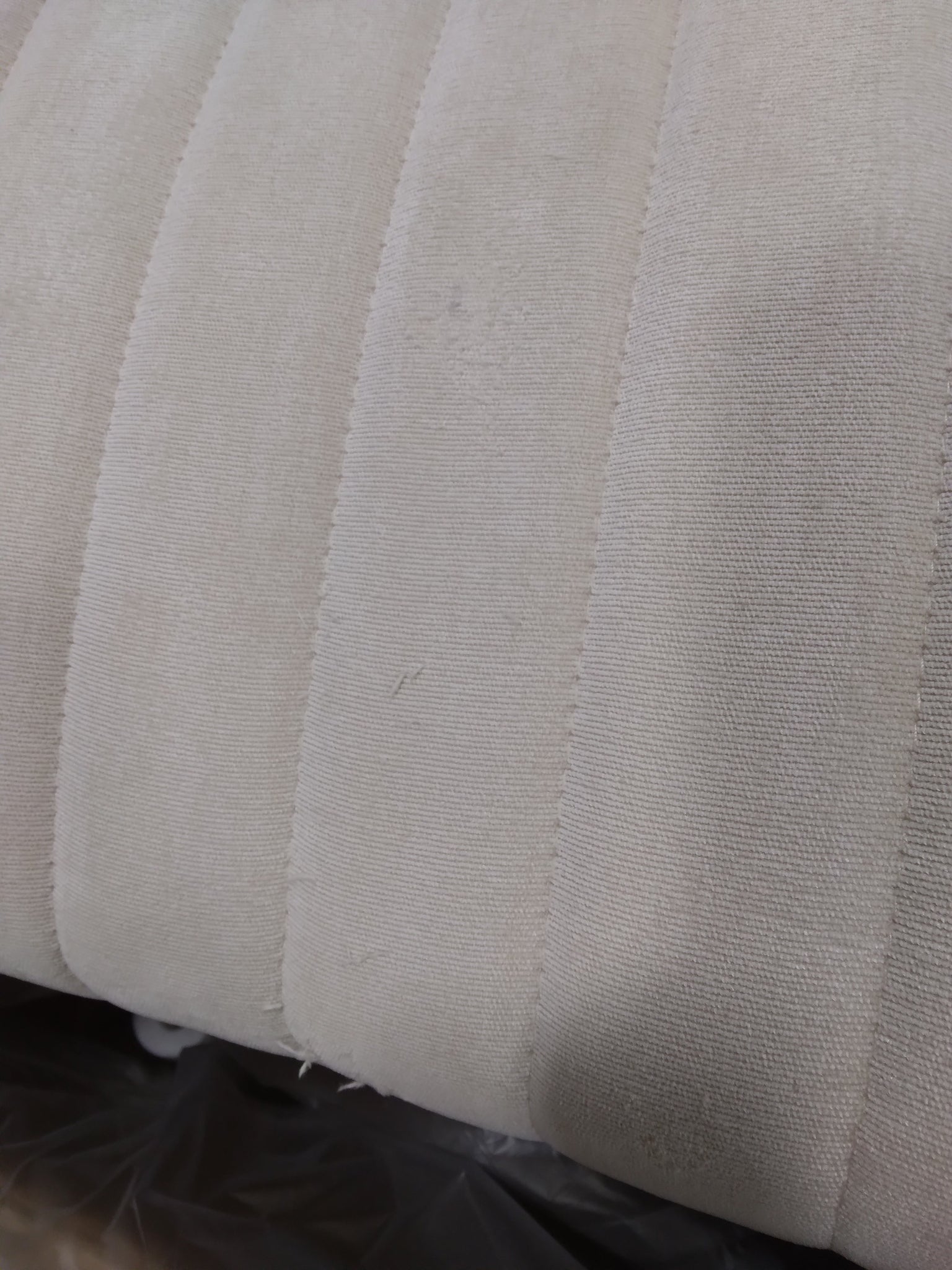 Open Box, The color is beige 100% polyester, Previously opened. There is some material that is rubbing off slightly on the front of the back piece of the chair. See for photo.