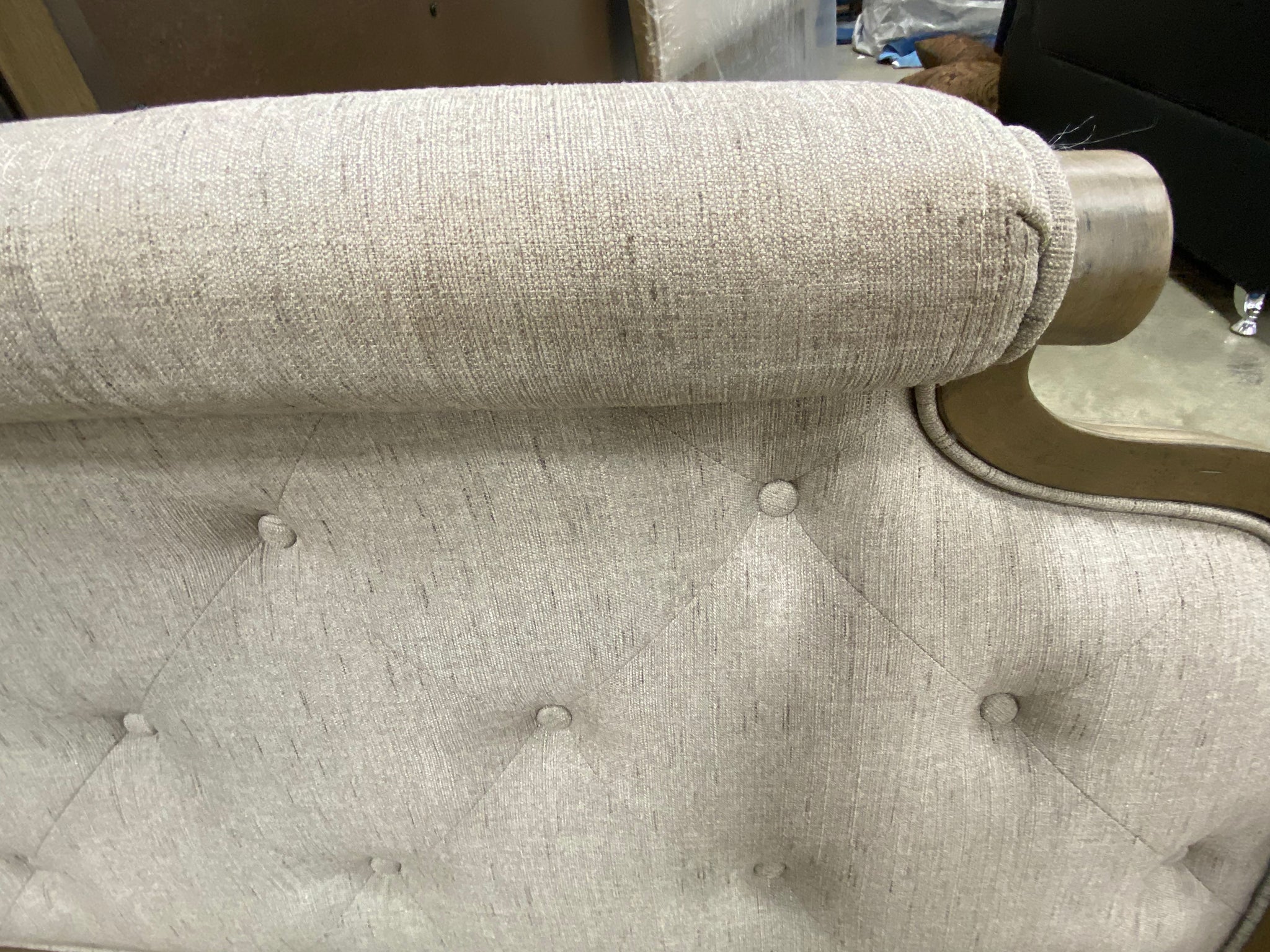 Note: AS IS Condition: Headboard/Footboard ONLY; side rails and bed slats NOT included. Please Note: Item has some very slight scuffing on edges of headboard/footboard sides due to open shipment. Light spotting on top edge of footboard upholstery. See photos. Items in otherwise good condition.