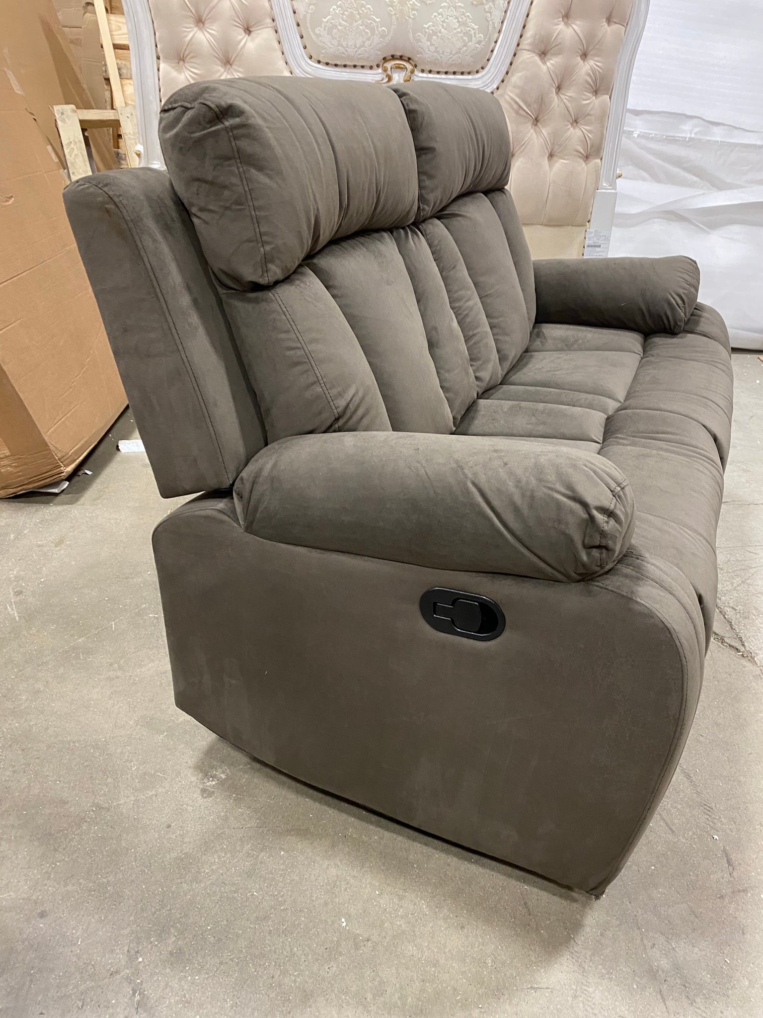 2 piece manual reclining living room set in Brown microfiber. Set includes 1 sofa/1 loveseat. Items are both in great condtion.