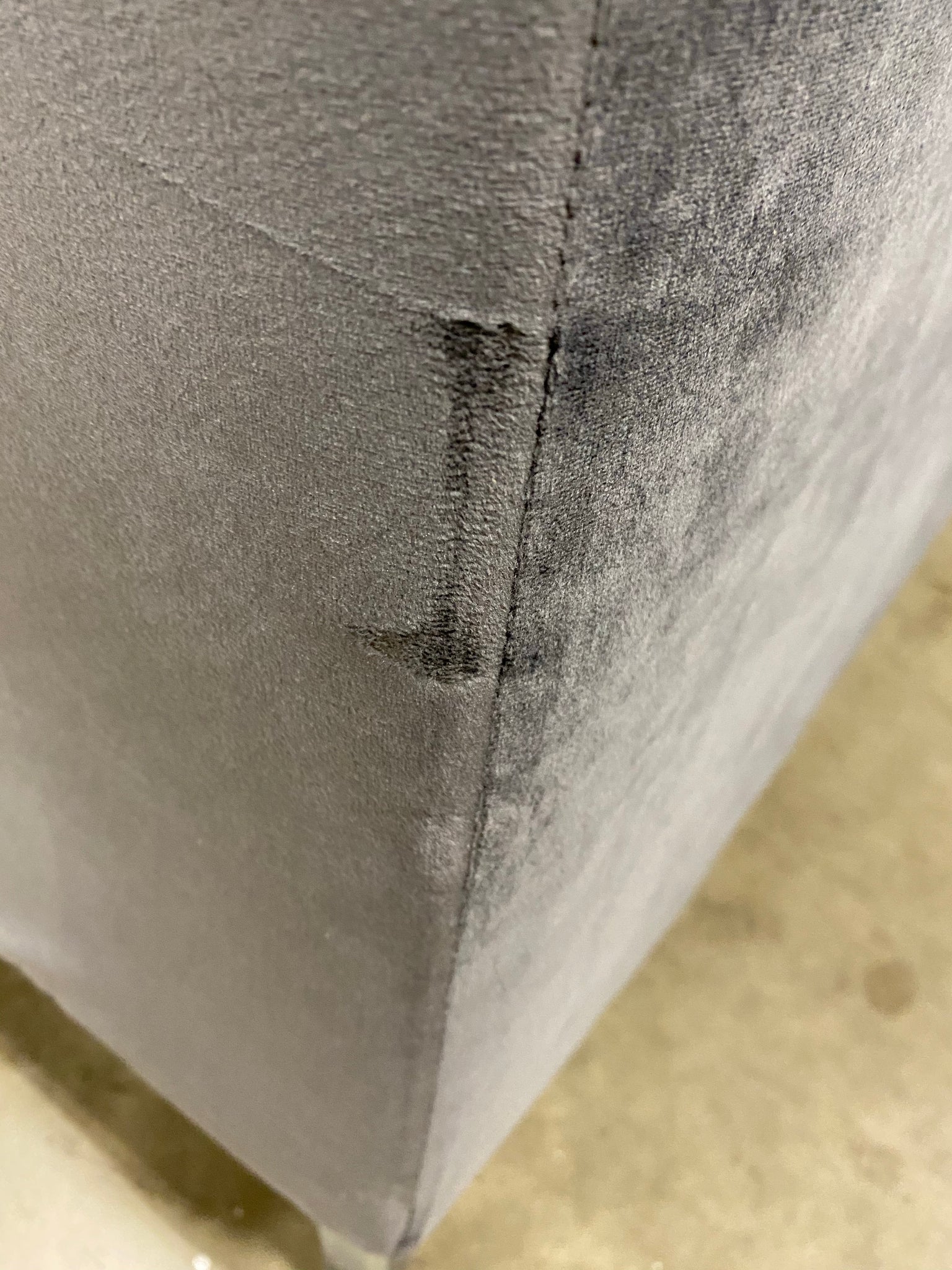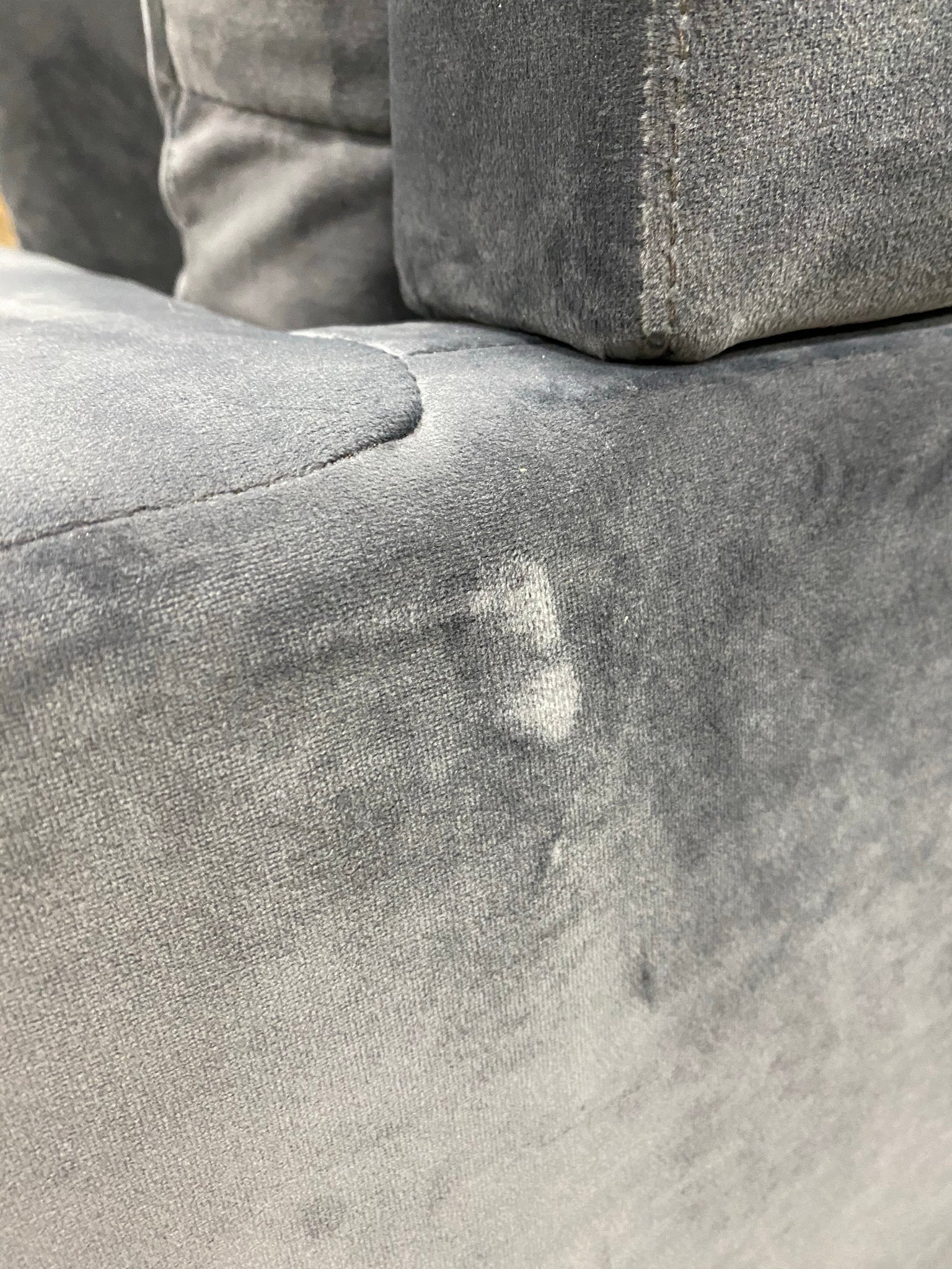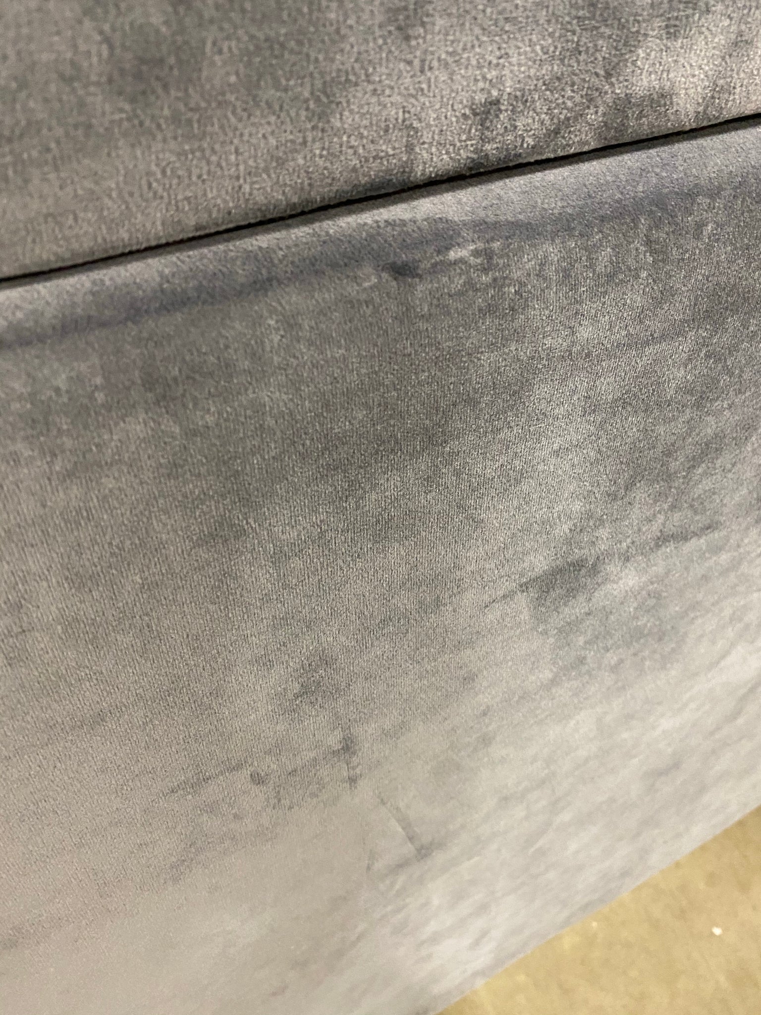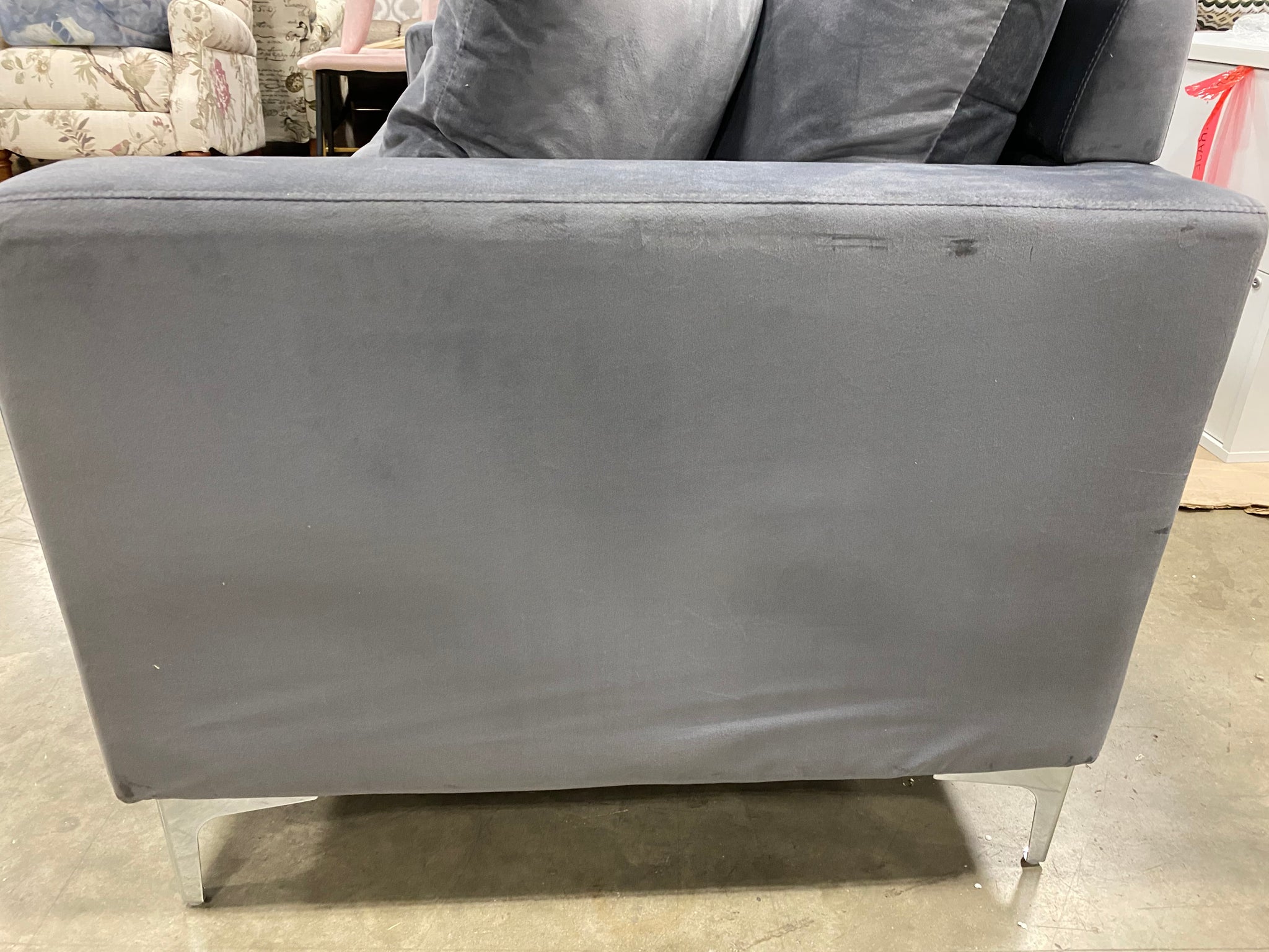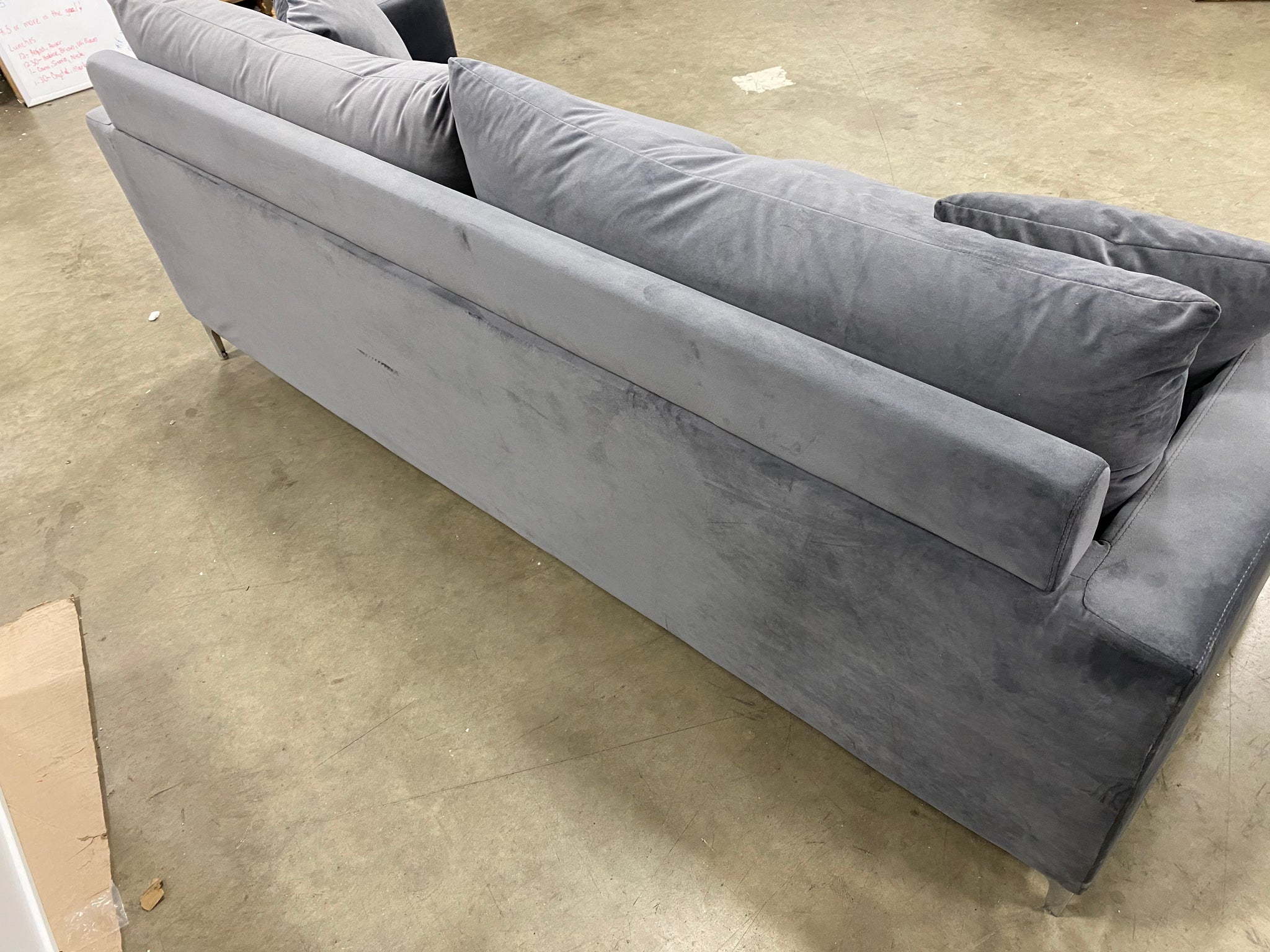 Out of box velvet sofa in Gray. Assembled. Chrome legs only.