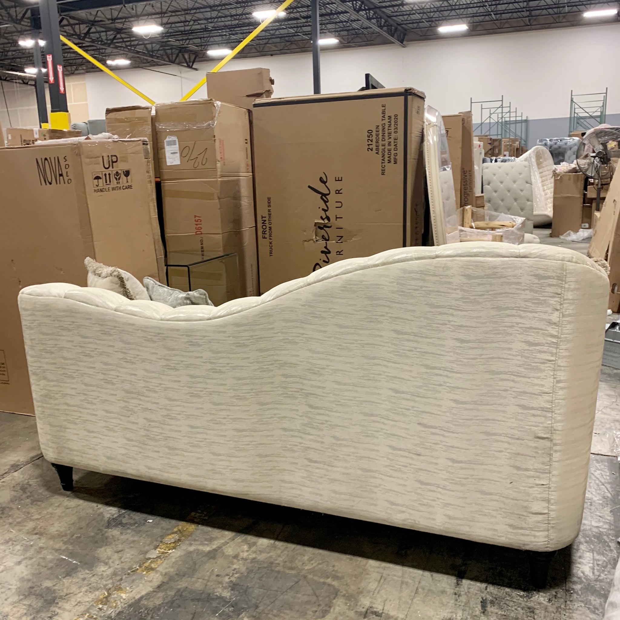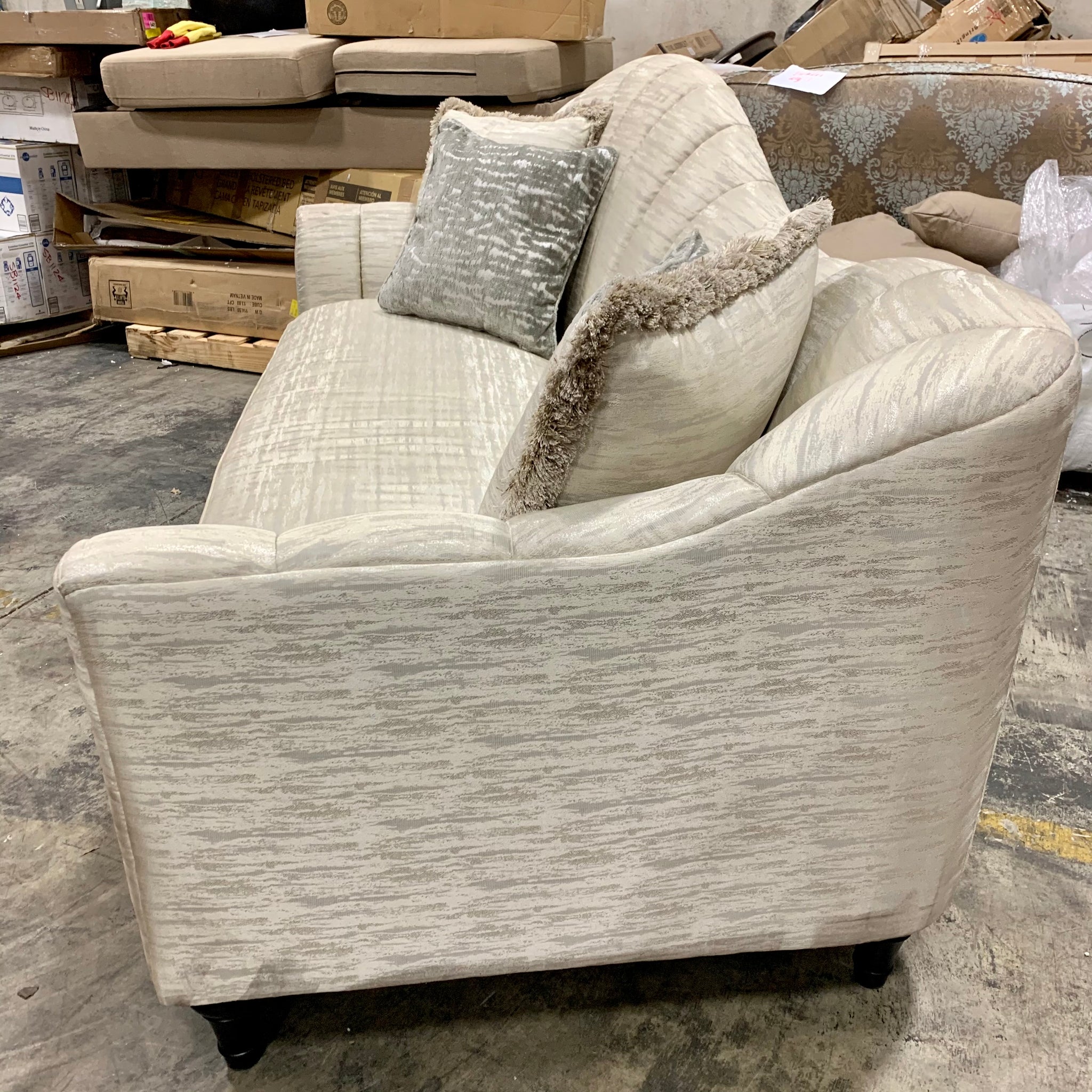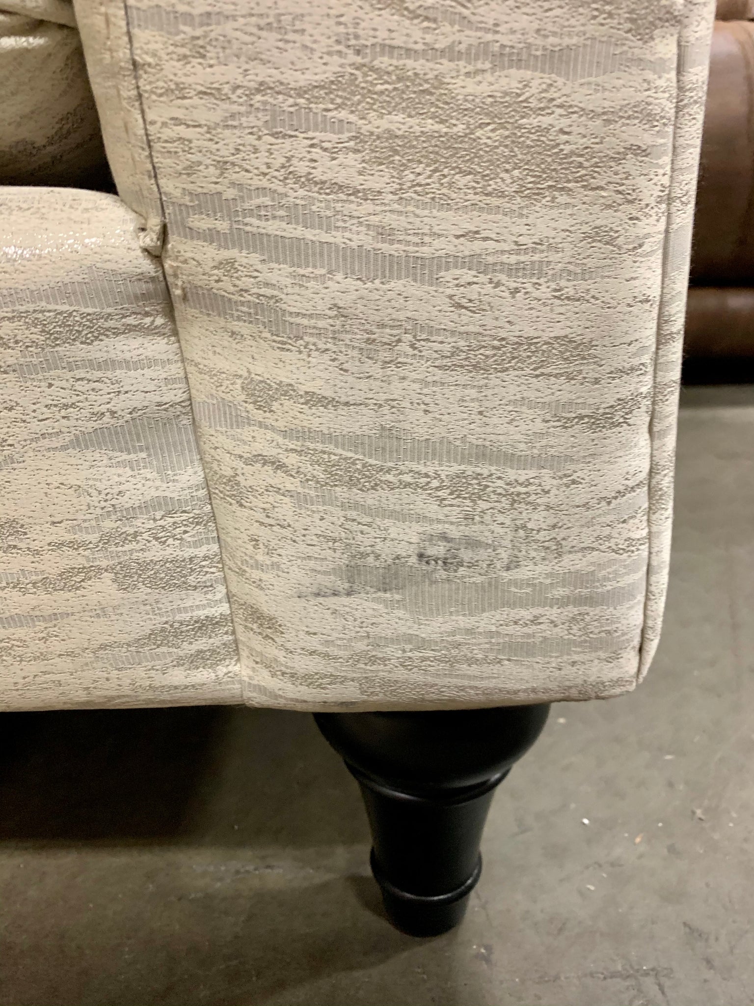 Fully assembled flared arm sofa upholstered in 100% polyester in metallic tan/gray with solid wood legs in an espresso finish. This item has reversible and removable seat cushions and also includes the toss pillows. Item does have a few minor cosmetic blemishes due to open shipment (see photos for reference) but otherwise appears to be in great condition.