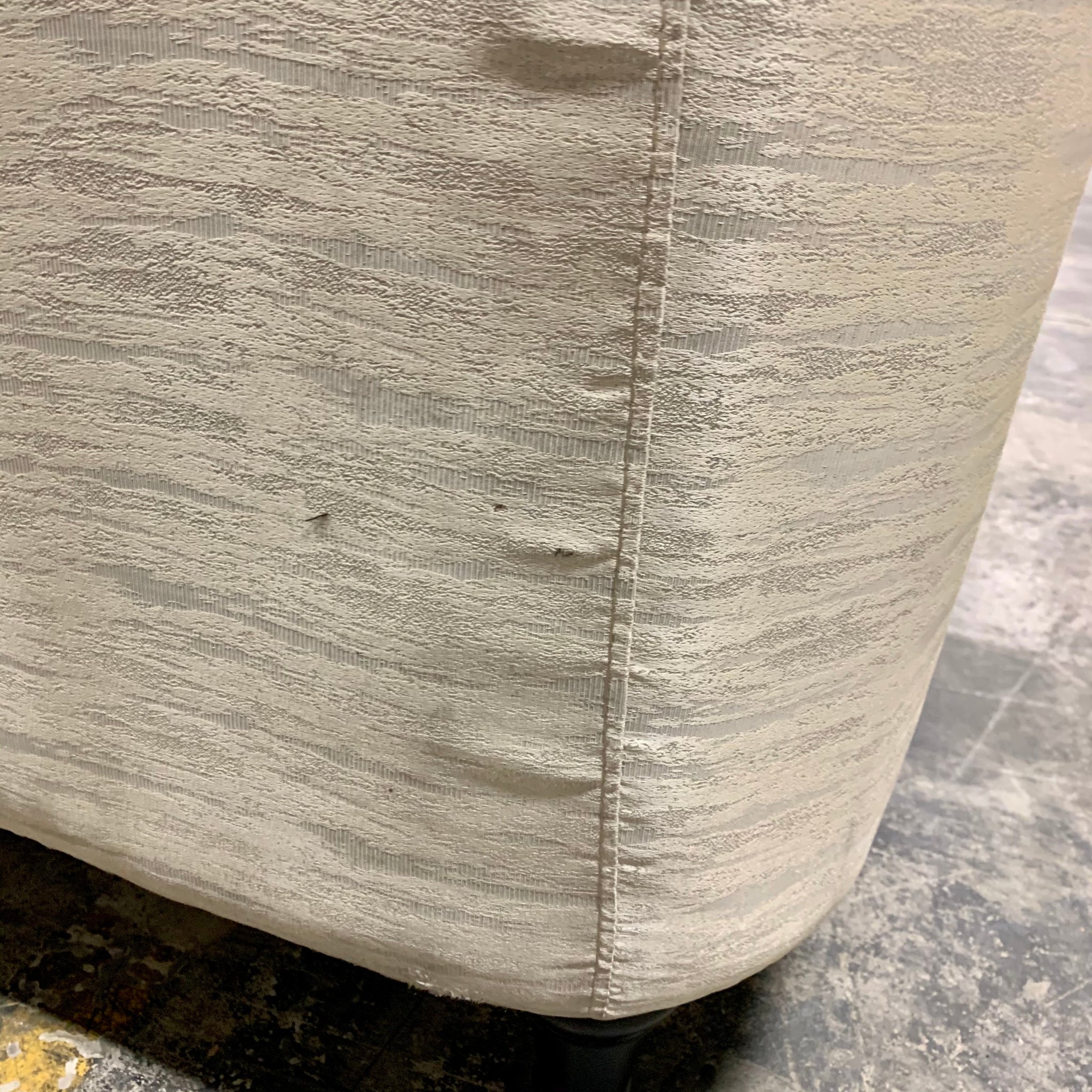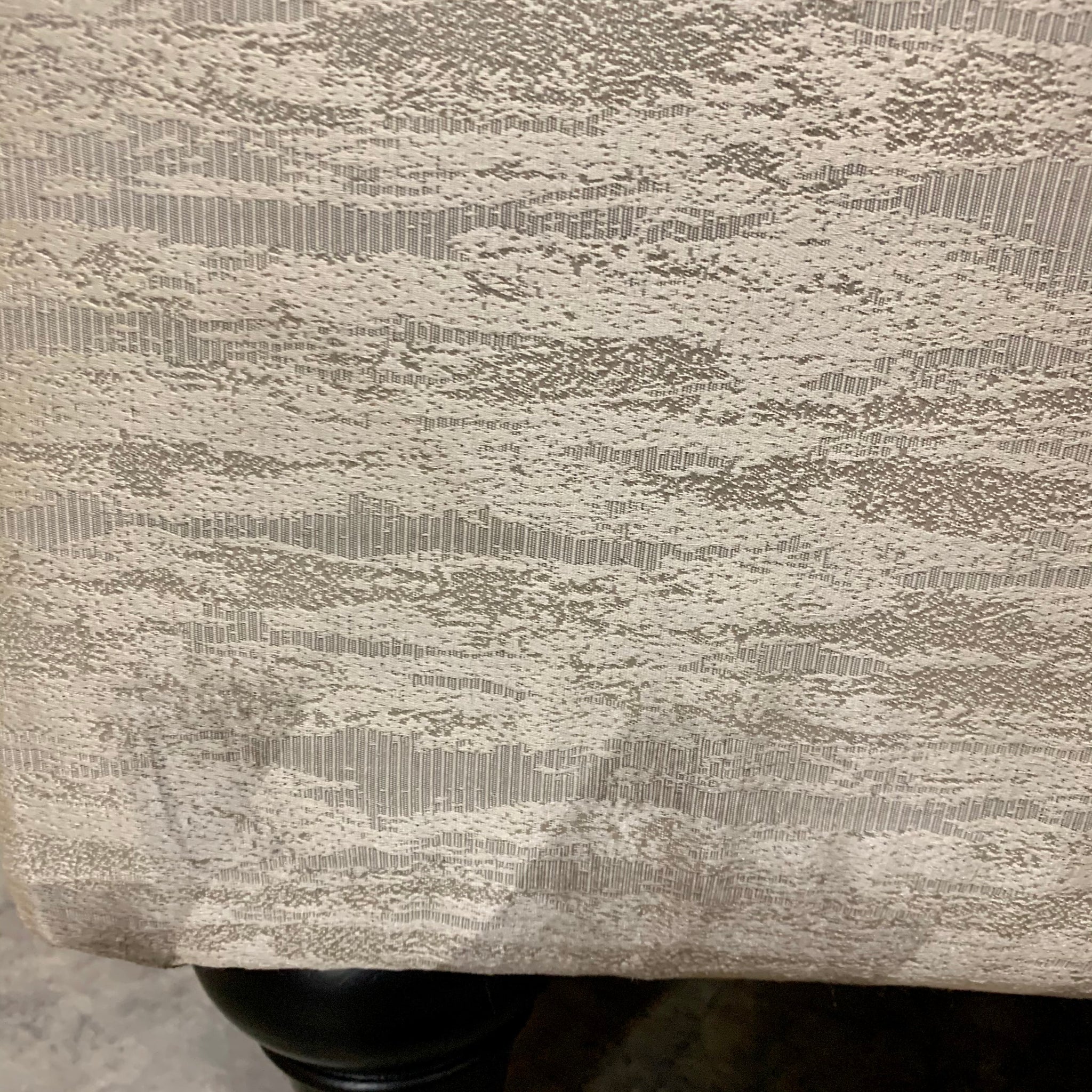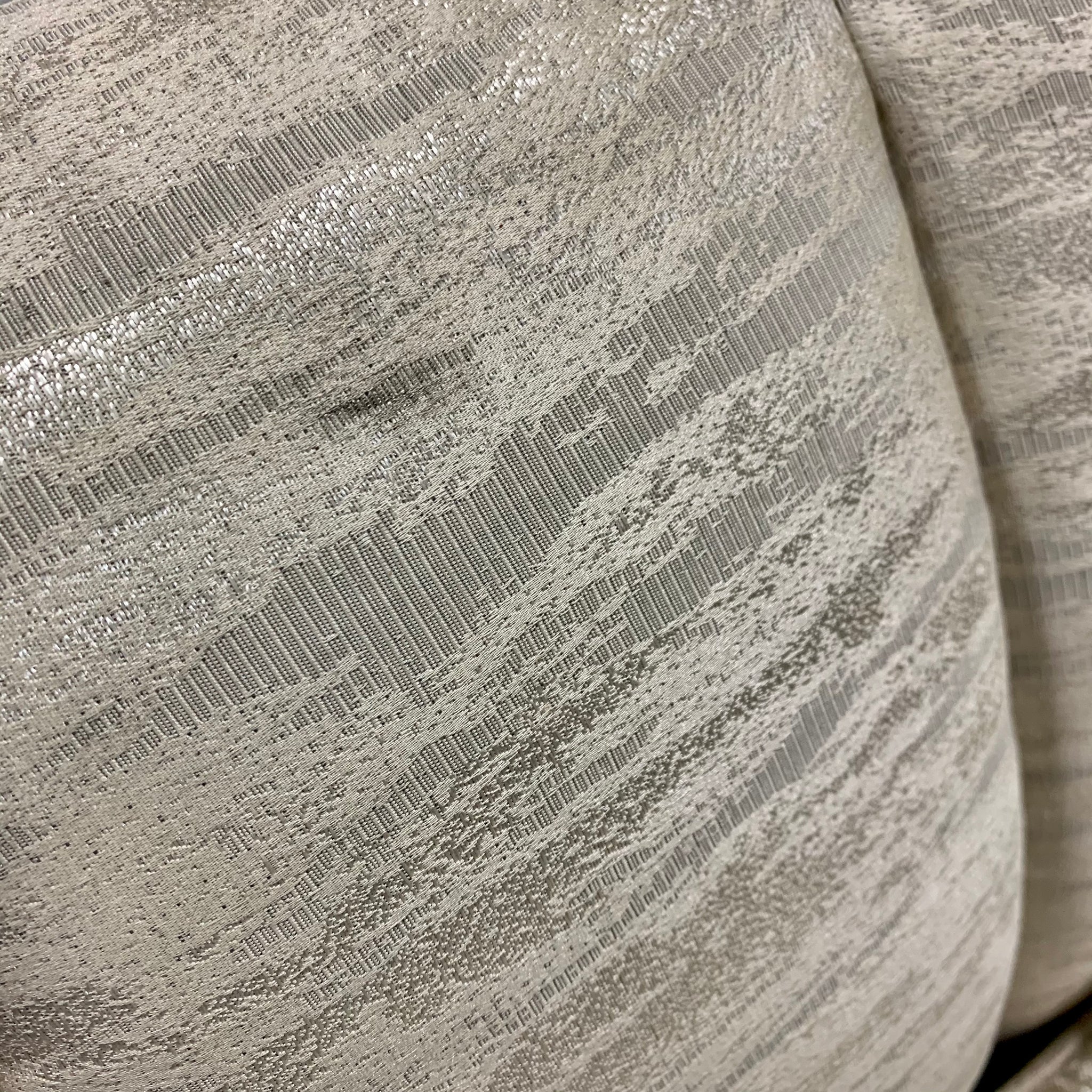 Fully assembled flared arm sofa upholstered in 100% polyester in metallic tan/gray with solid wood legs in an espresso finish. This item has reversible and removable seat cushions and also includes the toss pillows. Item does have a few minor cosmetic blemishes due to open shipment (see photos for reference) but otherwise appears to be in great condition.