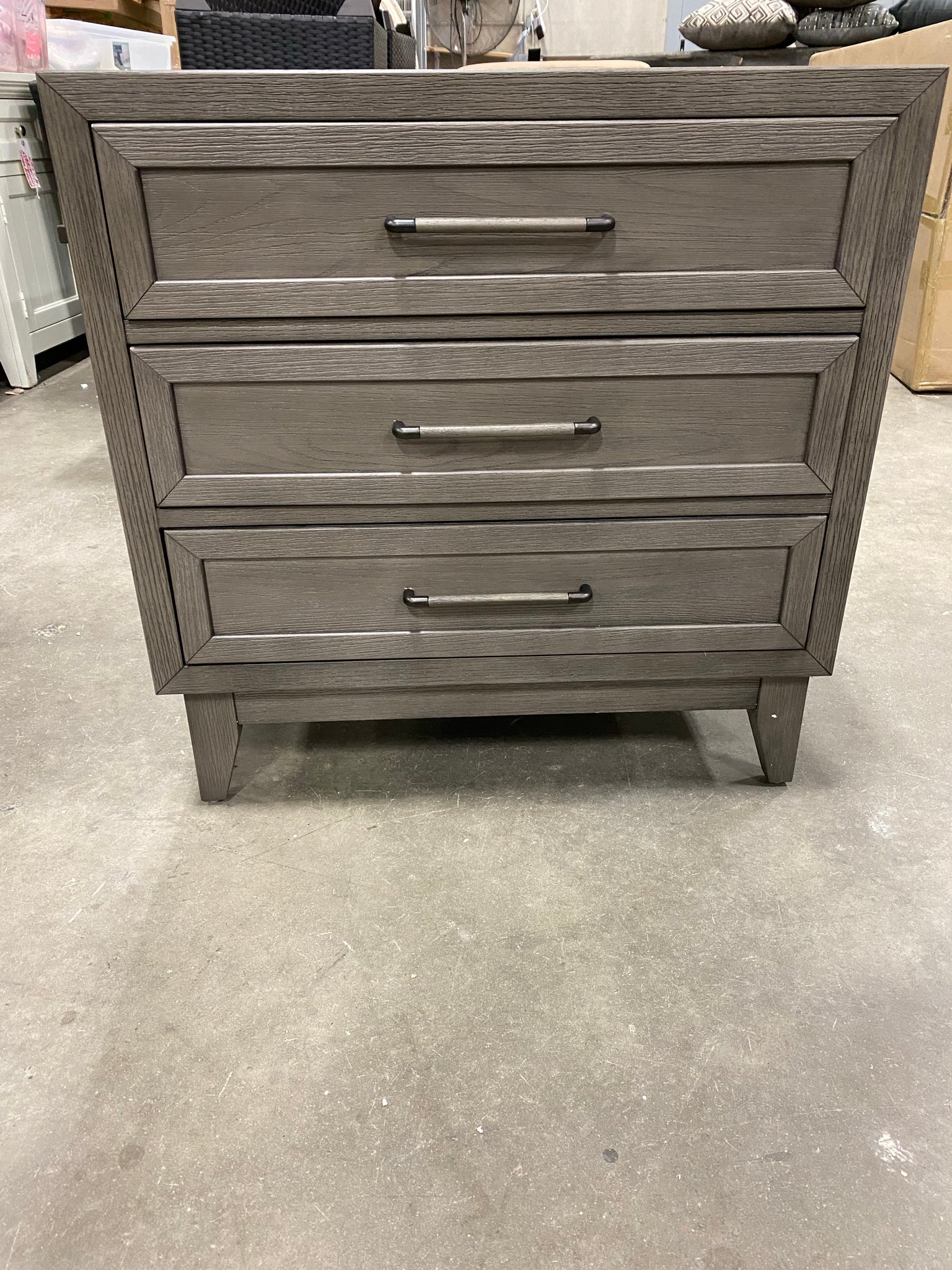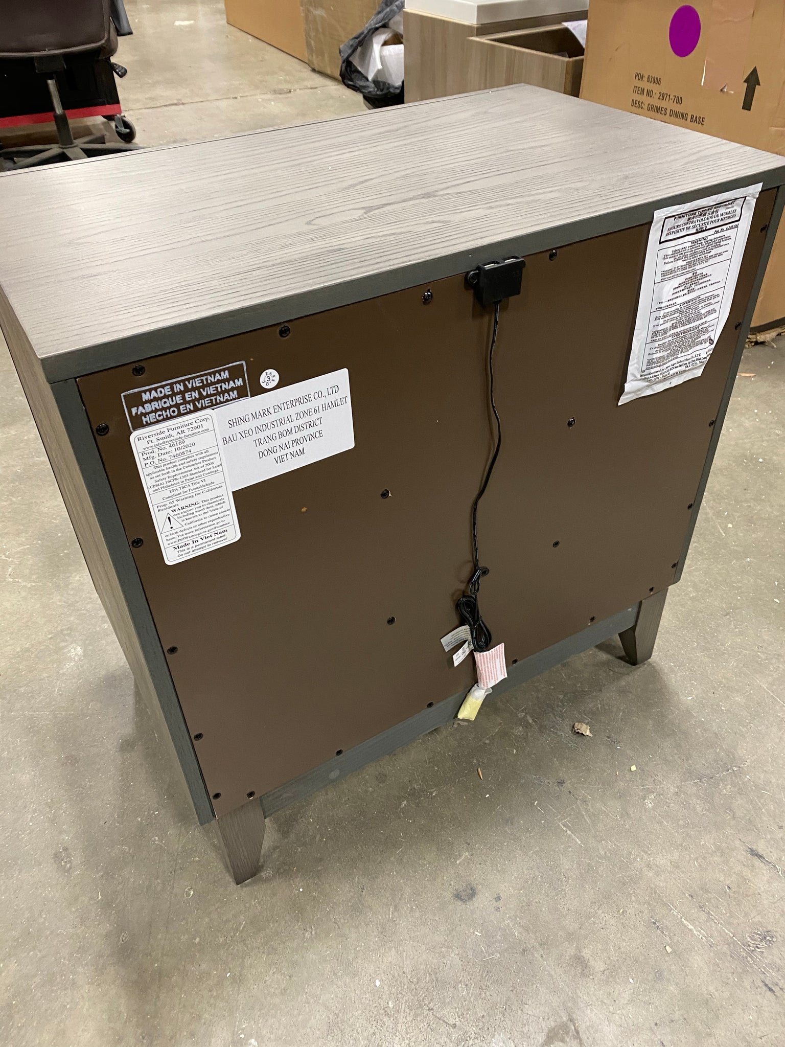 3 Drawer nightstand with USB plugs in Gray Wash. Item appears in excellent condition.