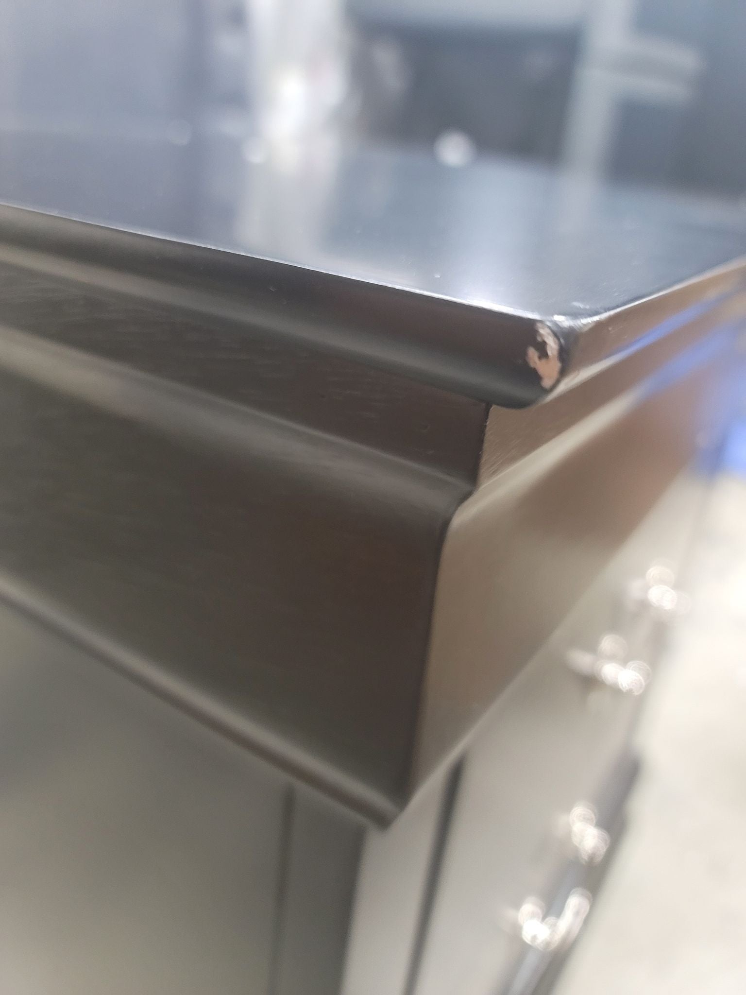 Out of box, the color is Black, Small chip on front corners. Good condition otherwise.