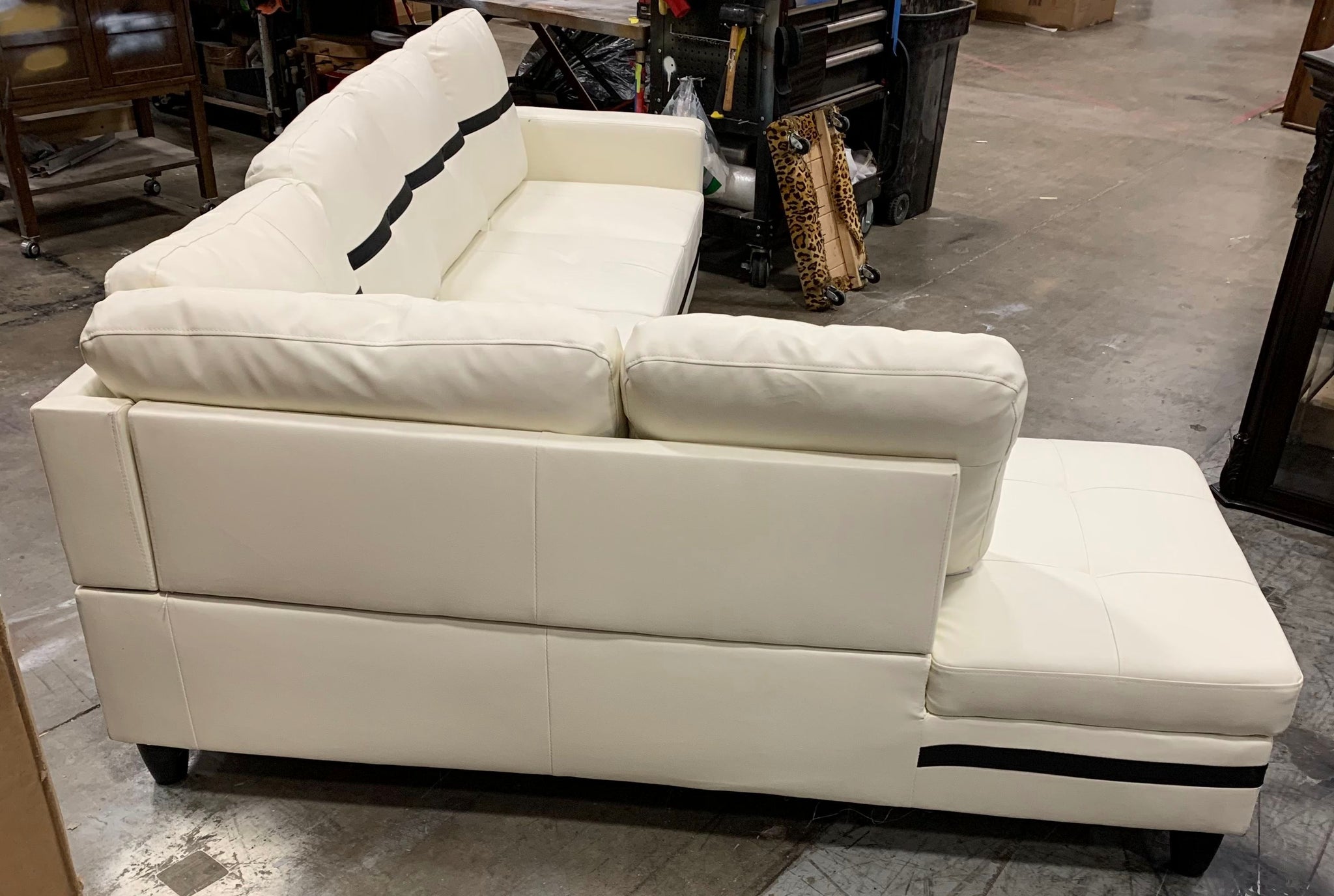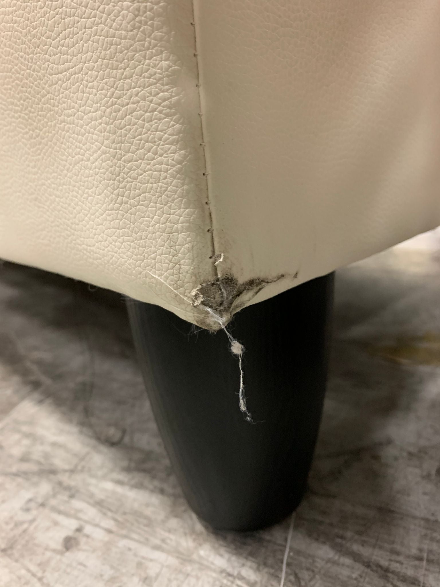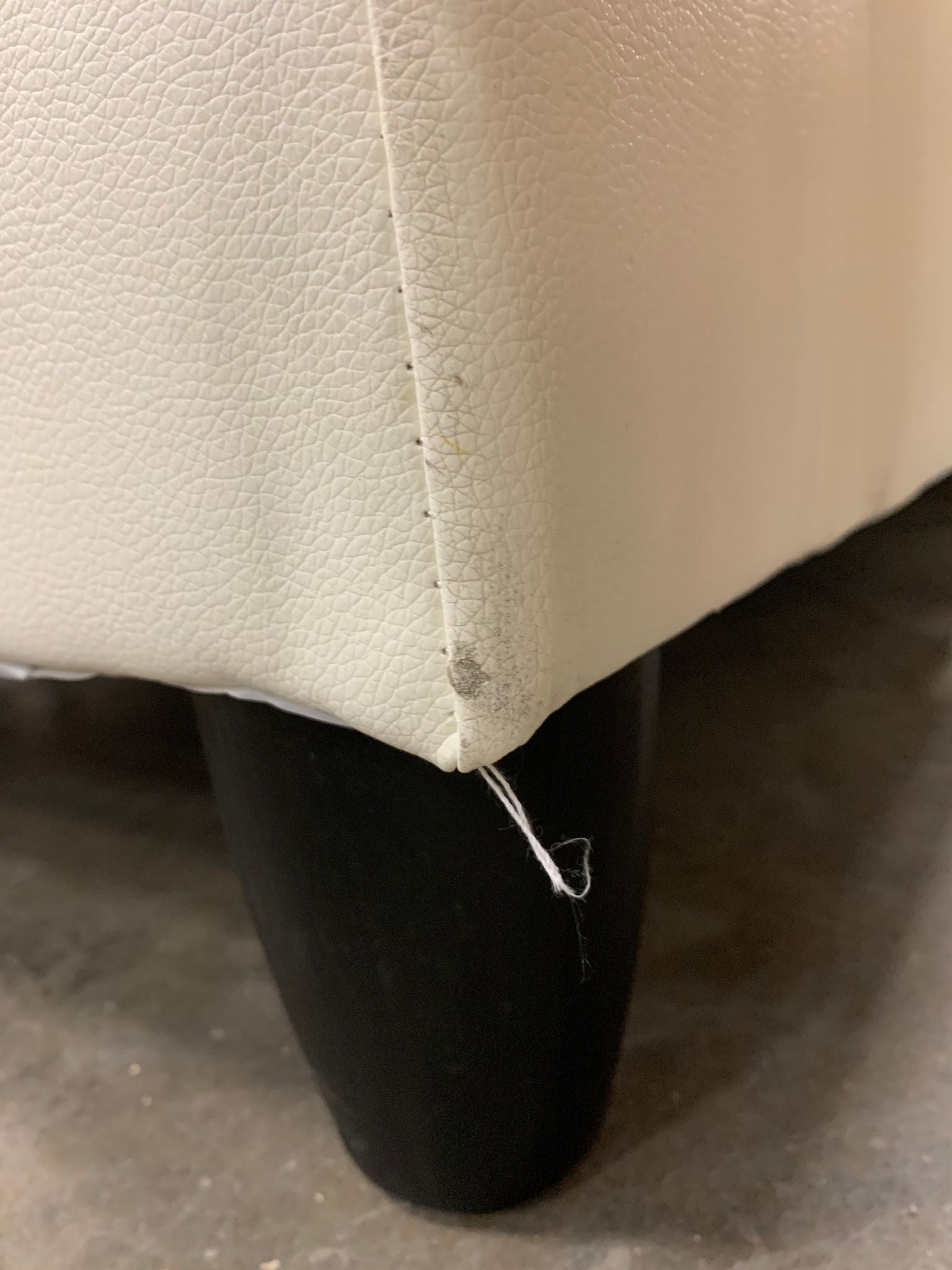 Out of box, The color is white faux leather, item is out of box and is in fair condition. It has slight tears/snags in the leather. Photos of damage included. Item is supposed to come with a storage ottoman, but ottoman is NOT included. Pillows are also NOT included.