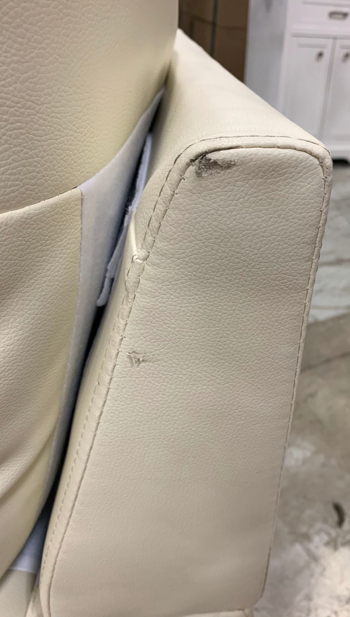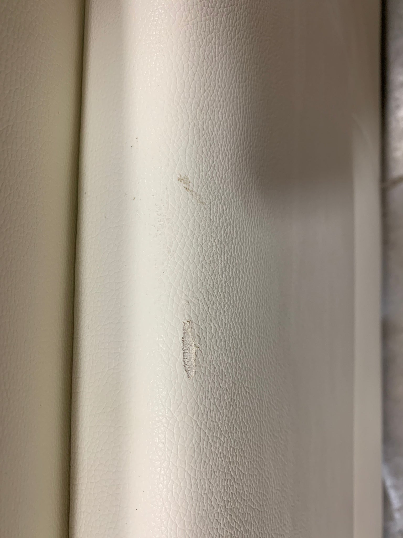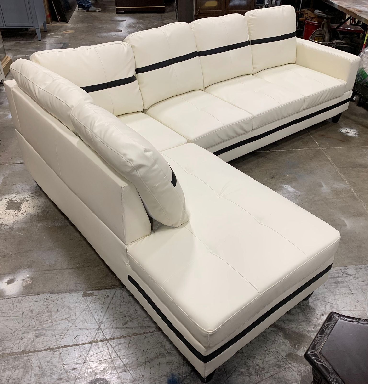 Out of box, The color is white faux leather, item is out of box and is in fair condition. It has slight tears/snags in the leather. Photos of damage included. Item is supposed to come with a storage ottoman, but ottoman is NOT included. Pillows are also NOT included.