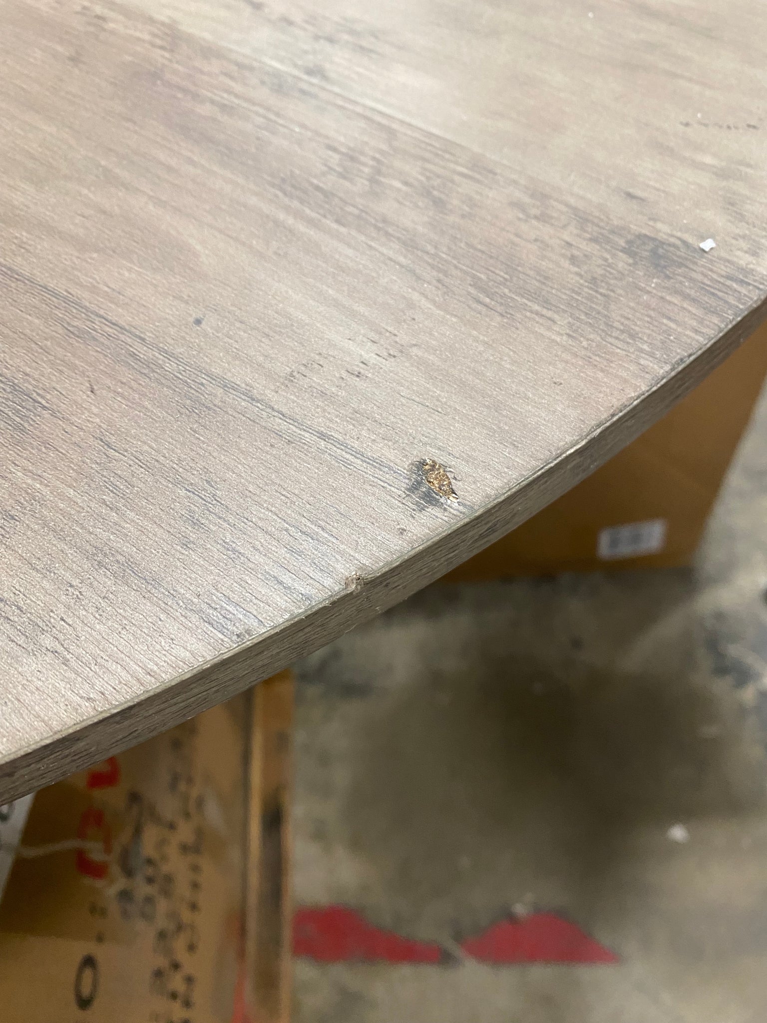 Note: AS IS Condition: Slight scratches/damage on table top. Screws/feet missing. See photos.