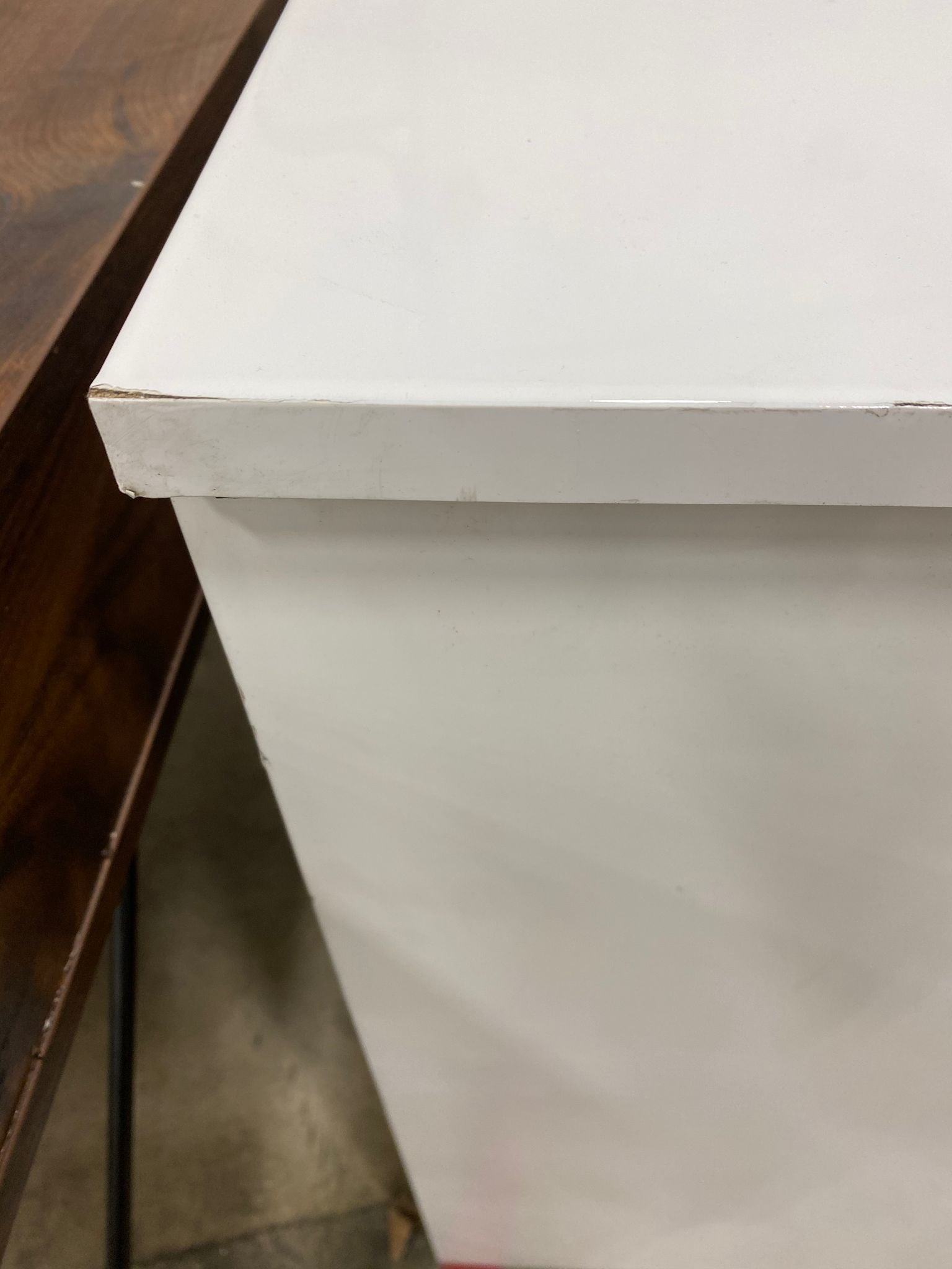 Out of box, The color is chrome, Slight dings on all 4 corners of top.