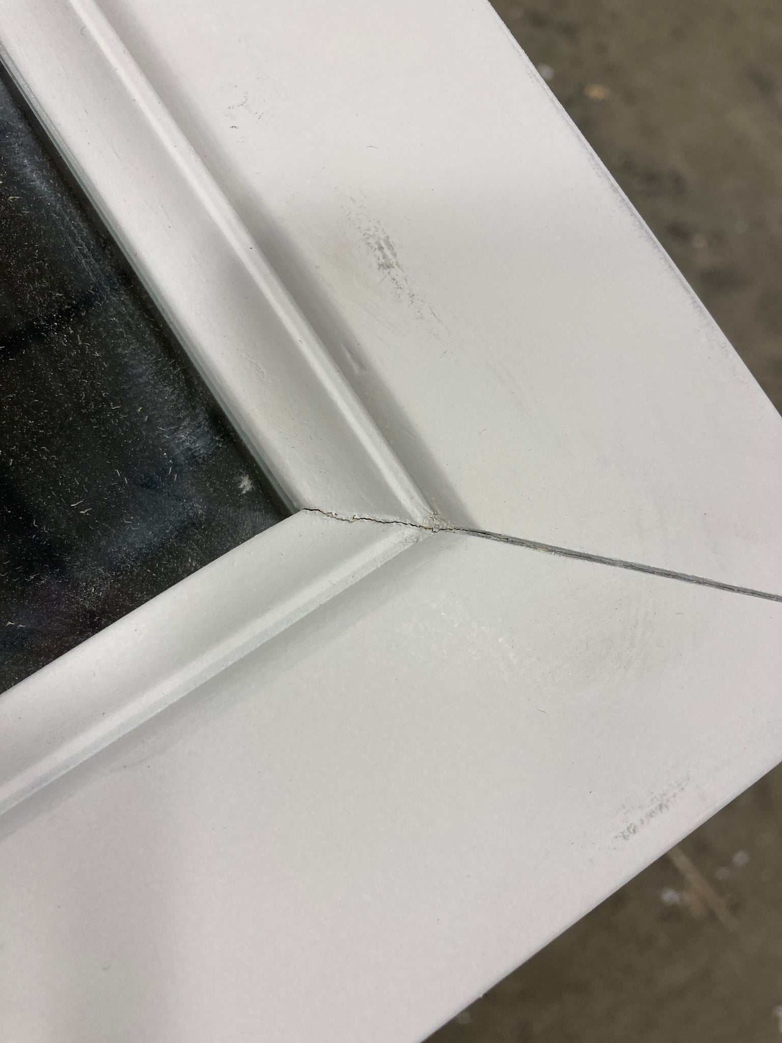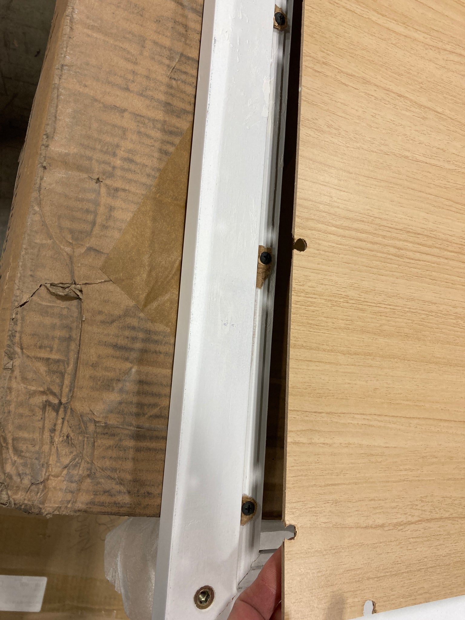 Item is in AS IS condition: Minor wear on White frame. Back panel is detached from screw heads, and would require fixing. Please see pictures for details.