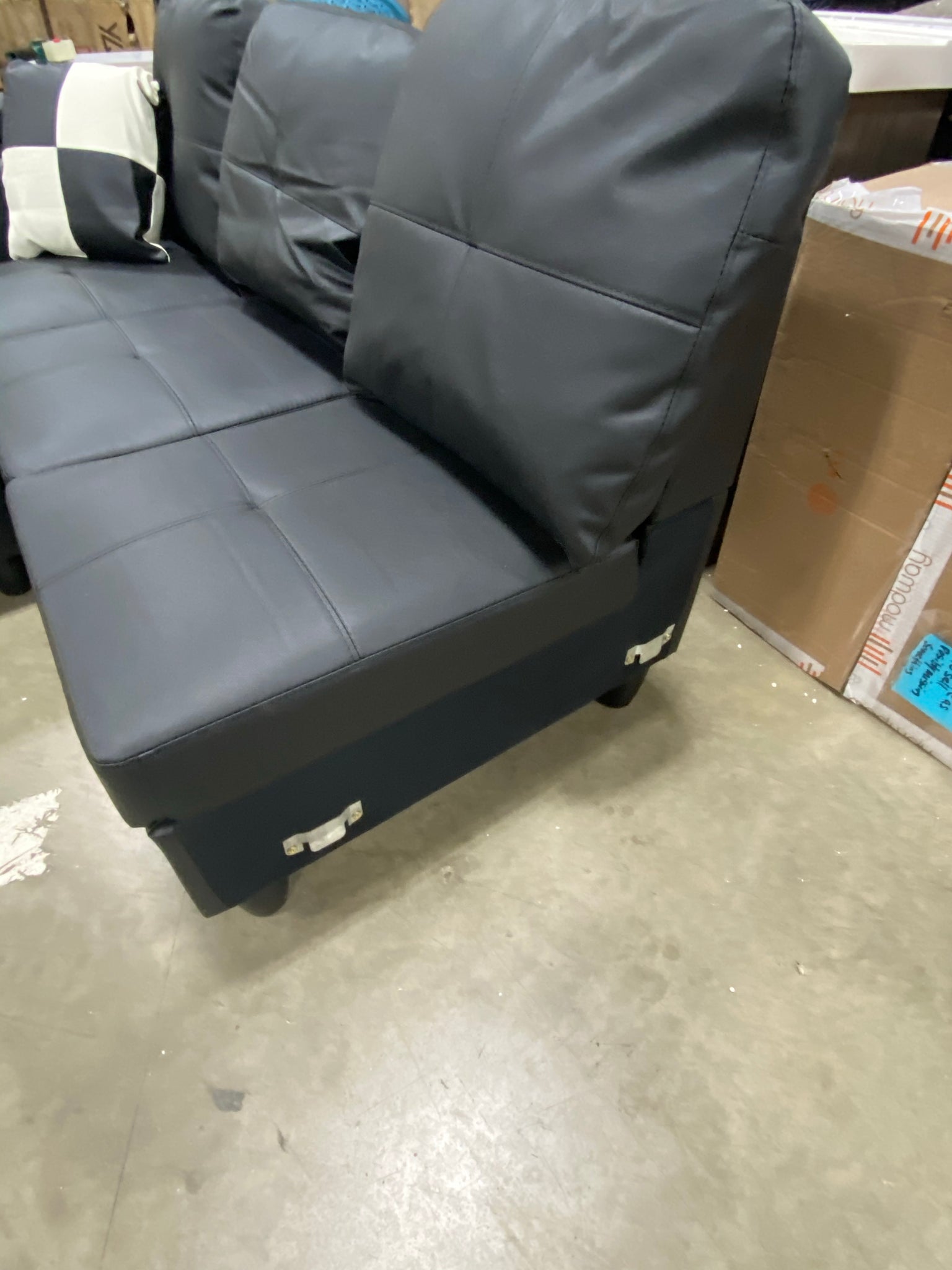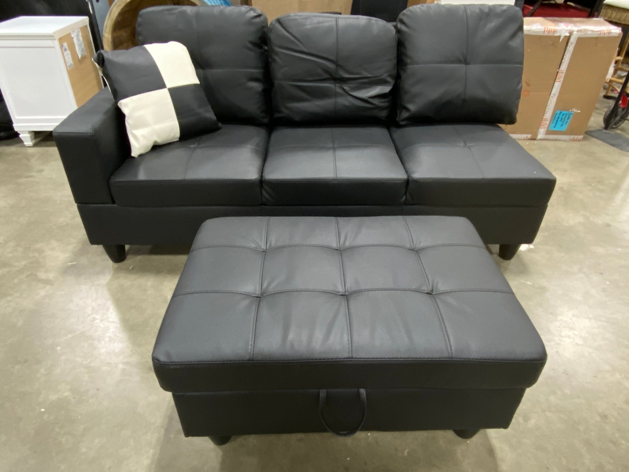 1 Faux leather 3 seat sofa sectional piece with storage ottoman in Black. Comes with 1 coordinating throw.
