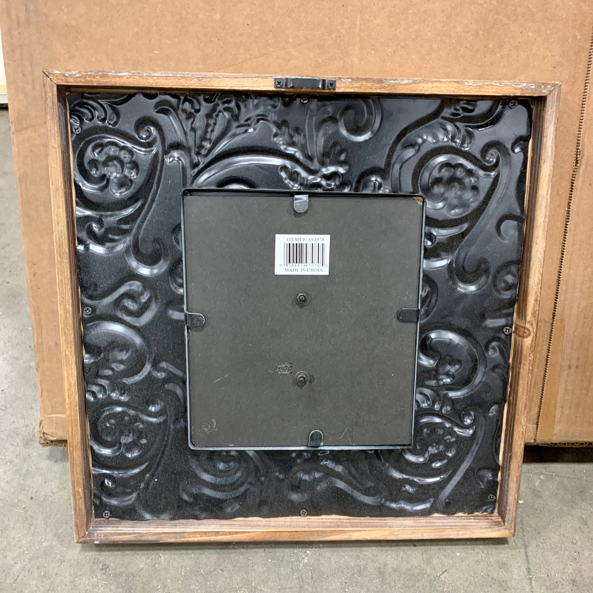 Out of box item. Handmade wall decor with distressed metal and wood. Wall mounting hardware is included.